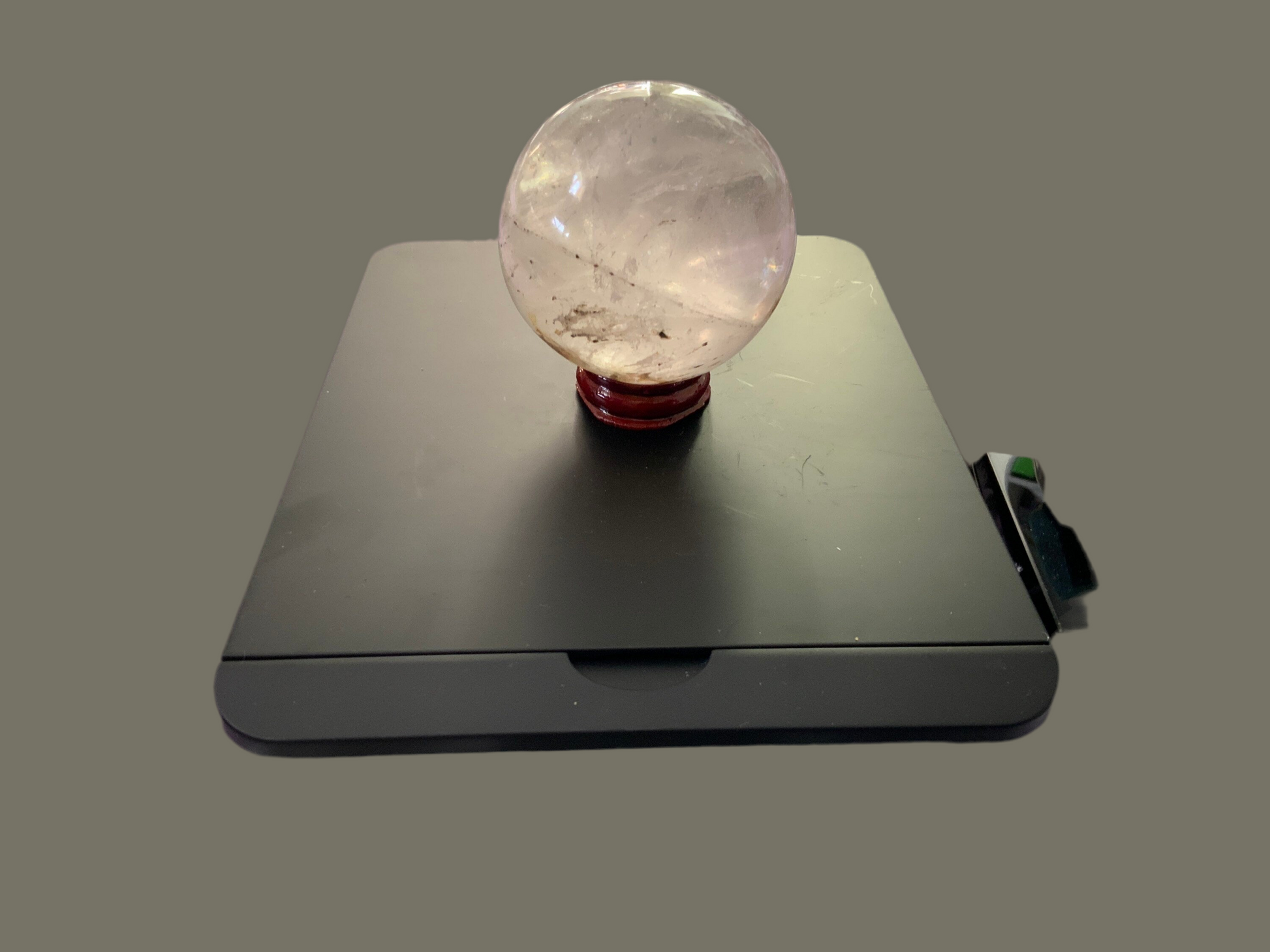 Clear Quartz crystal ball/sphere is 15.5 oz without the stand and 15.6 oz with the wooden stand sphere. It measures approximately 2.25” in diameter. There are several photos showing multiple views of this magical crystal ball. This crystal has one minor defect shown in pictures. Please see all photos for details.