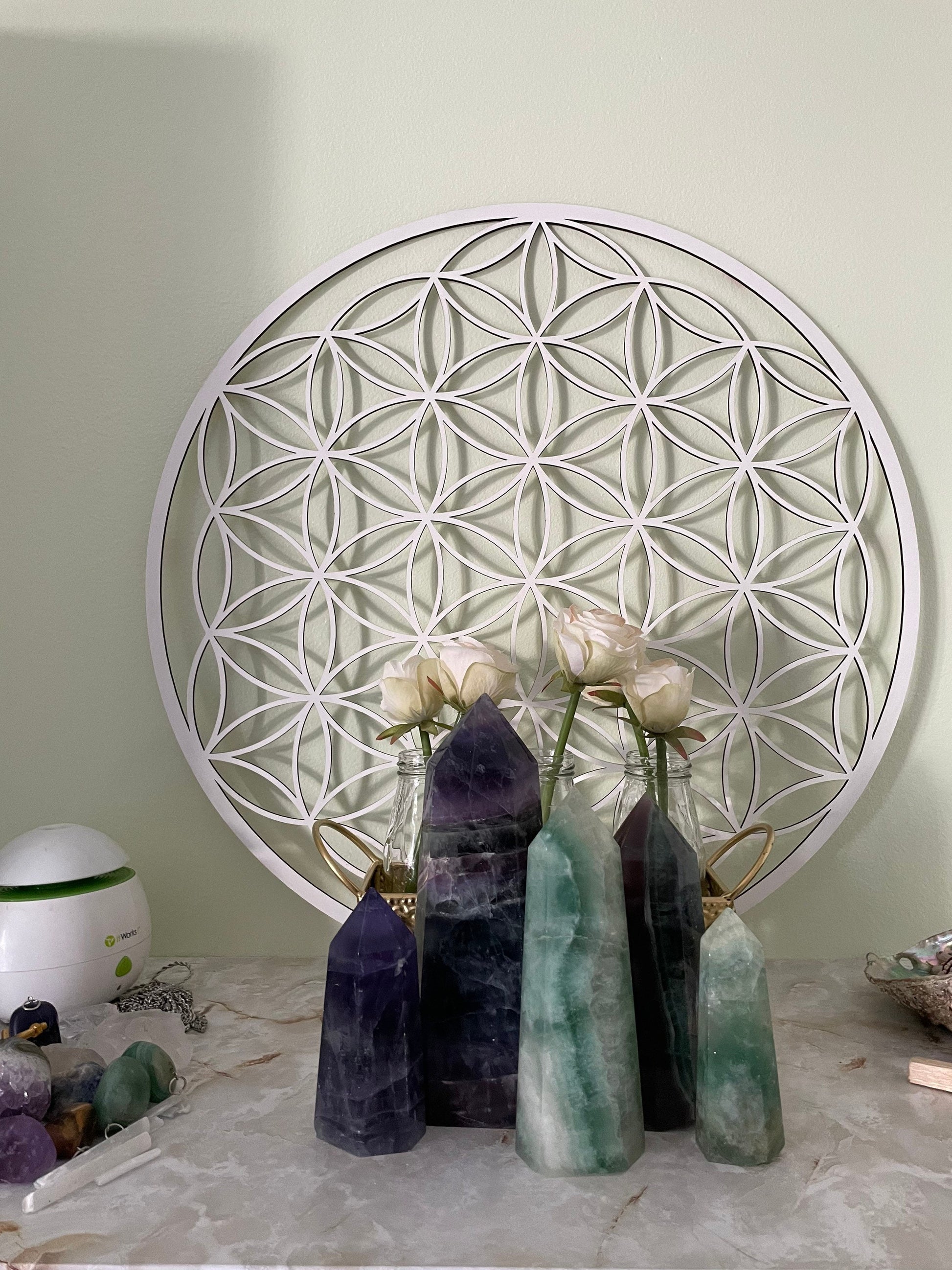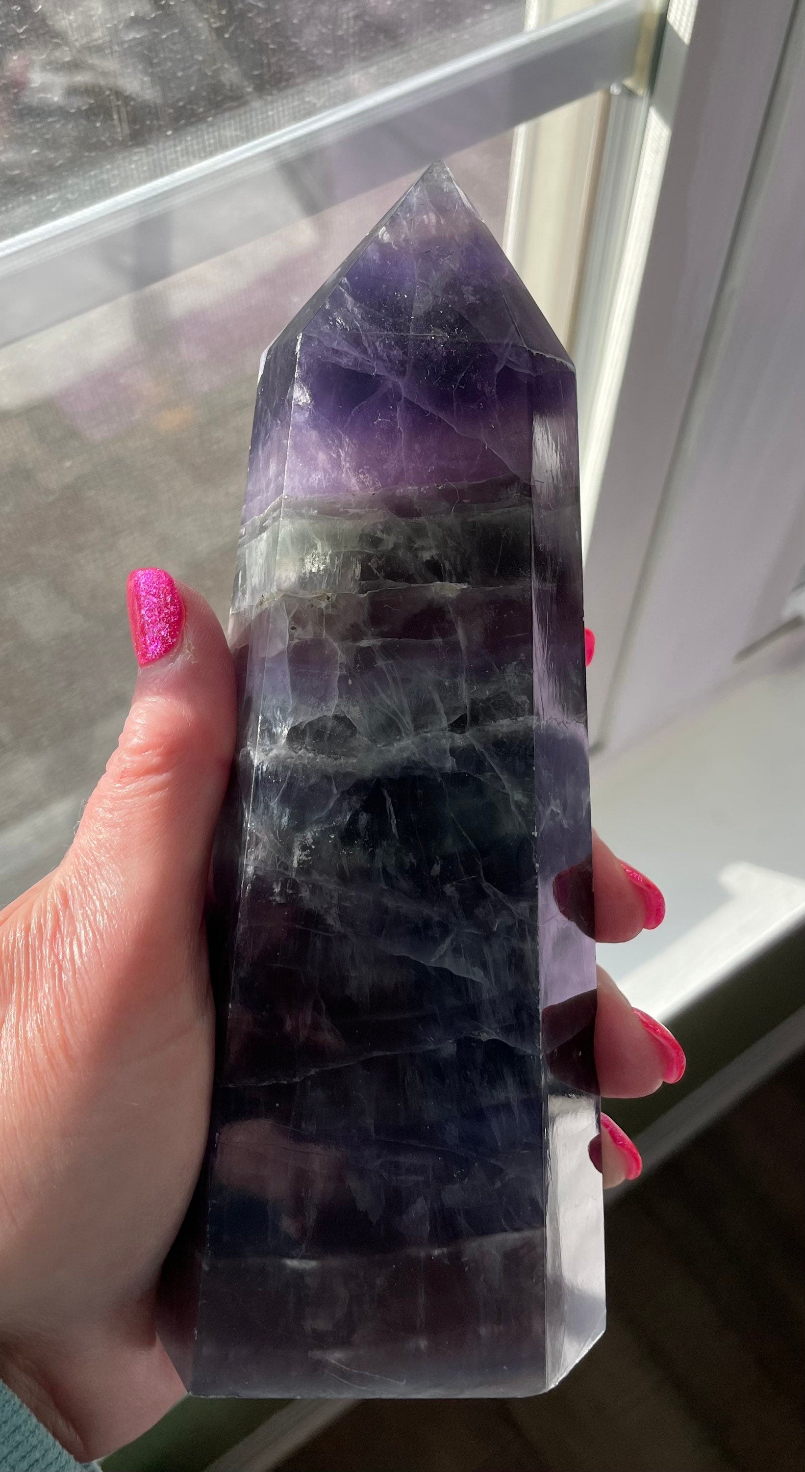 Fluorite cleanses and stabilizes the aura. It absorbs and neutralizes negative energy and stress. It increases our powers of concentration, self-confidence and helps us in decision-making. It encourages positivity, balances the energies, and improves balance and coordination, both physically and mentally. It is also sad that Fluorite will boost your immune system. It weighs just over 2 pounds 7.25” tall & approximately 2 3/4”at the base.