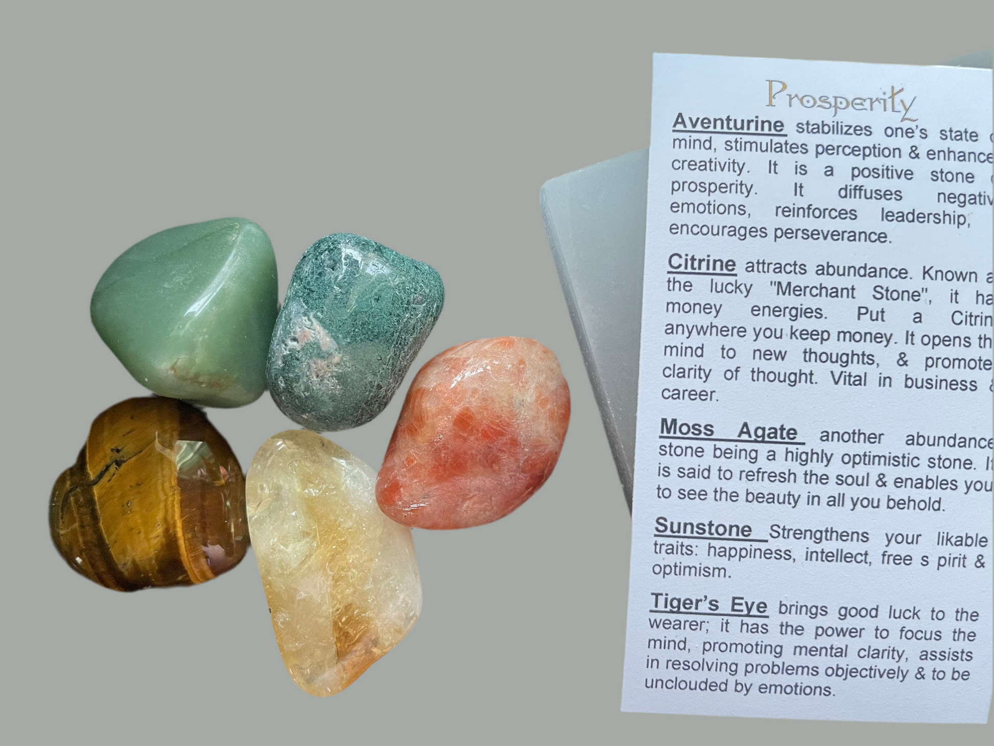 You will receive assistance in manifesting prosperity in your life with this Crystal set. Used in meditation, it aides in prosperity. Set consists of 5 tumbled crystals known to increase prosperity.