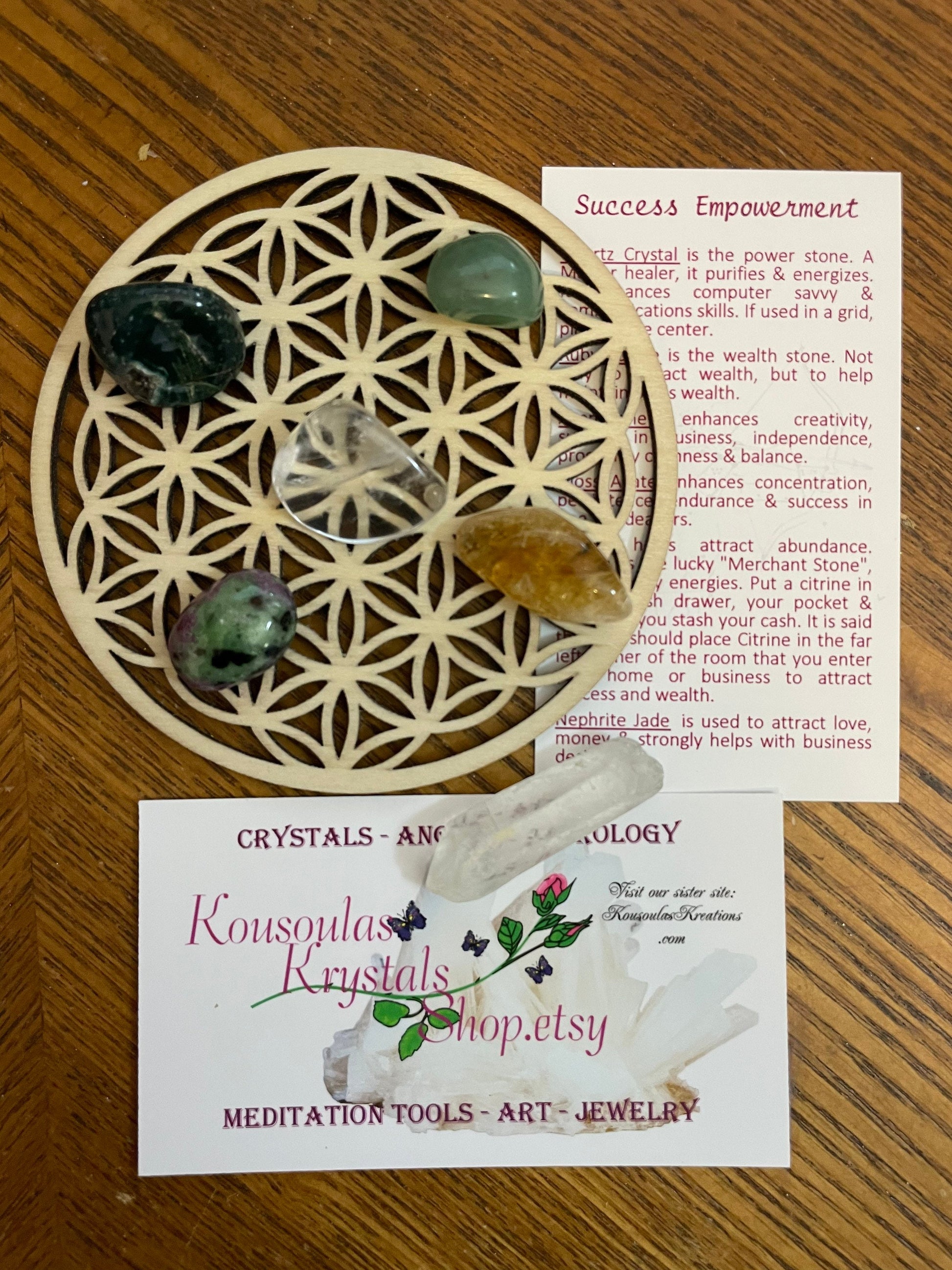 You will receive assistance in manifesting more success in your life with this Crystal set and Metatron’s Cube grid. Use in meditation and grid energy, it aides in success. Set consists of 5 tumbled crystals known to increase your success and 1 Quartz point for activating your flower of life 3.5” grid. Because Crystal are a raw material, sizes will vary. They will come package in a pretty gold pouch with a Success Empowerment Crystal card and programming instructions included.