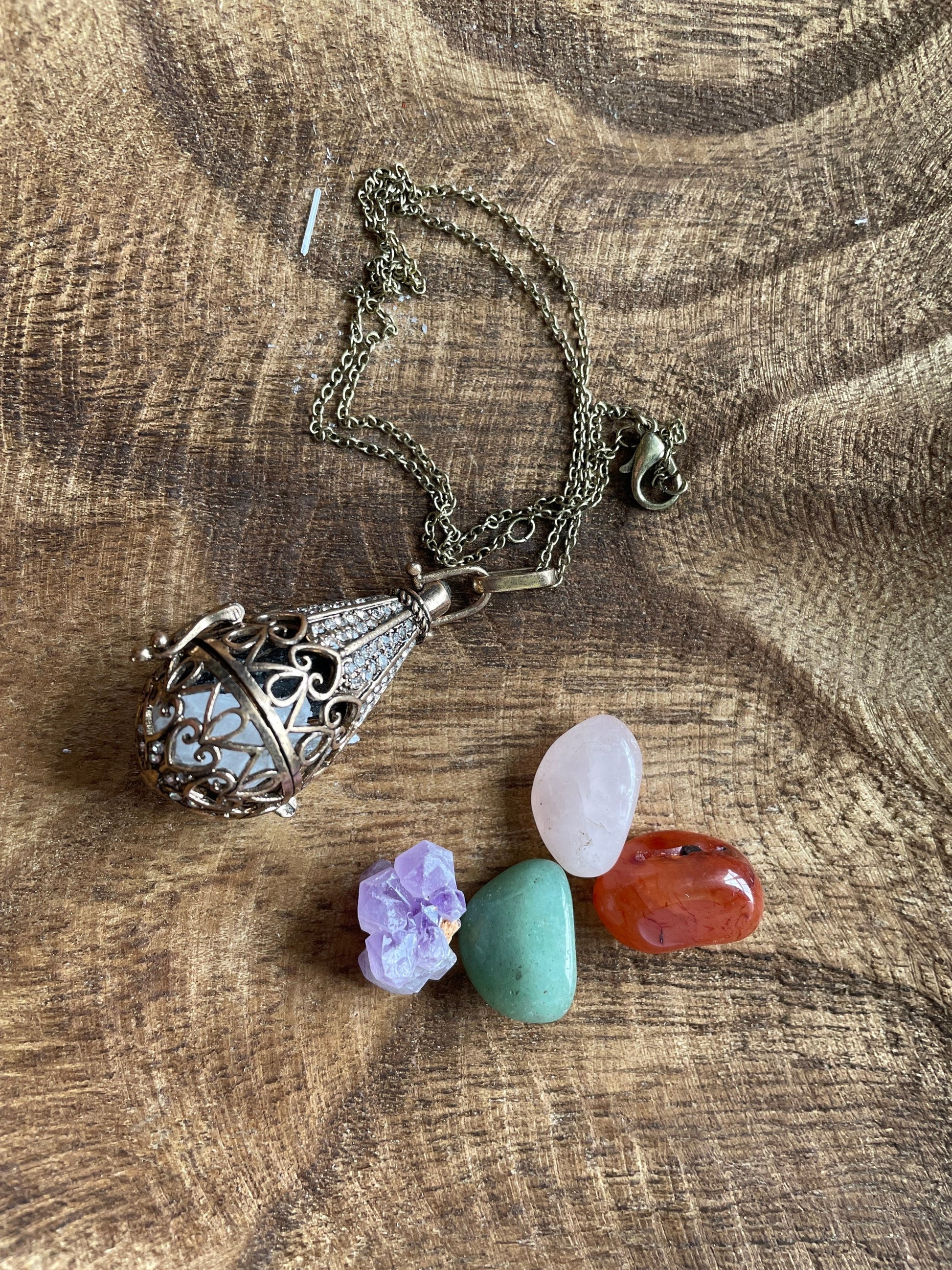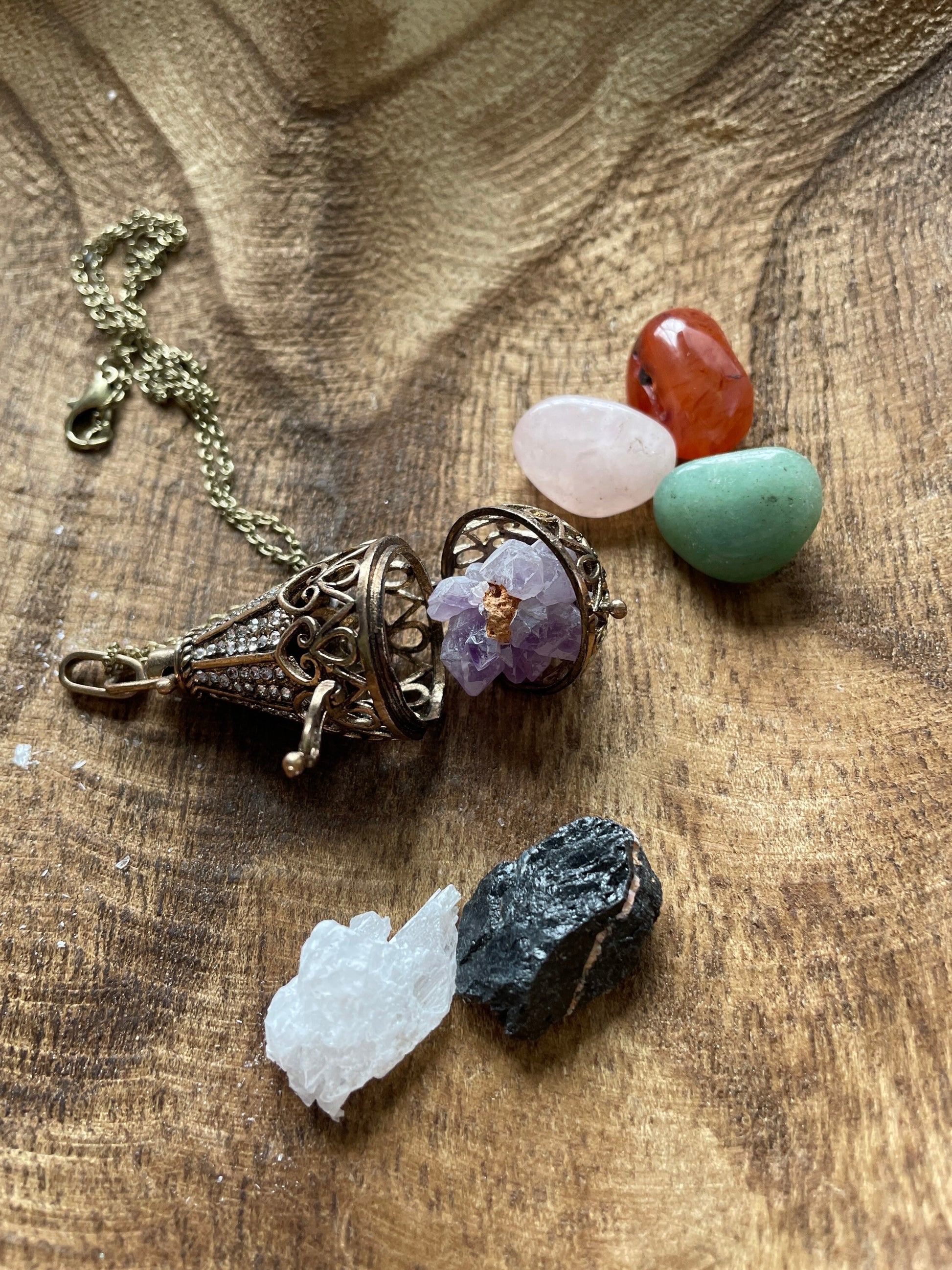 When you receive your locket, it will be prefilled with Selenite Wand and Black tourmaline and arrive in a pretty mesh pouch.