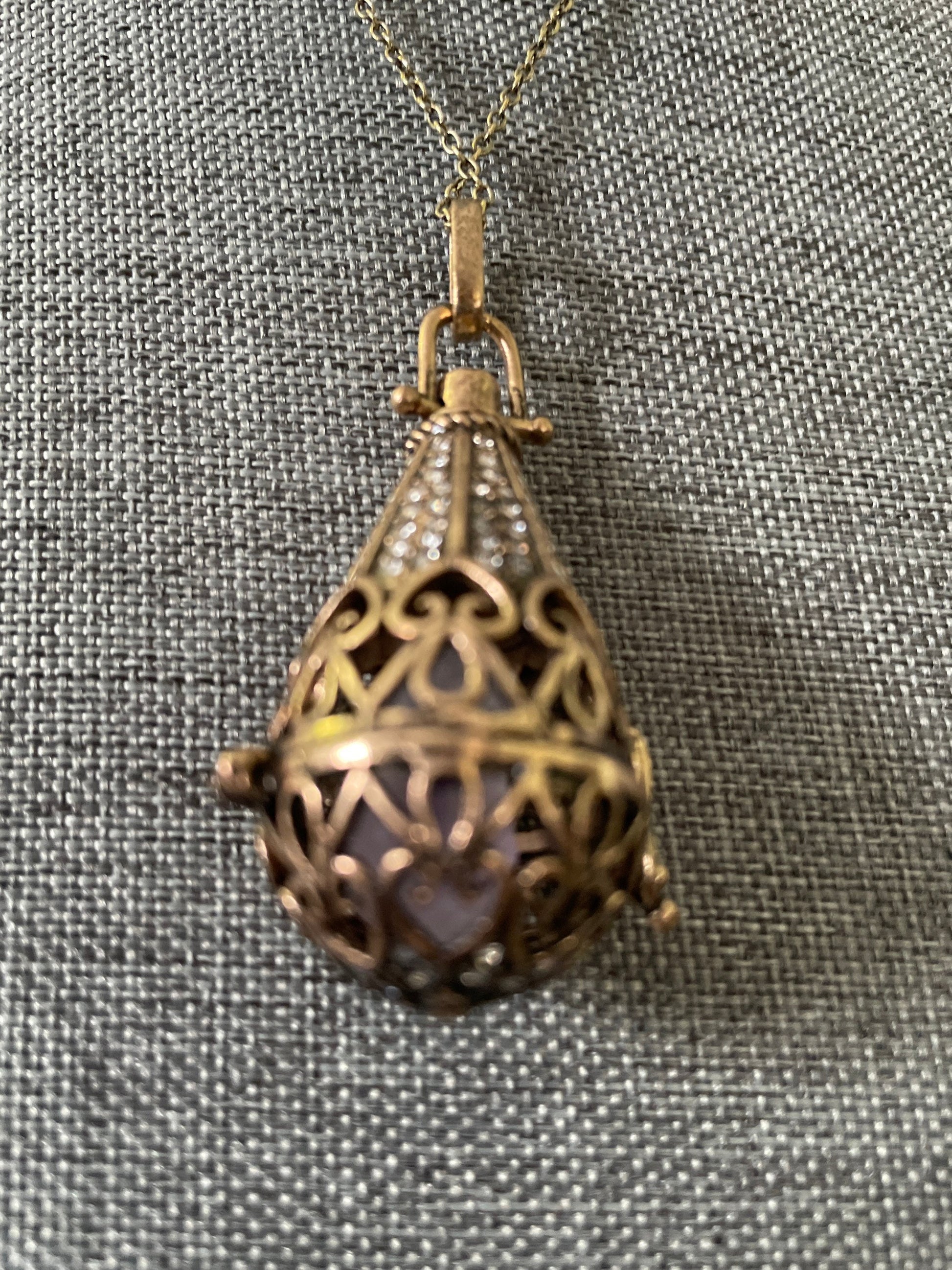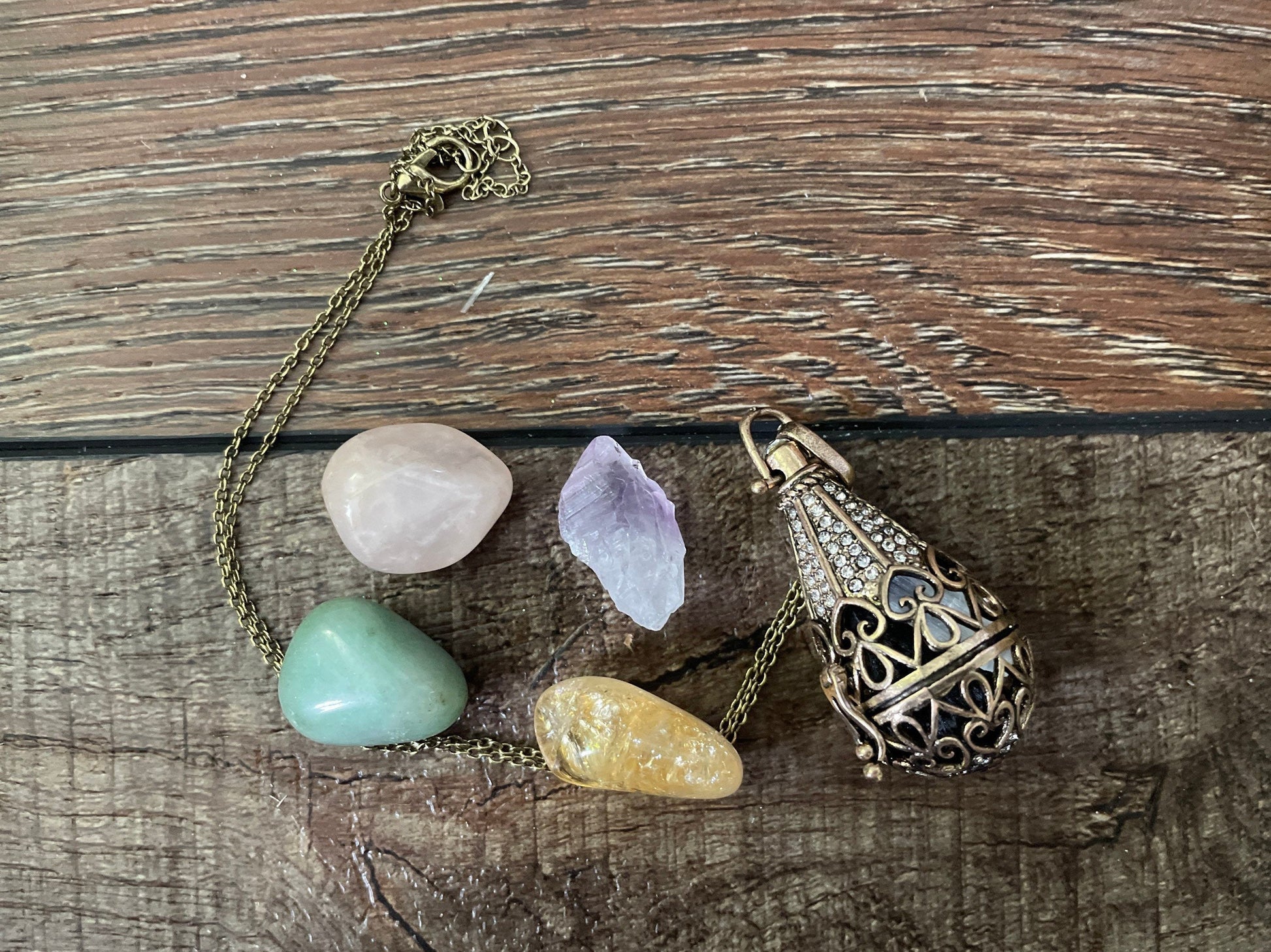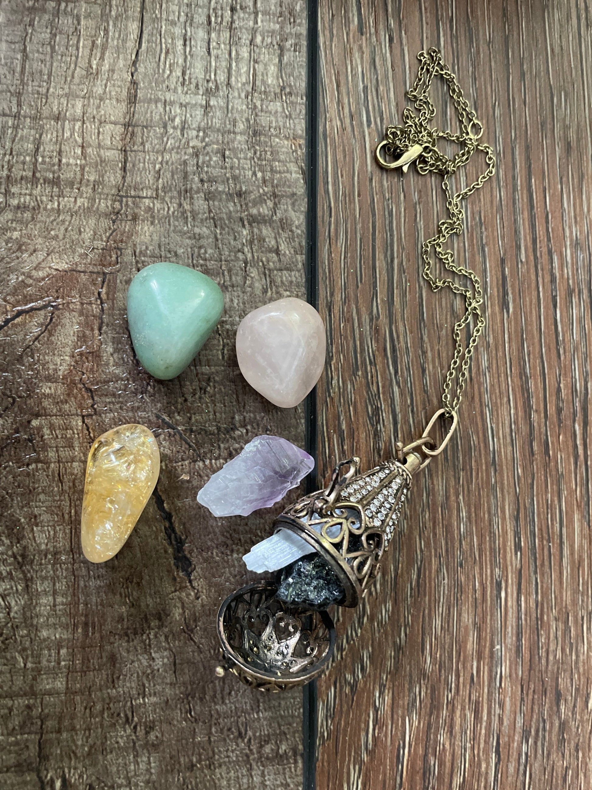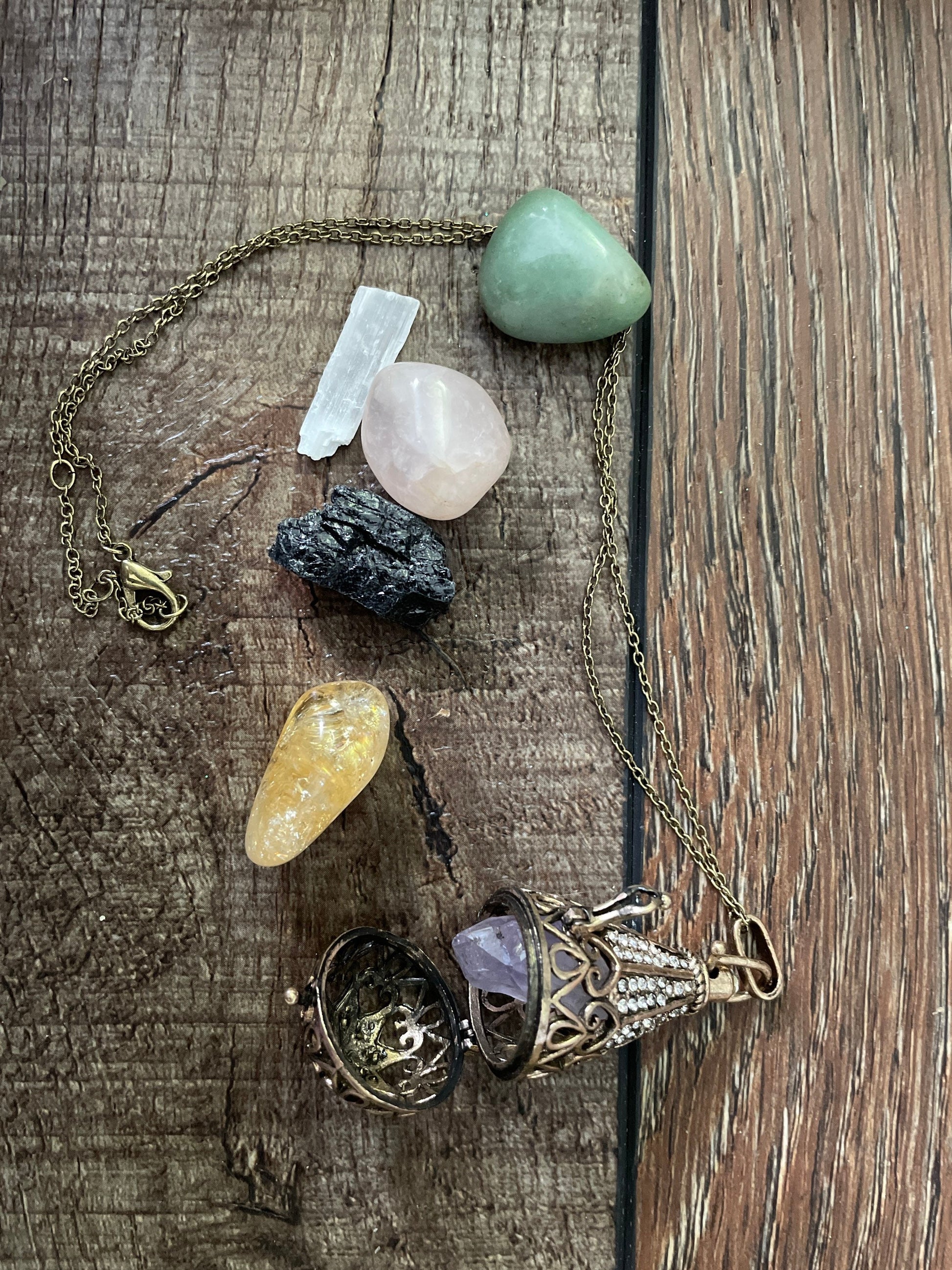 From this antique gold chain hangs a beautiful locket which carries the crystal of your needs!! Wear and change out the crystal in a sectoon!!
