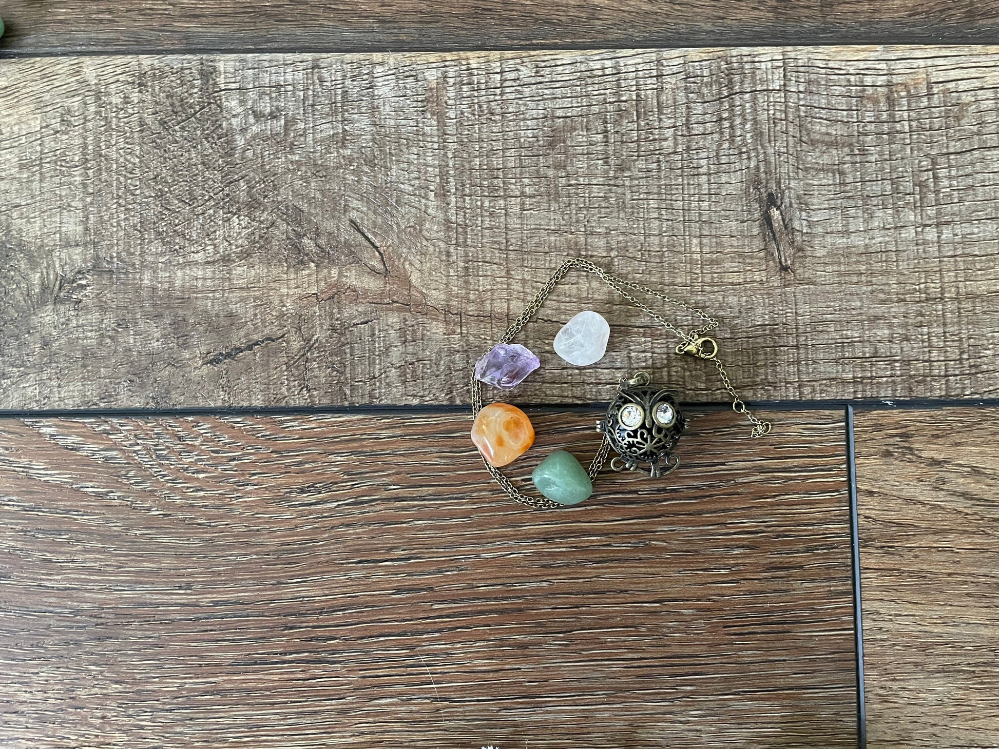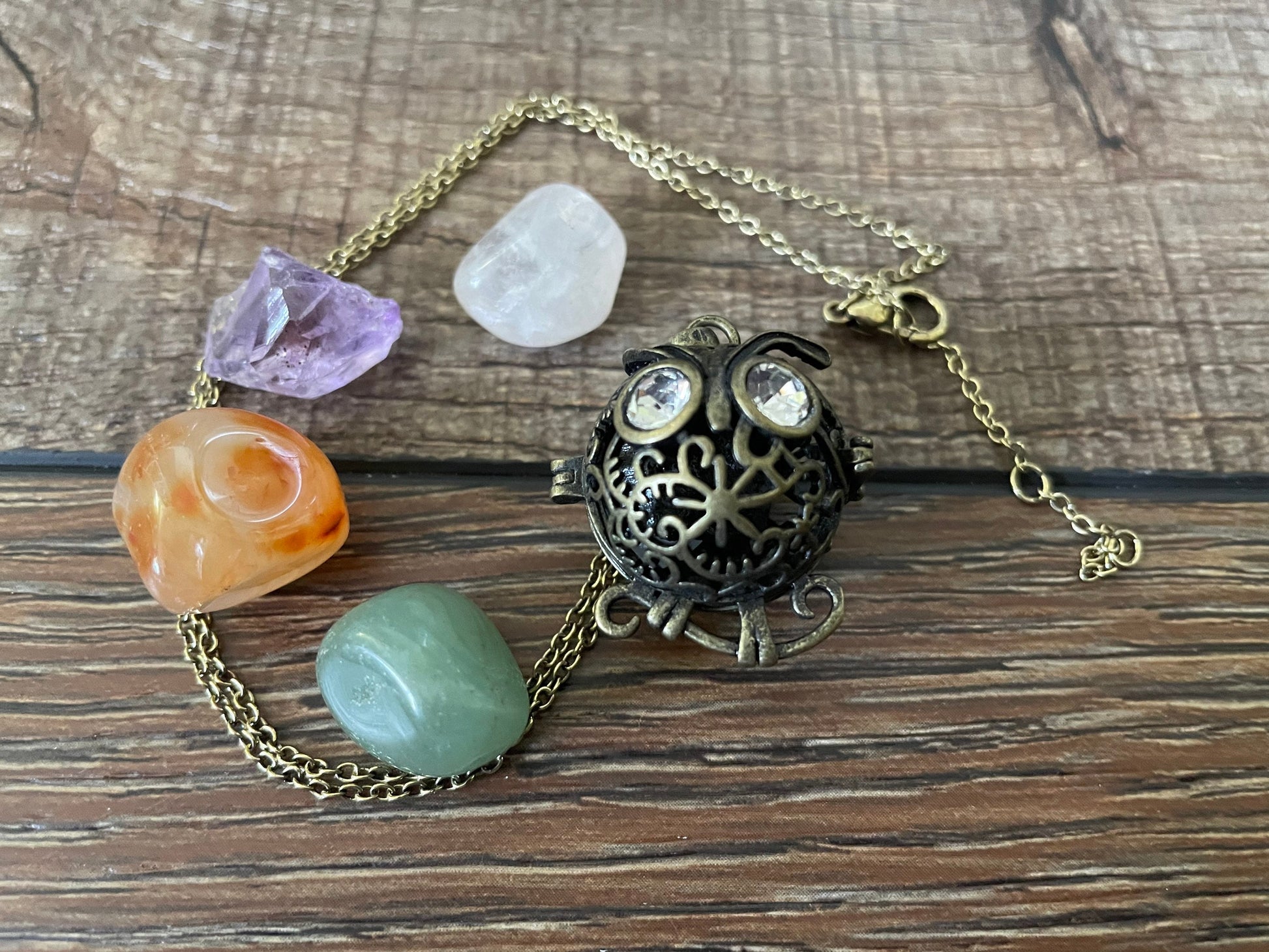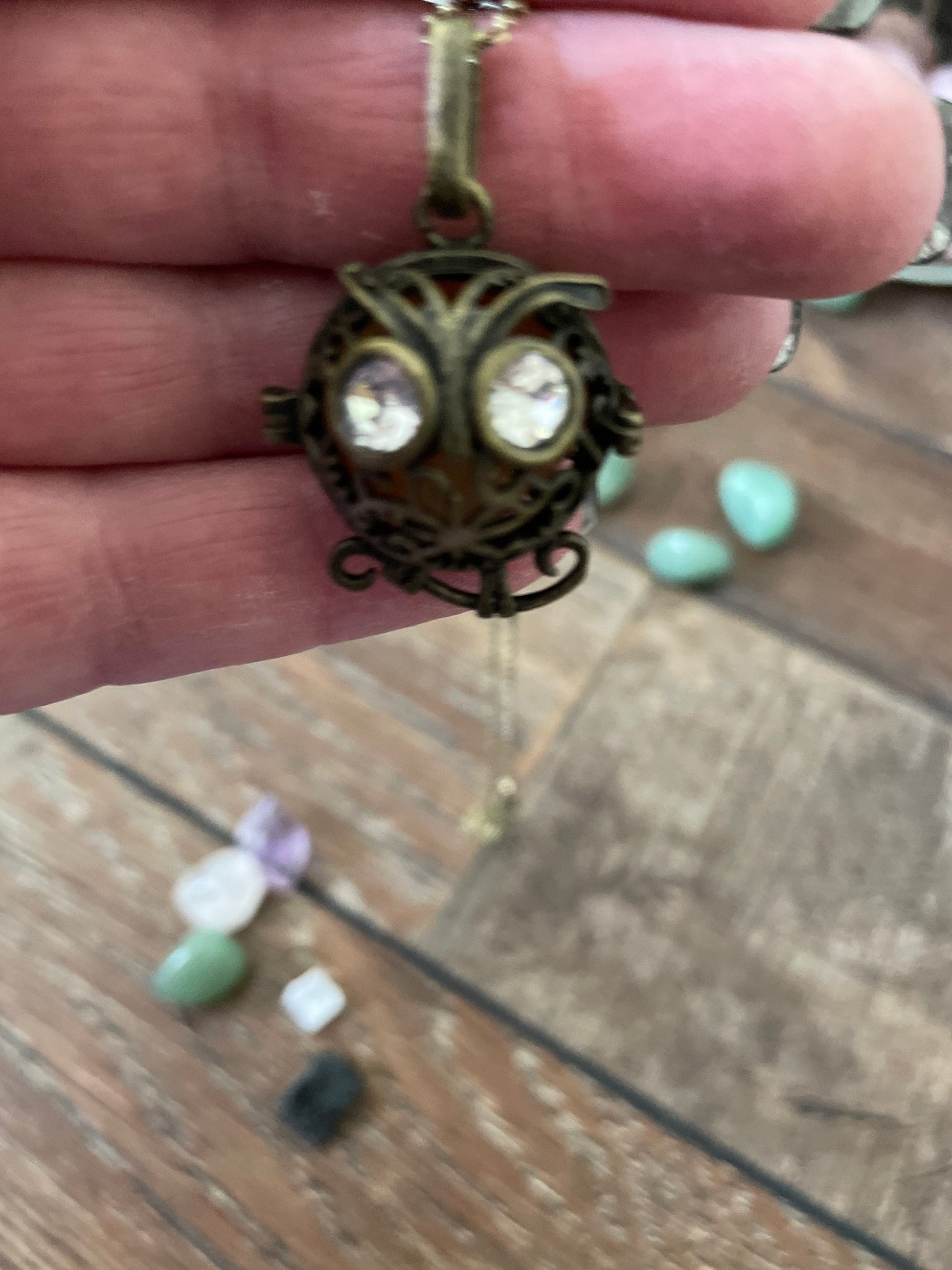 From this antique gold OWL chain hangs a beautiful locket which carries the crystal of your needs!! Wear and change out the crystal in a section!