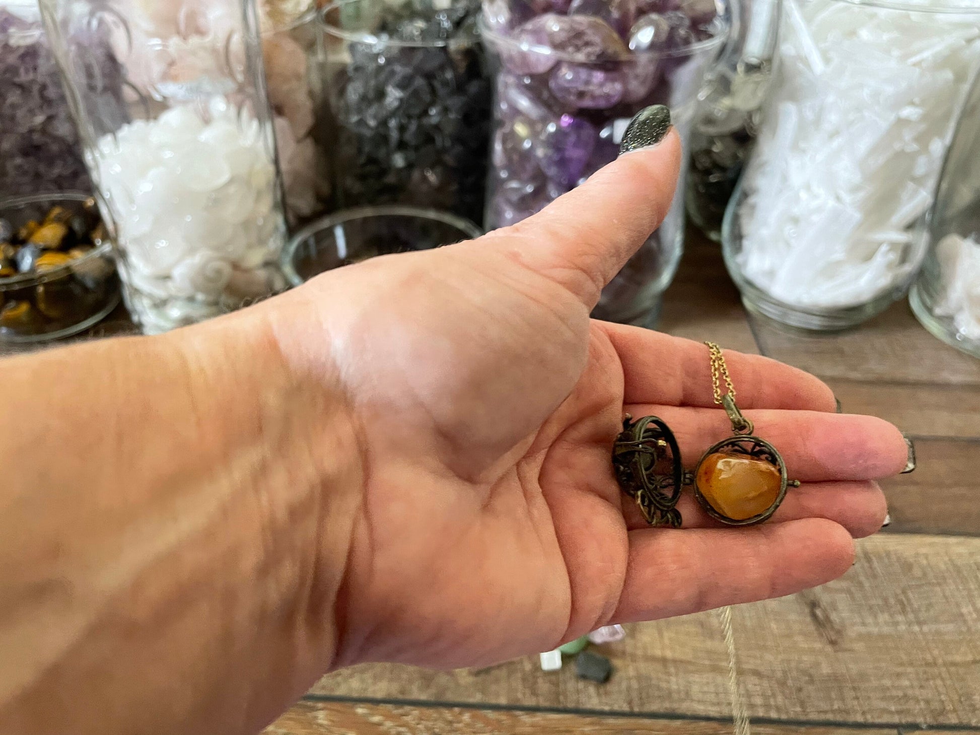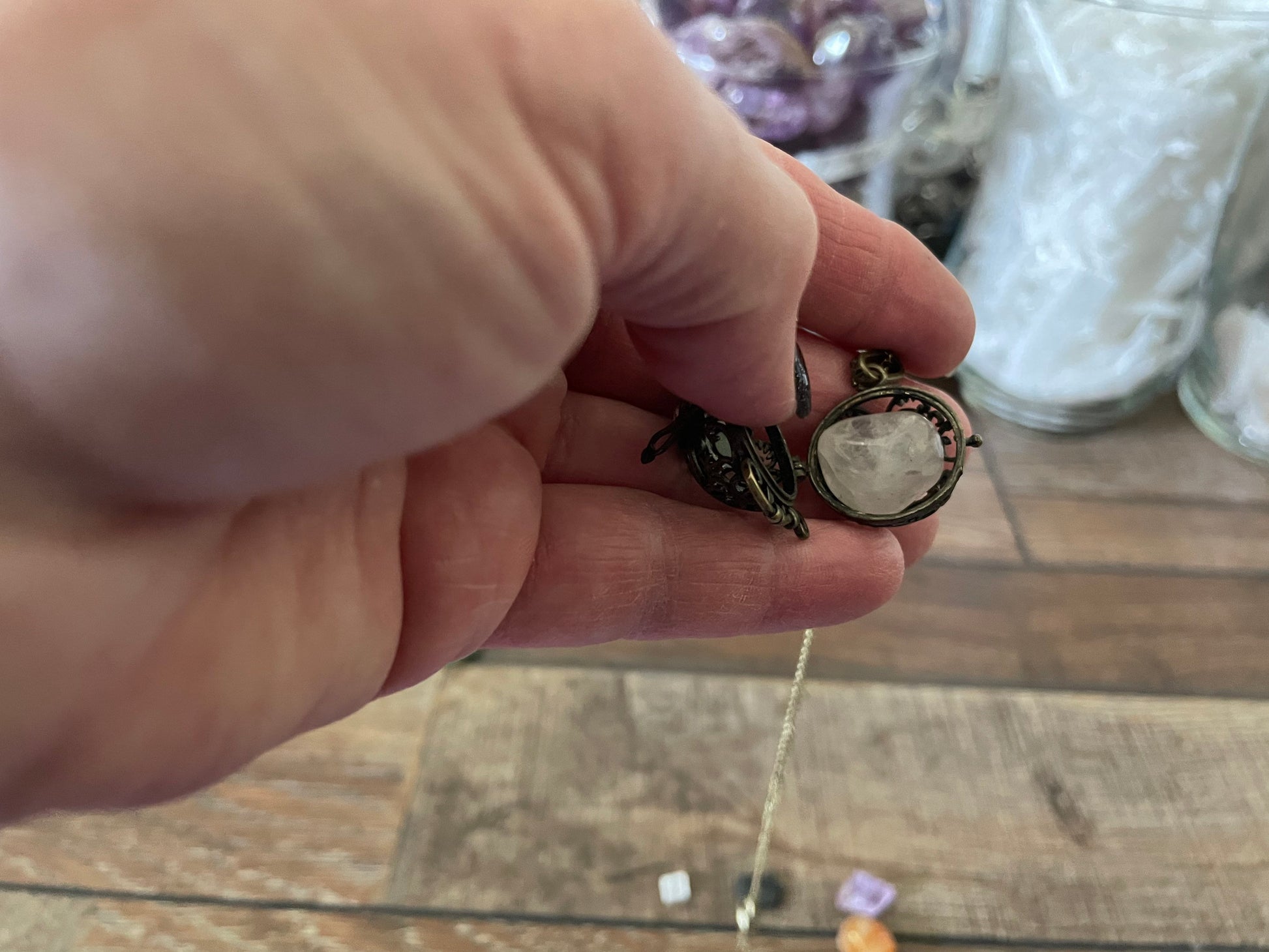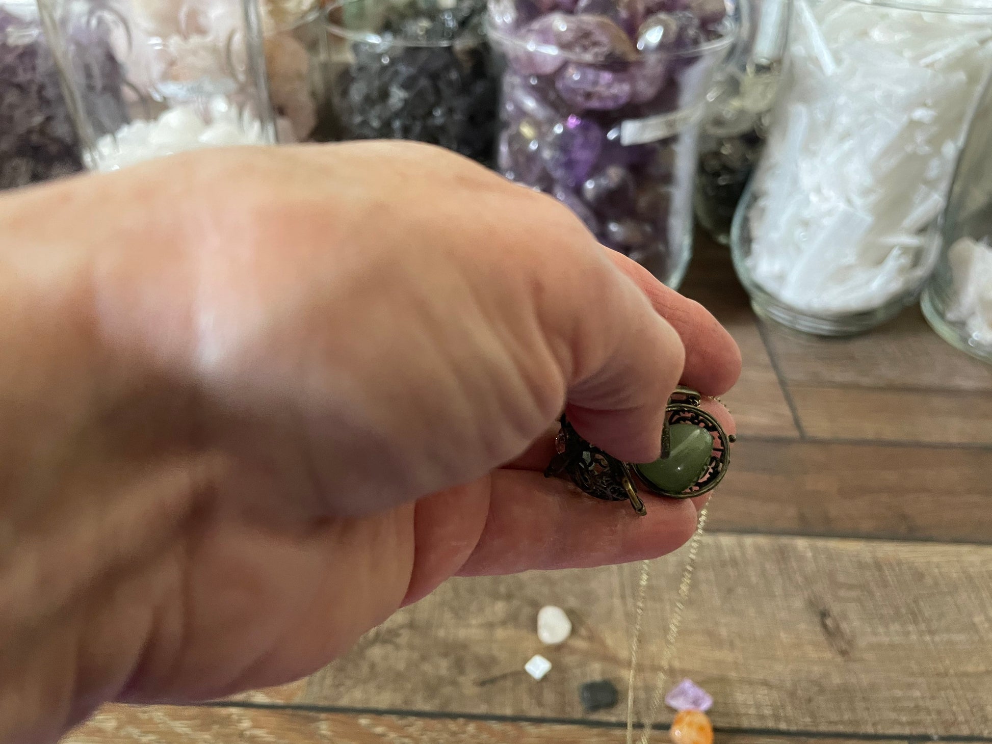 From this antique gold OWL chain hangs a beautiful locket which carries the crystal of your needs!! Wear and change out the crystal in a section!