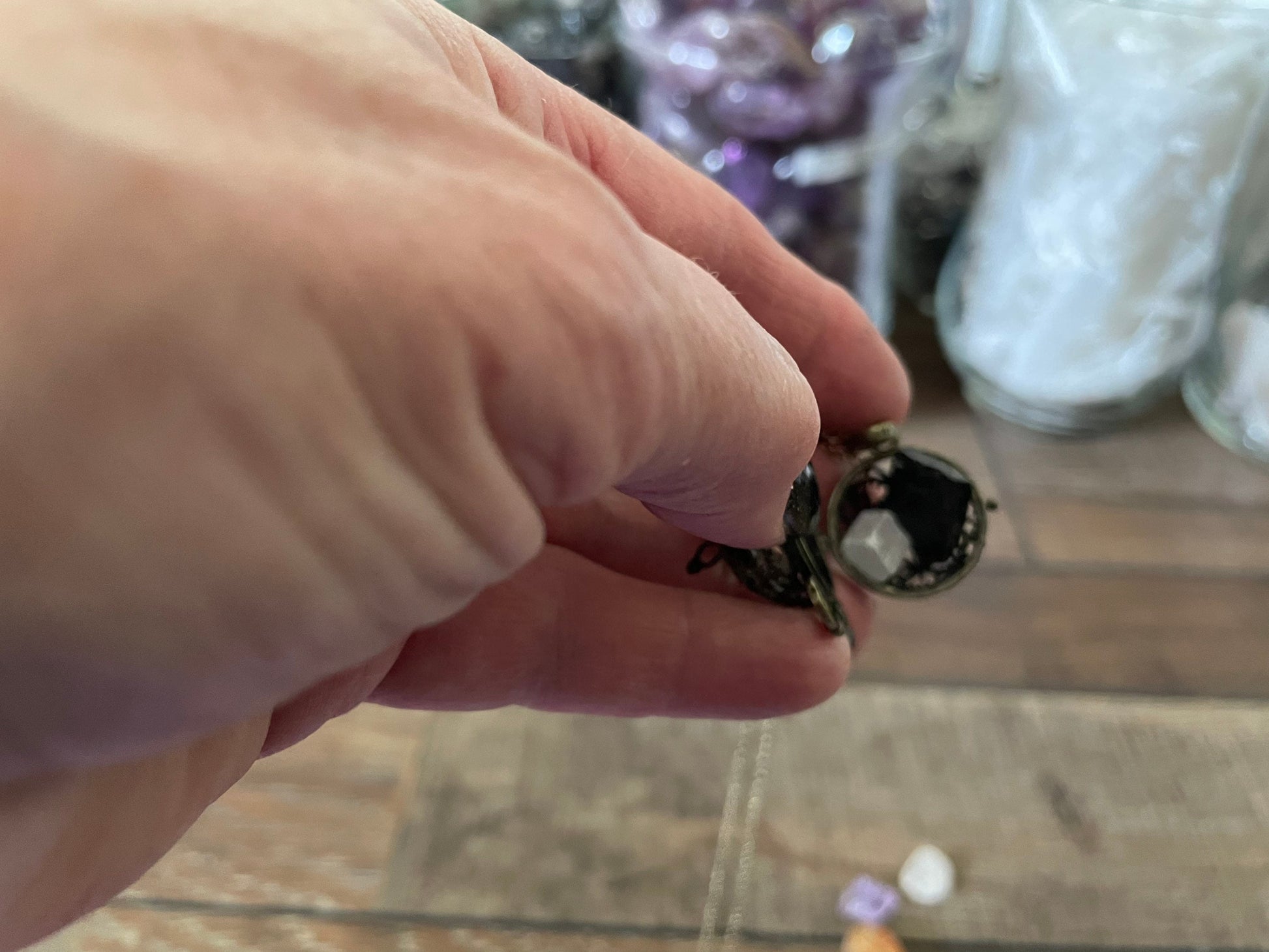 When you receive your locket, it will be prefilled with Selenite Wand and Black tourmaline and arrive in a pretty mesh pouch.