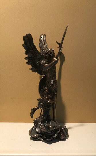 This piece is magnificent! Archangel Uriel cold cast bronze statue stands 14.5” tall. Look closely at the pictures to see the wonderful detail! It is the perfect recovery gift for a very important person in your life. Uriel, who is in charge of the red angel light ray (which represents service), wants you to take the wisdom he gives you and put it into action to serve people. So when you feel an urge to reach out to serve others, that may be a sign of Uriel's presence with you. Not only will Uriel motivate you to serve people in need, but he/she will also empower and support you to do so. Archangel Uriel, the angel of wisdom, often gives people sparks of inspiration and motivation as they seek to live faithful lives. Since Uriel specializes in helping people discover God's wisdom, Uriel may be visiting you when you gain new insights about the best decisions to make in various situations. Knowing that you can rely on Uriel to give you regular doses of wisdom gives you valuable confidence. Archangel Uriel heals any loss of self-respect. He helps us find empowerment in our own value so we can shine our light on to the world and claim our good." Since Uriel often sparks our minds with fresh ideas, he/she sometimes manifests physically through electrical signs. His/her presence is often heralded by electrical appliances fusing and light bulbs failing; he also manifests in thunderstorms.