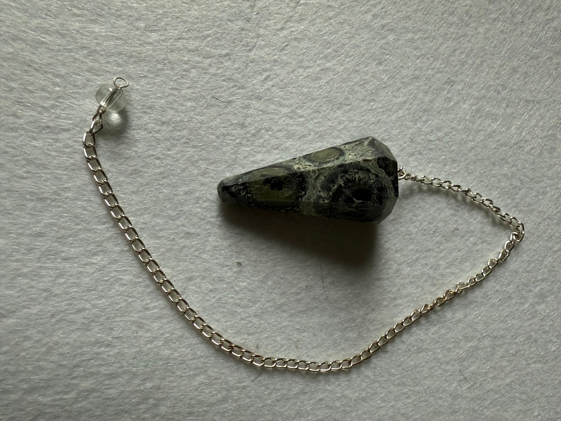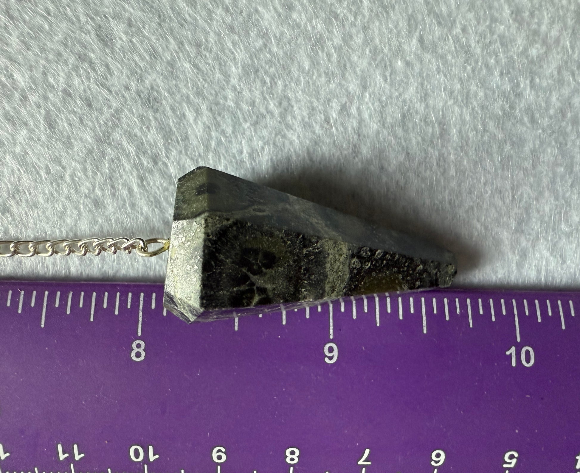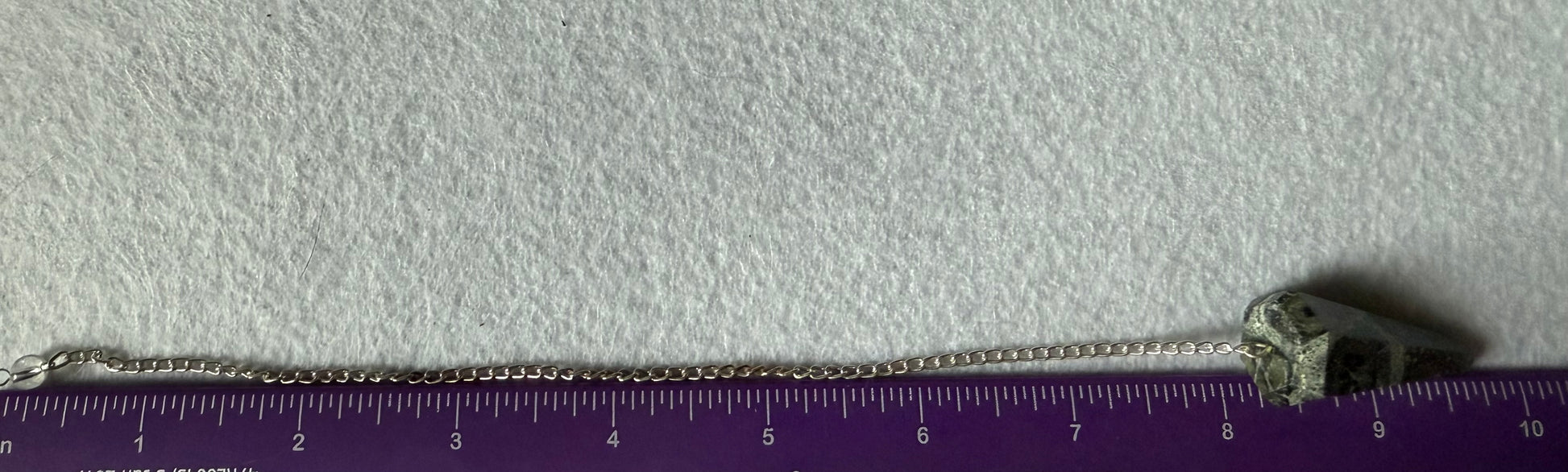 This beautiful Kambaba Jasper Pendulum is 1.5” and with chain is 9.75”. Please look at all pictures to see all sides of this pendulum.