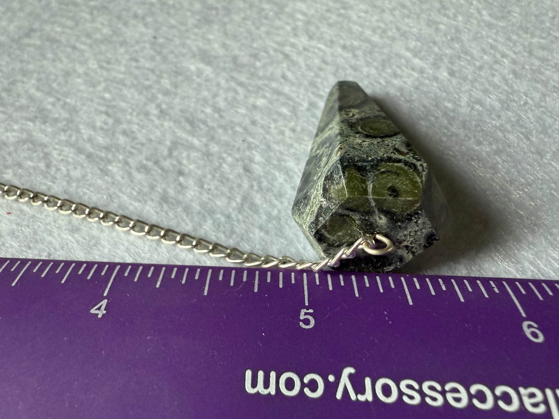 Awesome Kambaba Jasper Pendulum is 1.5” with chain is 9.75”