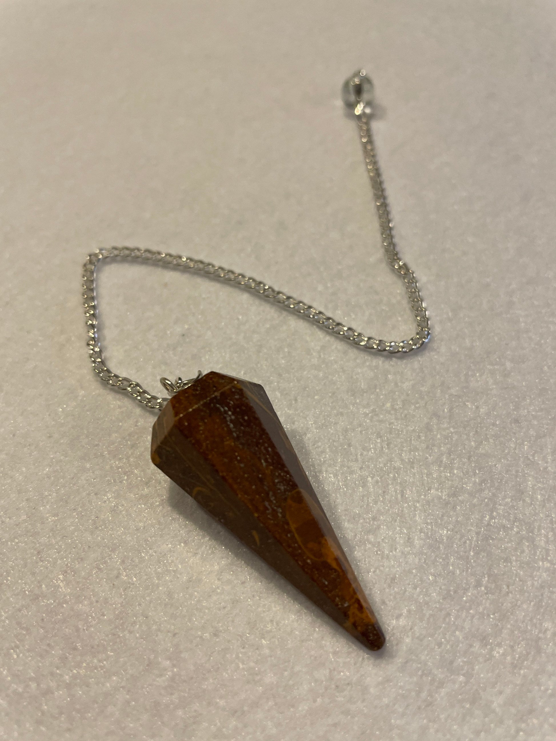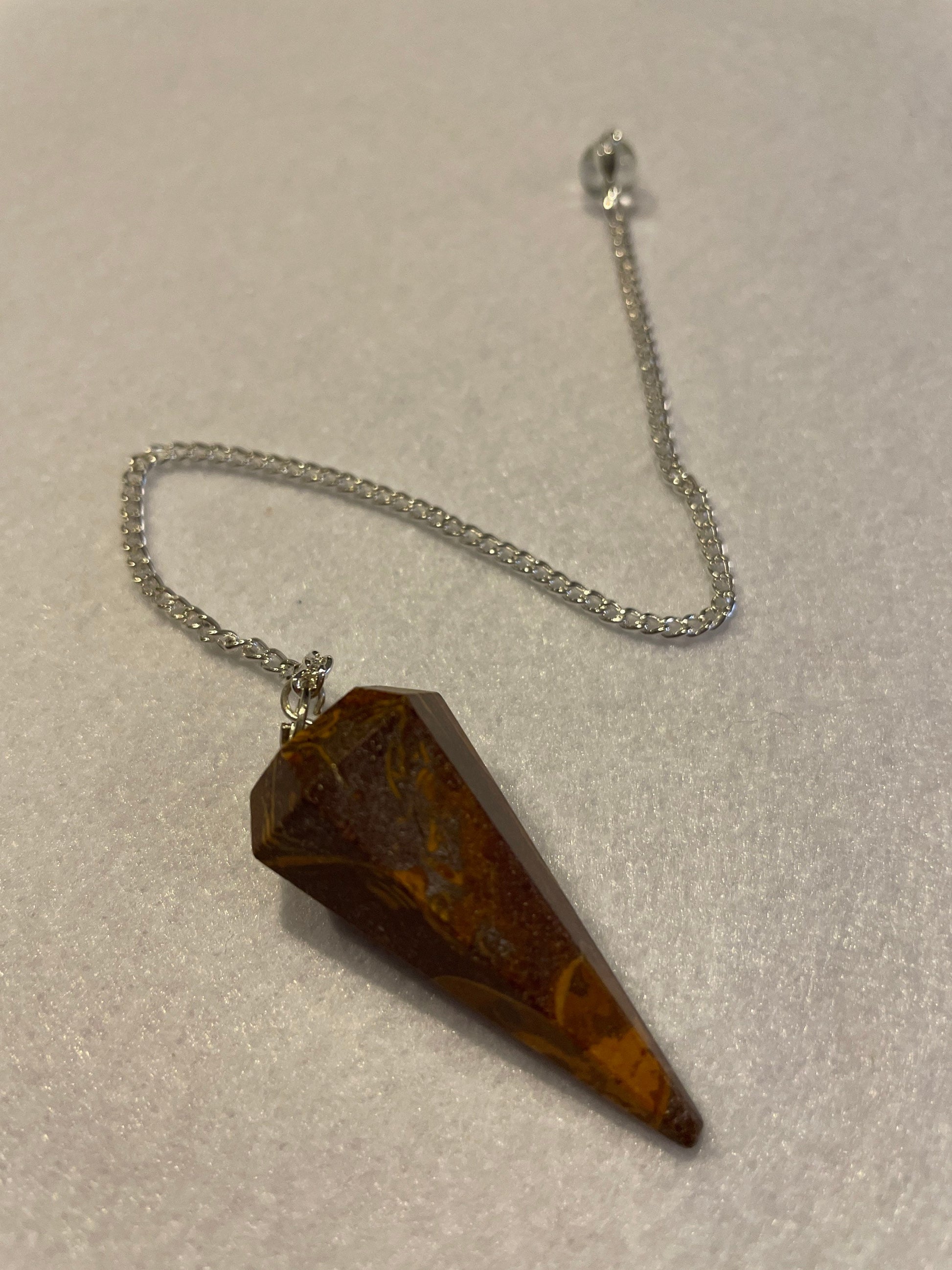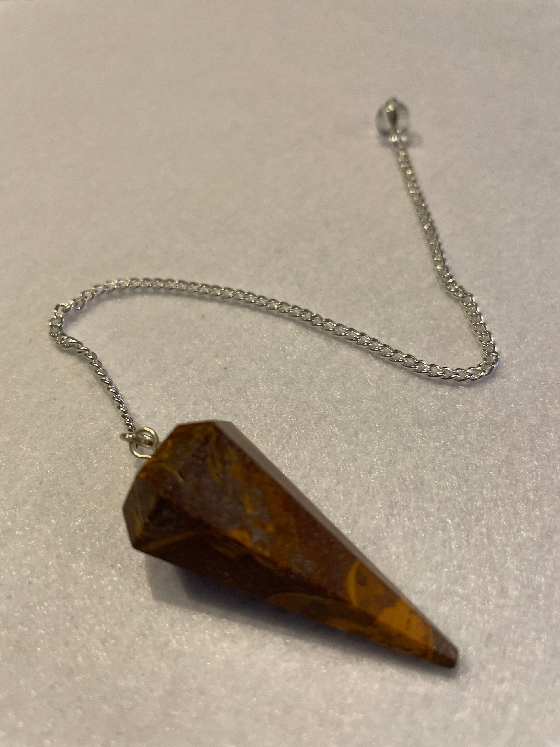 This beautiful Yellow Jasper Pendulum is 1.50” and with the chain it is approximately 8.25”. Please look at all pictures to see all sides of this pendulum.