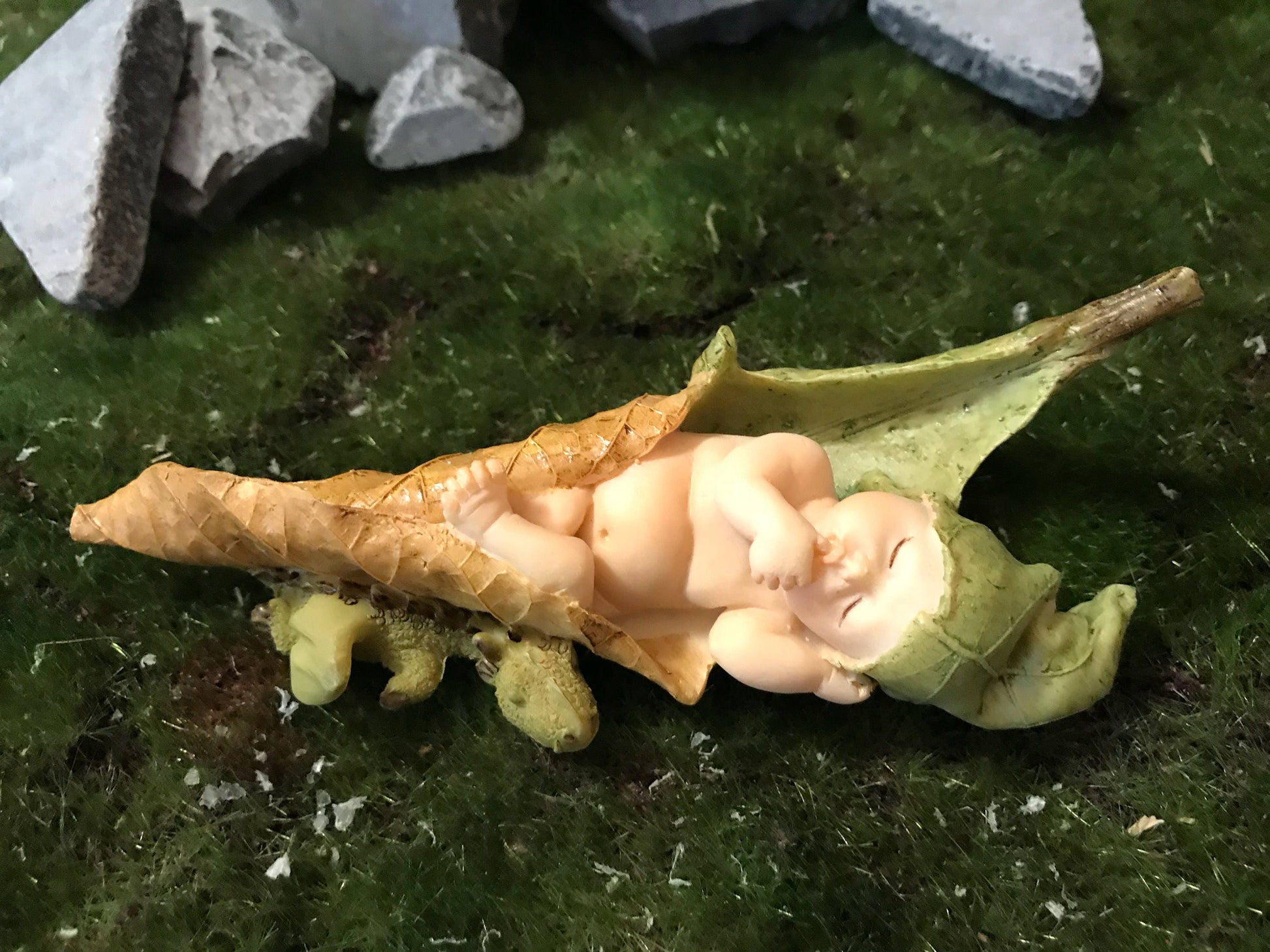This precious baby fairy is sucking her thumb while sleeping nestled in a green and brown leaf curled around her. Right by her side, rests a baby green dragon. They look so sweet. The detail is spectacular!
