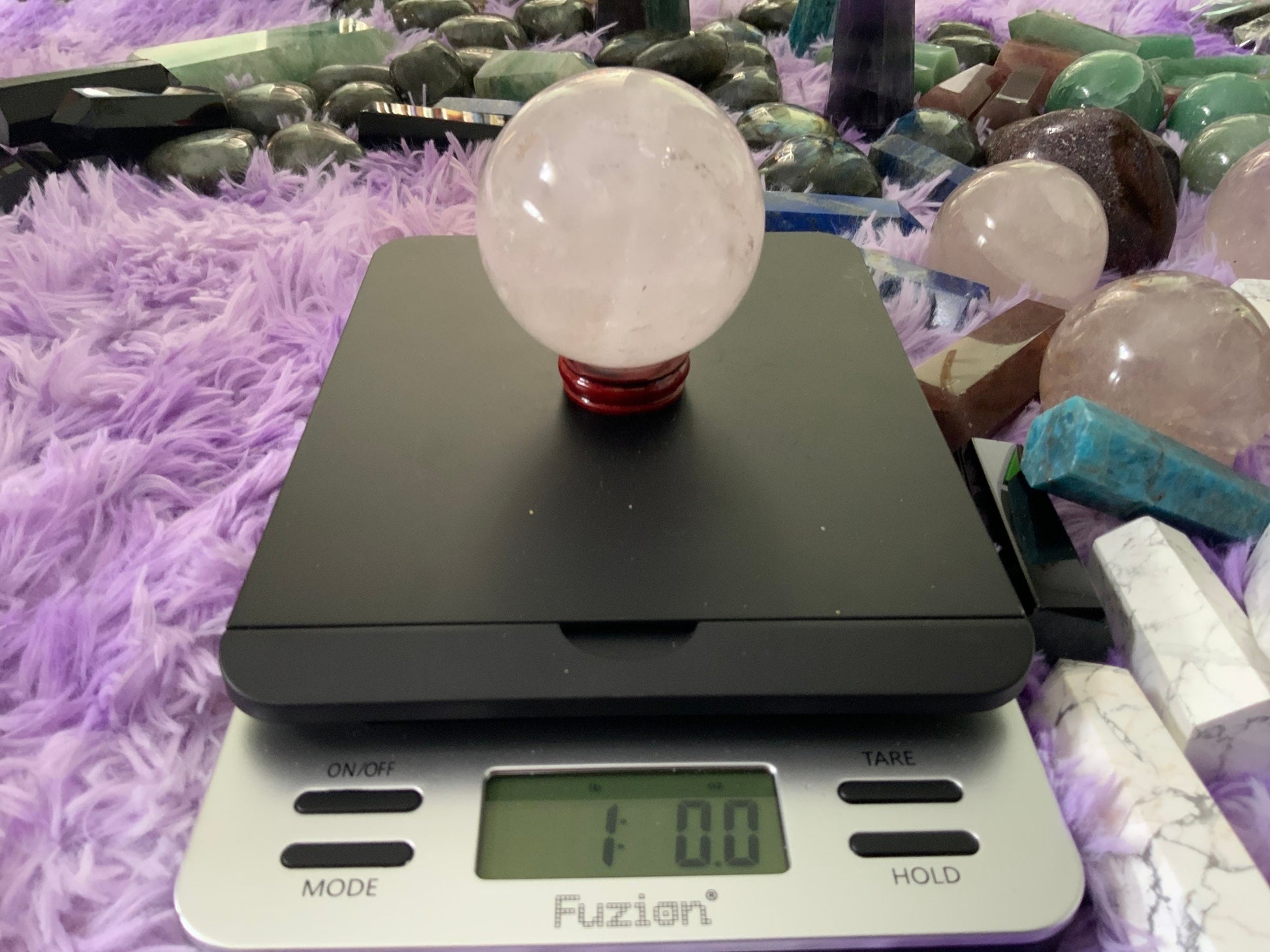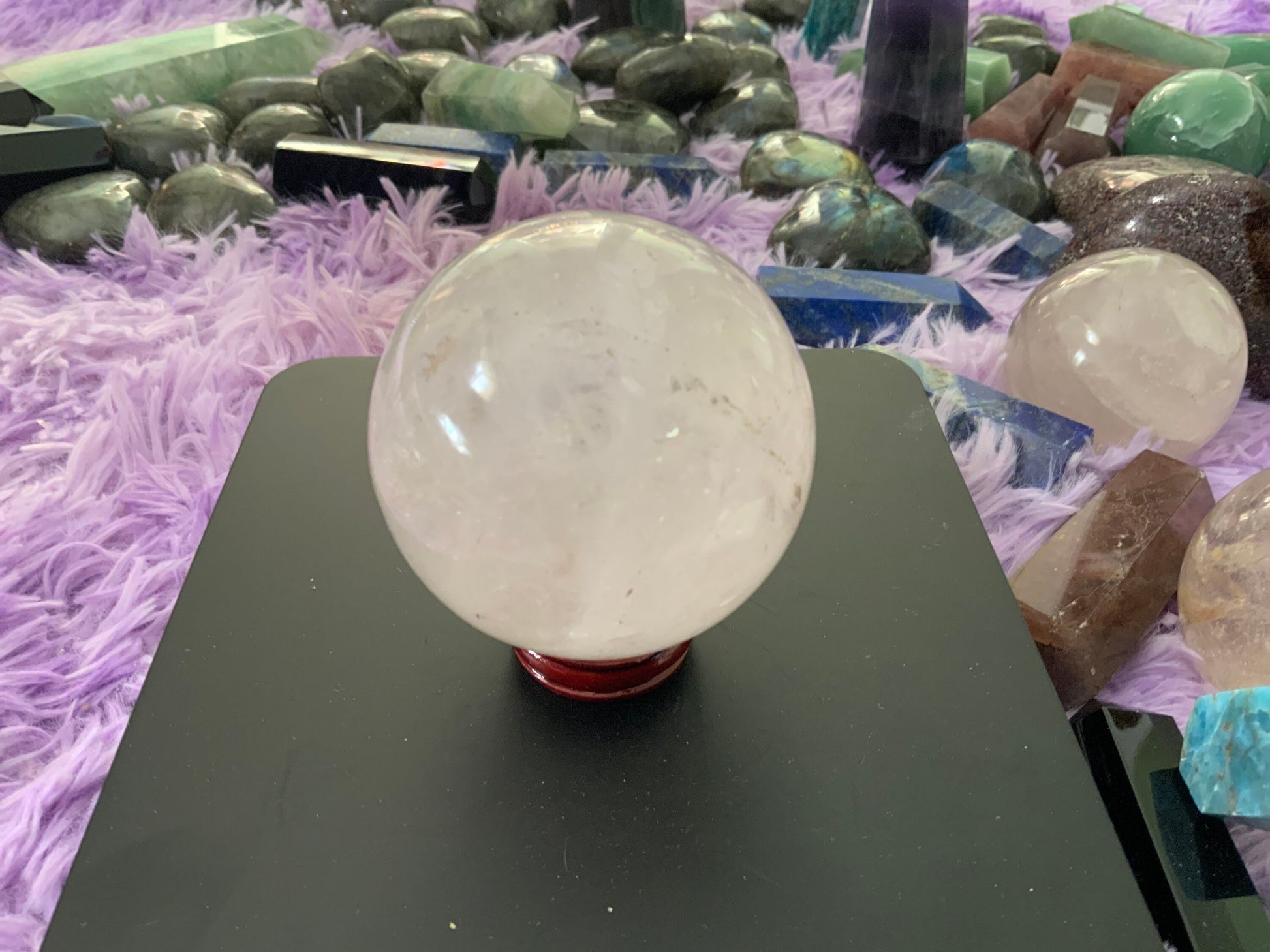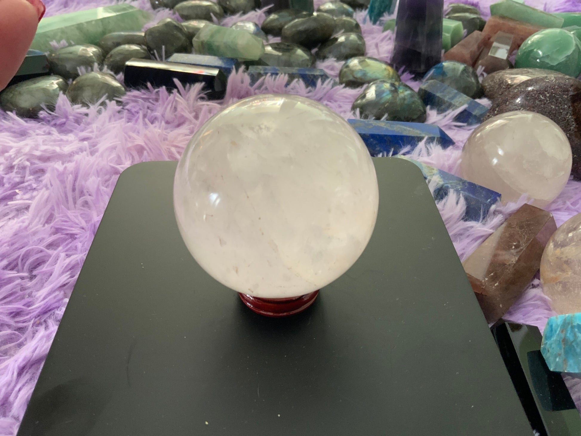 Beautiful 1 lb clear quartz sphere crystal ball with wooden stand Clear Quartz crystal ball/sphere is just over 1 lb 4 oz without the stand and 1.5.1 with the wooden stand sphere. It measures approximately 2.75” in diameter. There are several photos showing multiple views of this magical crystal ball. Please see all photos for details.