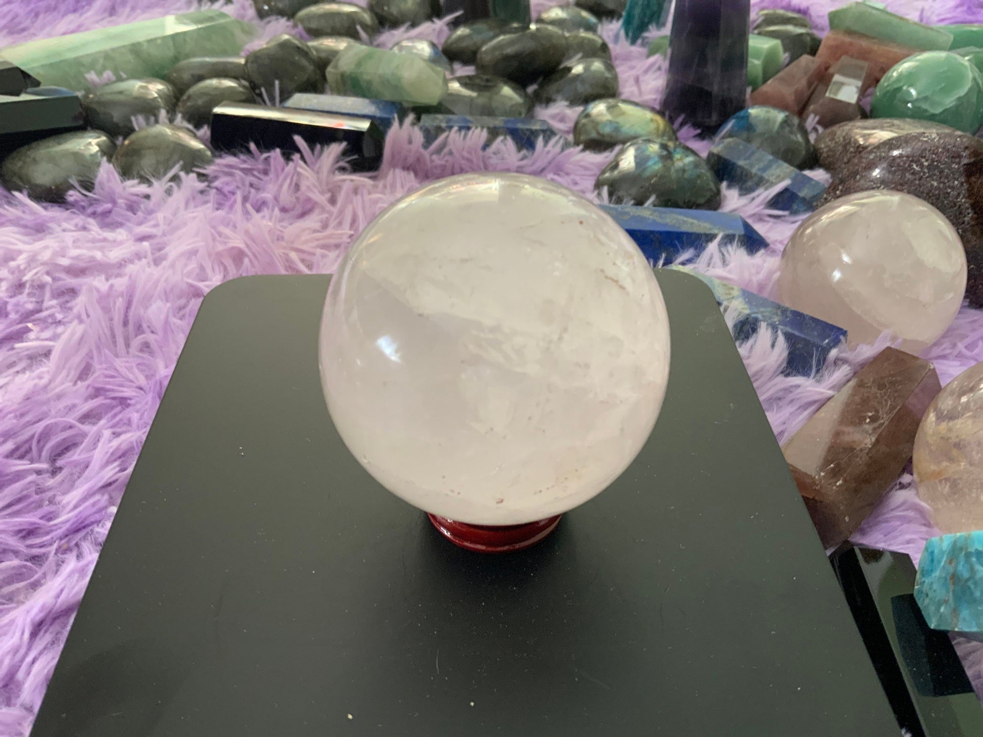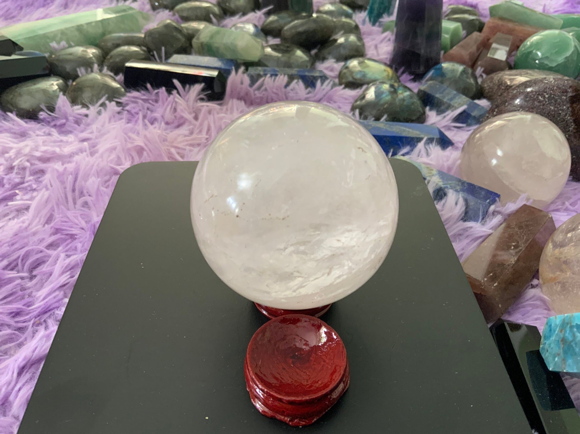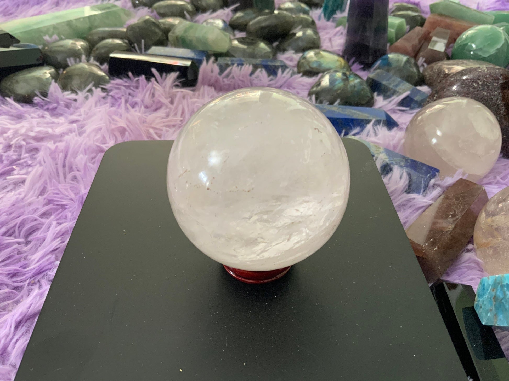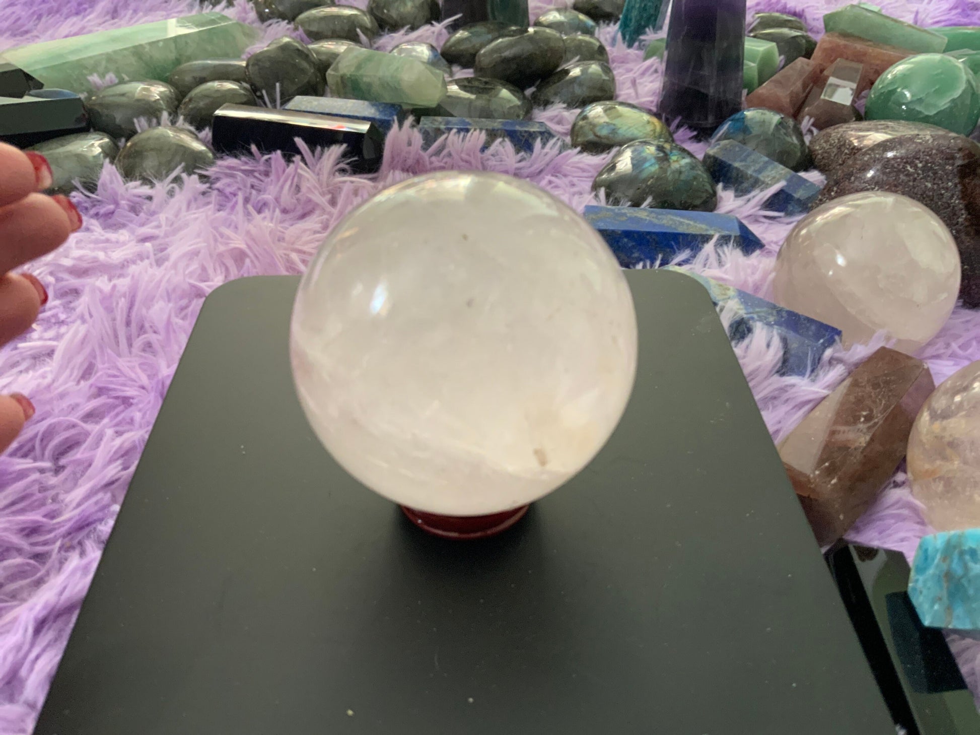 Beautiful 1 lb clear quartz sphere crystal ball with wooden stand Clear Quartz crystal ball/sphere is just over 1 lb 4 oz without the stand and 1.5.1 with the wooden stand sphere. It measures approximately 2.75” in diameter. There are several photos showing multiple views of this magical crystal ball. Please see all photos for details.