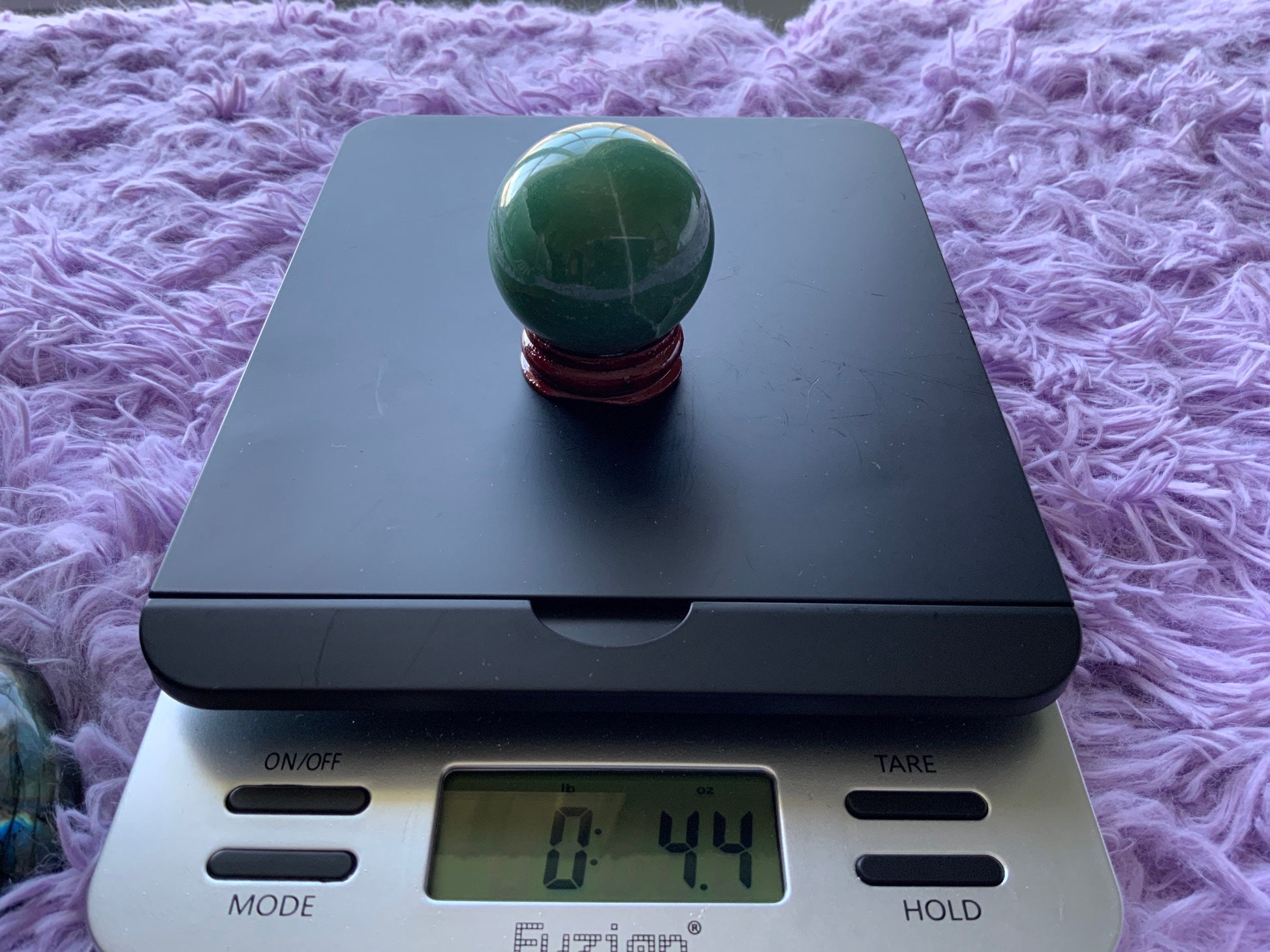 Aventurine crystal ball/sphere is 4.4 oz with the wooden stand. It measures approximately 1.8” in diameter. There are several photos showing multiple views of this magical crystal ball. Please see all photos for details.