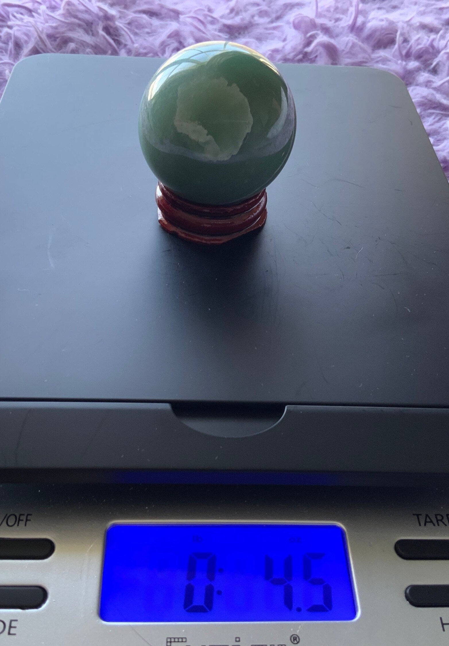 Aventurine crystal ball/sphere is 4.5 oz with the wooden stand. It measures approximately 1.8” in diameter. There are several photos showing multiple views of this magical crystal ball.