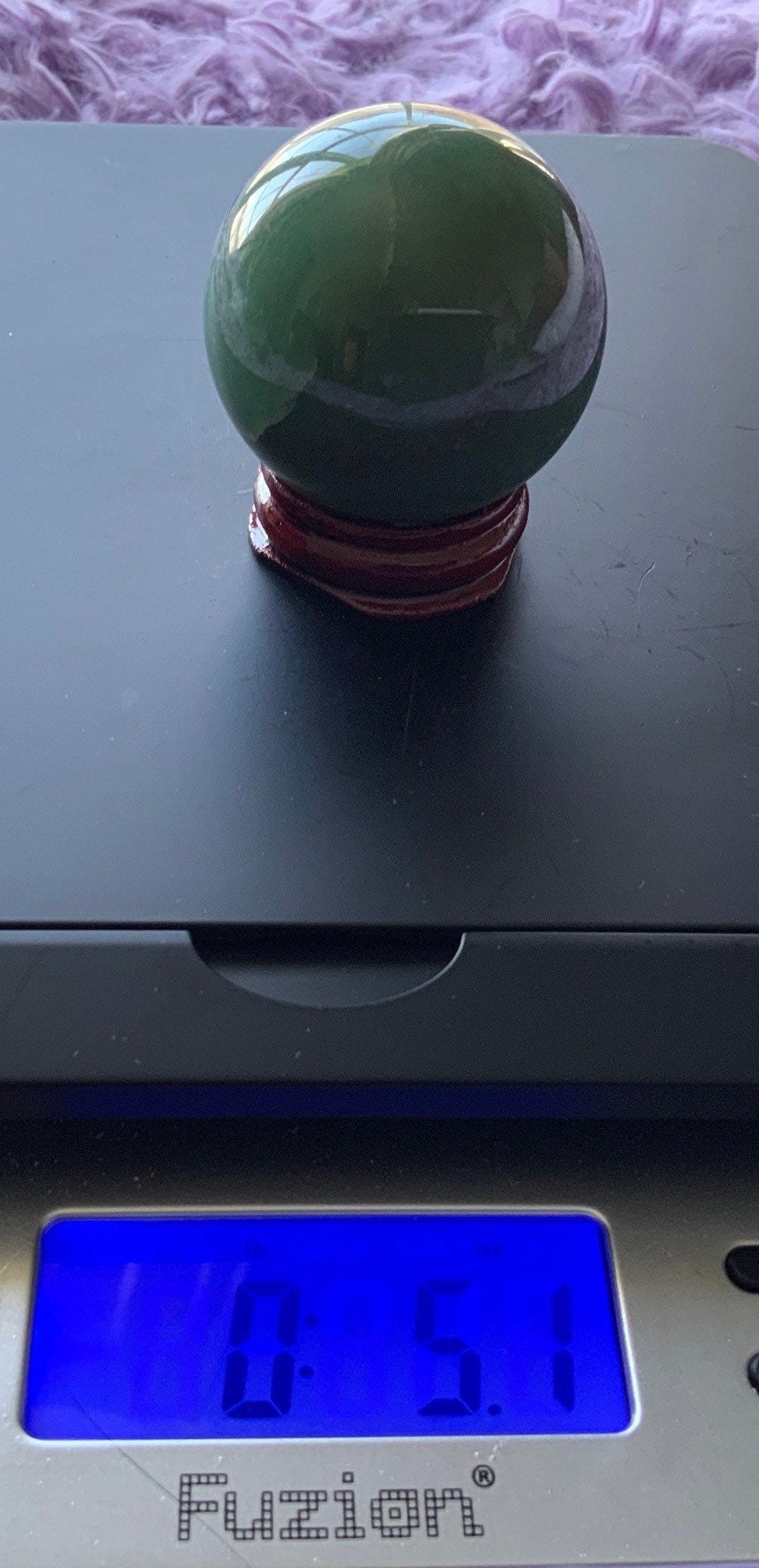 Aventurine crystal ball/sphere is 5.1 oz with the wooden stand. It measures approximately 1.8” in diameter. There are several photos showing multiple views of this magical crystal ball. Please see all photos for details.