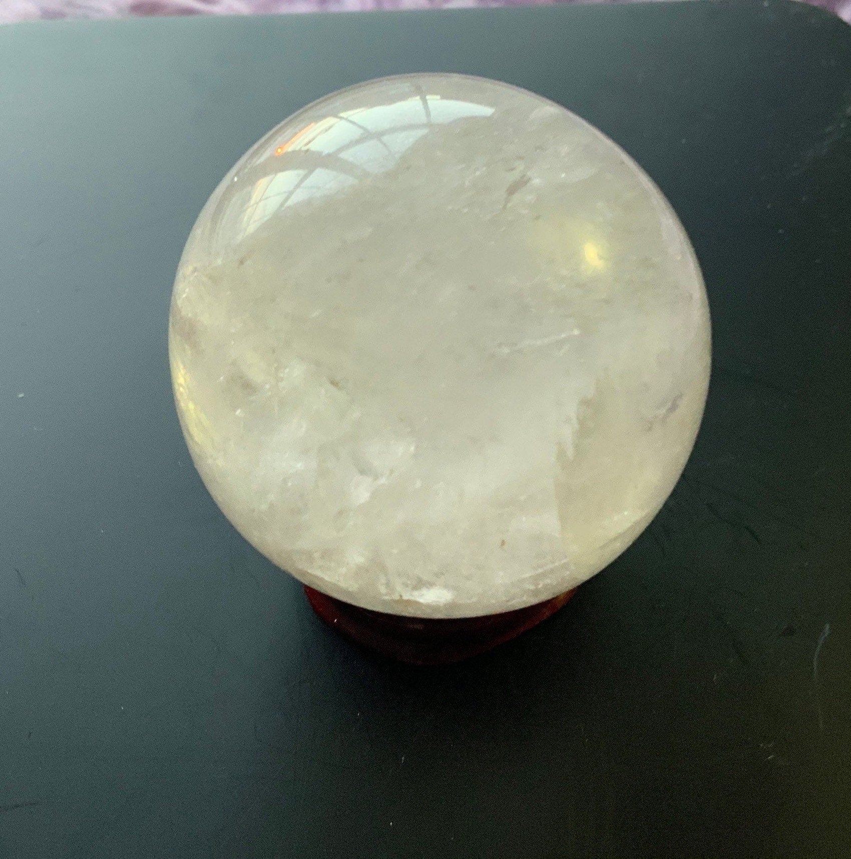 Crystal Clear Quartz crystal ball/sphere is 7.3 oz with the wooden stand. It measures approximately 2” in diameter. There are several photos showing multiple views of this magical crystal ball. Please see all photos for details.