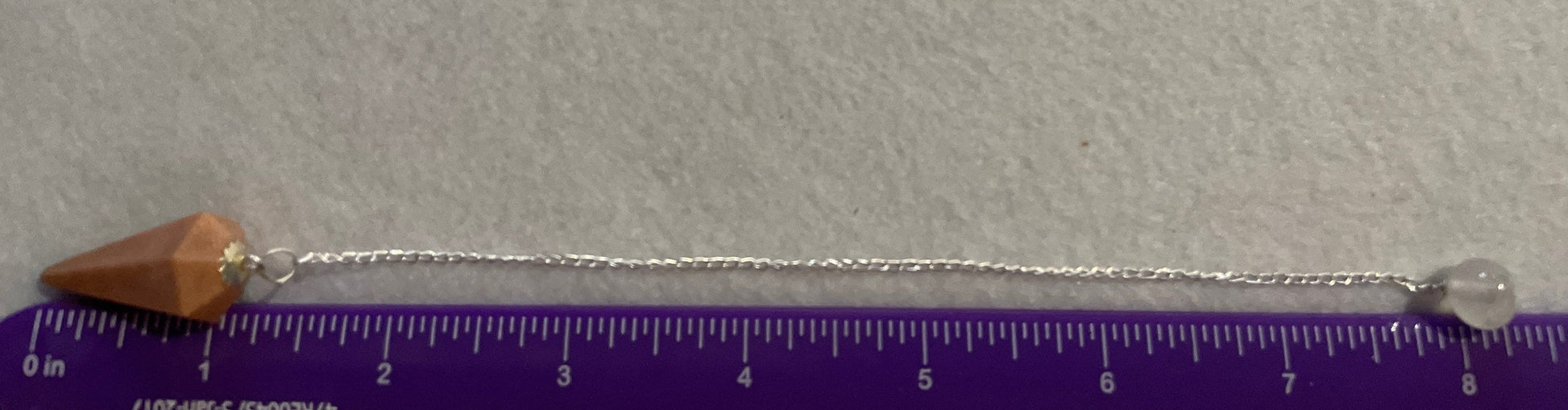 This beautiful Carnelian Pendulum is 1.25” and 8.25” with chain. Please look at all pictures to see all sides of this pendulum. Color variations may differ due to computer resolution.