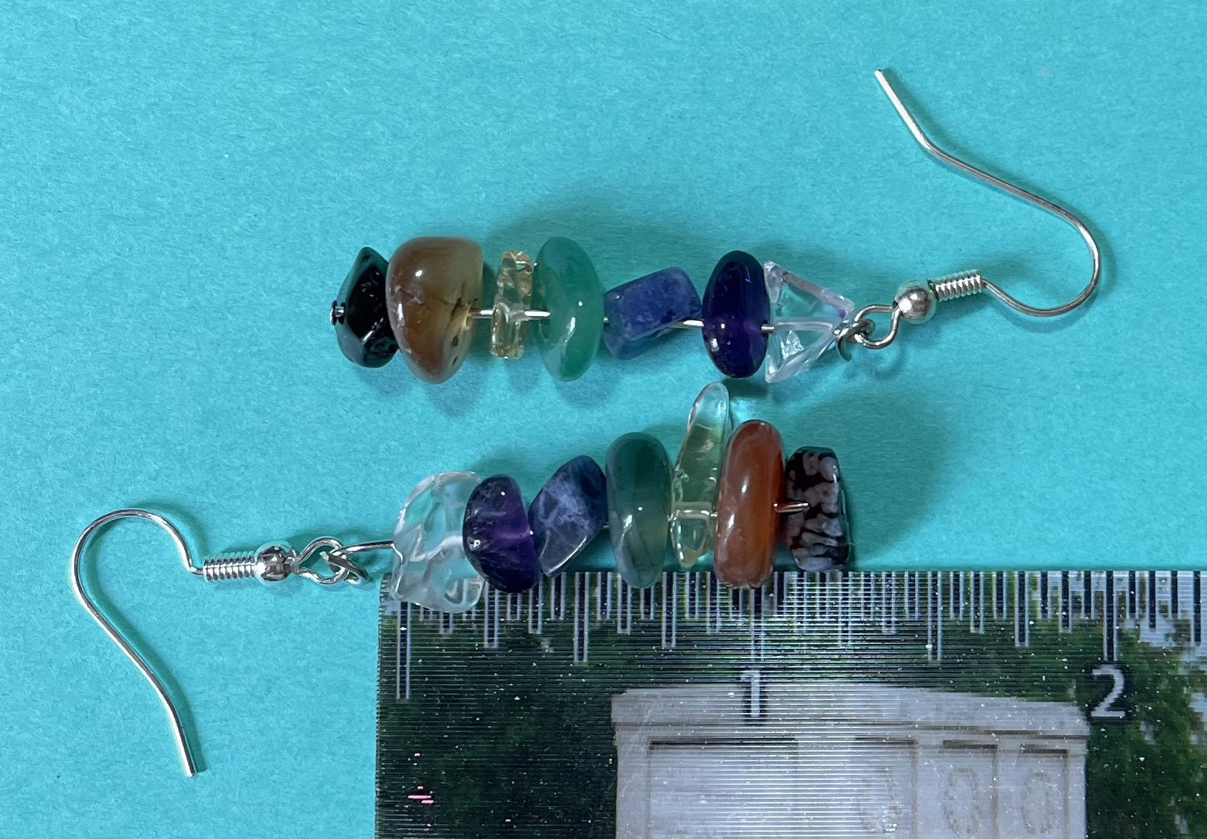 There are 7 main CHAKRA ENERGY CENTERS on the body. When these ENERGY CENTERS are open & are functioning correctly, you will feel a sense of well being on all levels: body, mind & spirit. Natural gemstones can be used to make corrections in the body & strengthen the CHAKRES since they are known to have healing properties. Certain colors & gemstone types are used for each CHAKRA. Chakra stones are used for both healing & energizing the entire body or certain areas that need help. Also, energizing & strengthening the body at the same time as the mind can assist both in maximizing their healing on a day to day basis & give them the ability to maintain it. To cleanse the stones, place in the light of the FULL moon or in sea salt. Also, placing stones with clear quartz crystal will work. Your earrings have been created with: Clear Quartz – Crown Chakra – Purple Amethyst – 3rd Eye Chakra – Blue Sodalite – Throat Chakra – Green Agate – Heart Chakra -Citrine – Solar Plexus Chakra – Orange Carnelian – Sacral Hara Chakra – Snowflake Obsidian – Root Chakra.