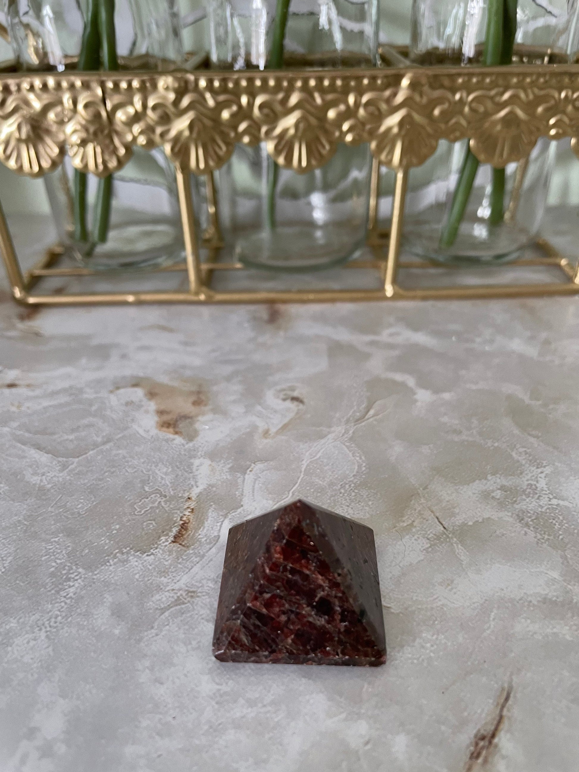 This flawless Garnet Pyramid is BEAUTIFUL! It measures approximately 1”. There are several photos showing multiple views. Please see all photos for details. Your pyramid is randomly selected. Included with your crystal in a drawstring bag, cleansing and care instructions and crystal properties card.