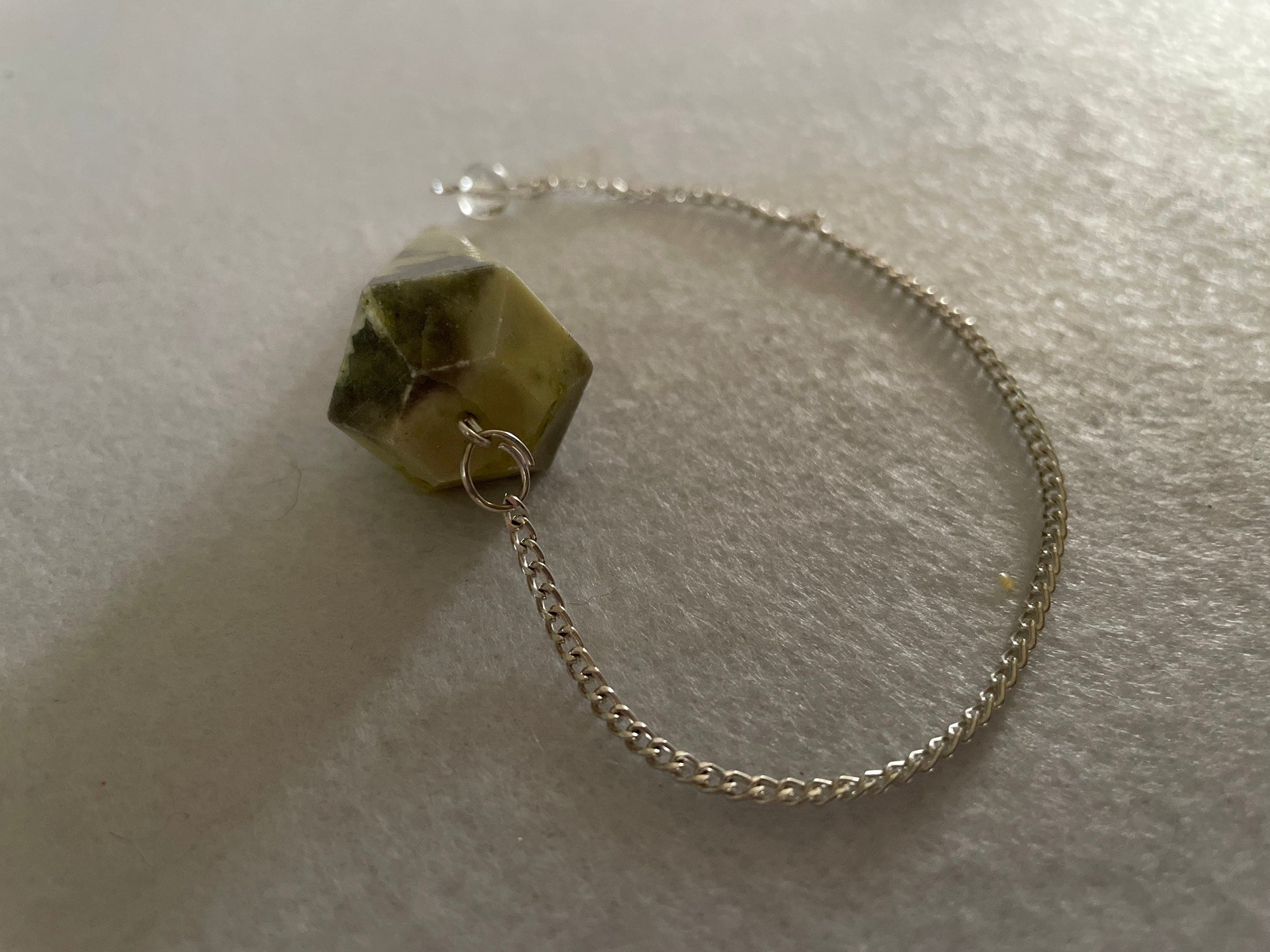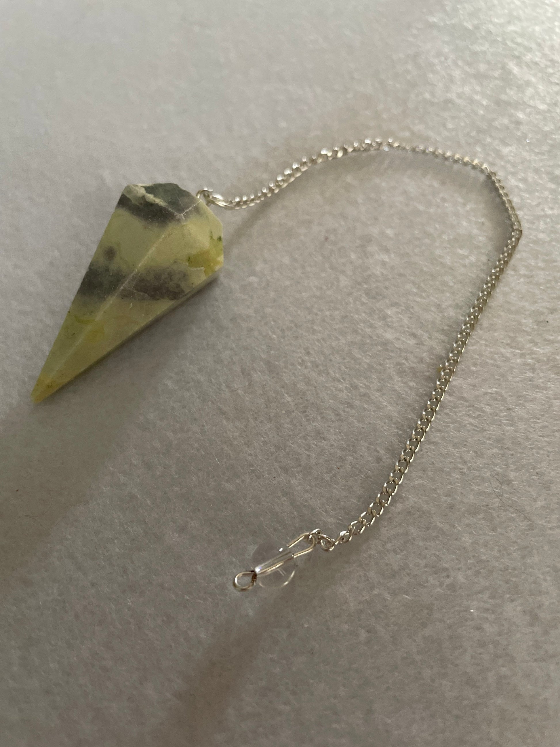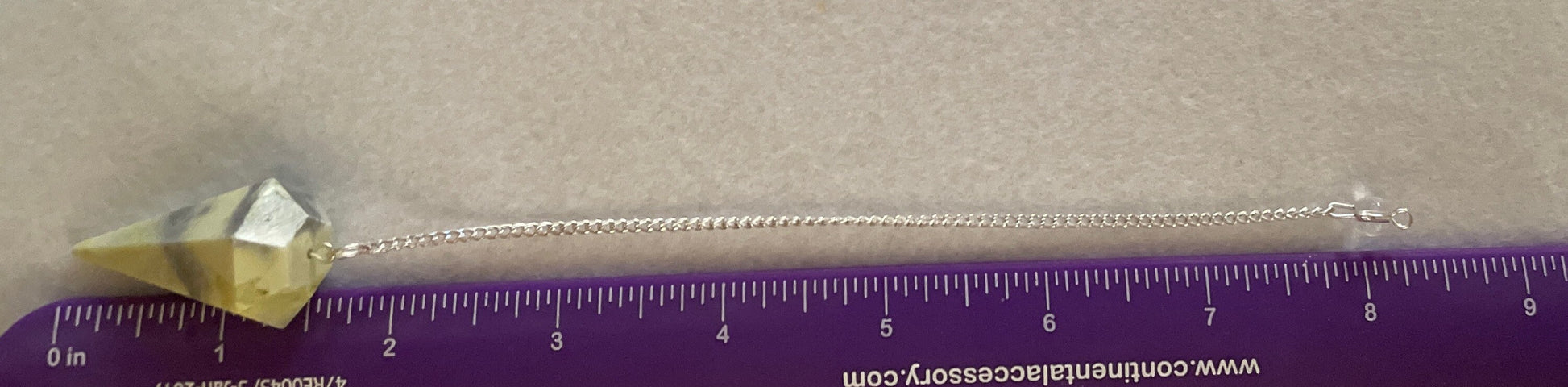 This beautiful Serpentine Pendulum is 1.85” and with chain is 8.5”. Please look at all pictures to see all sides of this pendulum.