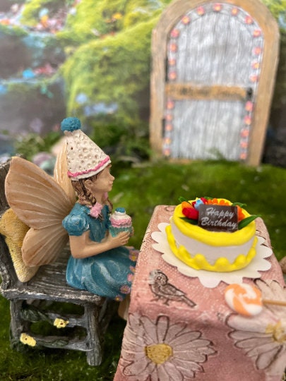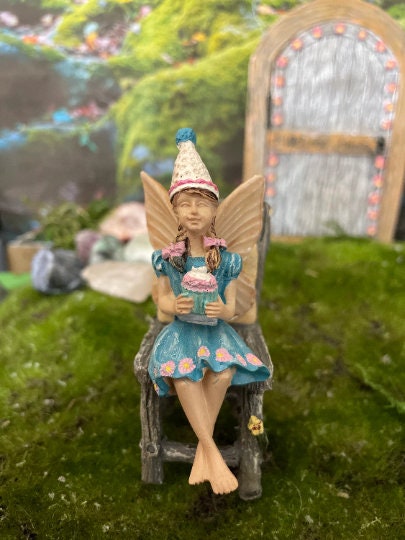 It’s a birthday party! This sweet fairy is having a birthday party with her friends. She wearing a sweet blue dress lined with pink flowers. On her head sits her party hat! Her long brown hair lays in pigtails on her shoulders. In her hands, she holds a cupcake!