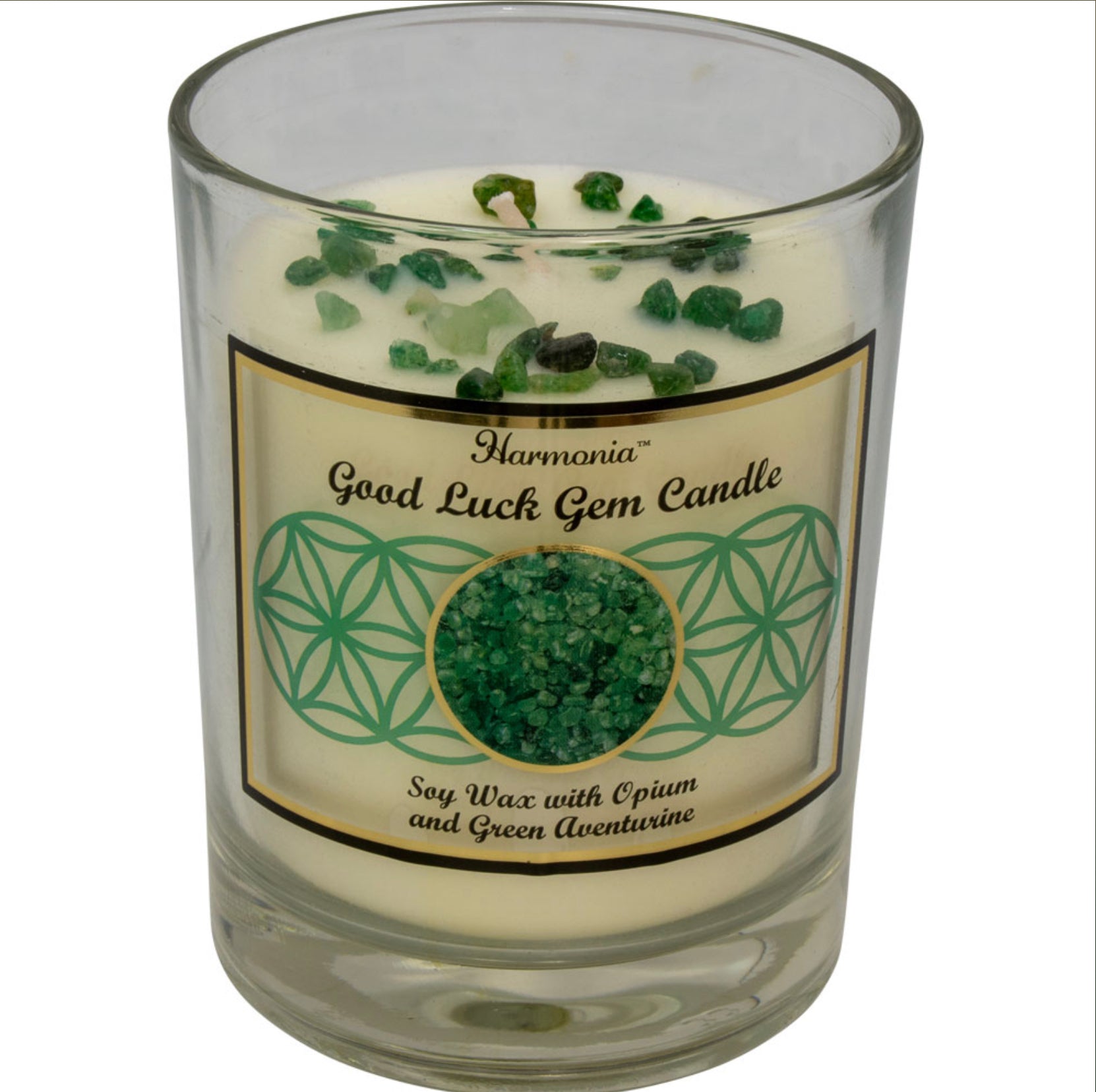 We all need a little extra Good Luck. This natural soy filled Harmonia Gem candle is accented with imported French Opium fragrance oil and sprinkled with Green Adventurine pieces. The lead free wick and metal-lined wood lid add to the quality.