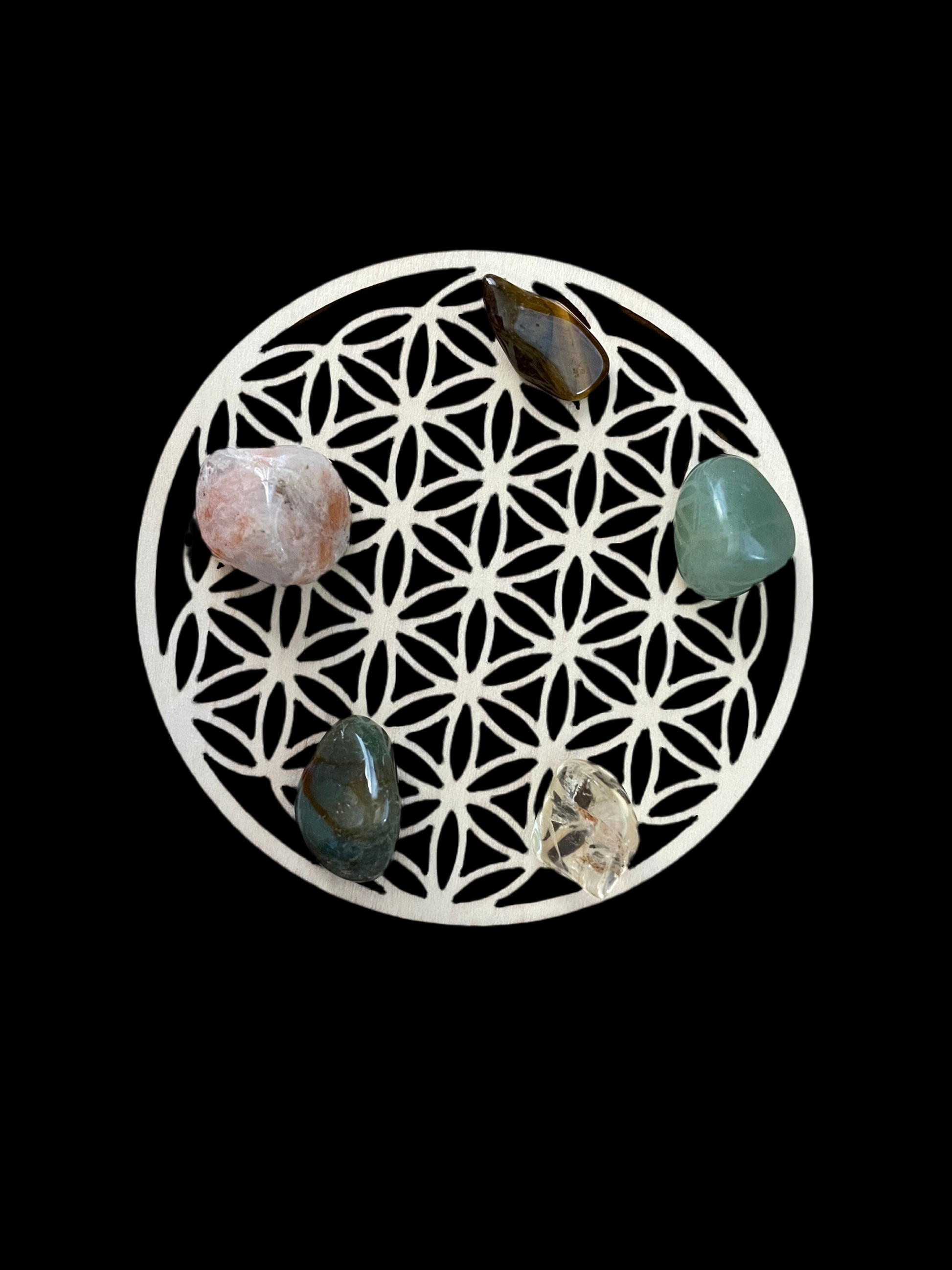 You will receive assistance in manifesting prosperity in your life with this Crystal set and flower of life grid. Use in meditation and grid energy, it aides in prosperity. Set consists of 5 tumbled crystals known to increase your prosperity and 1 Quartz point for activating your flower of life 3.5” grid. Because Crystal are a raw material, sizes will vary. They will come package in a pretty gold pouch with a Prosperity Empowerment Crystal card and programming instructions included.
