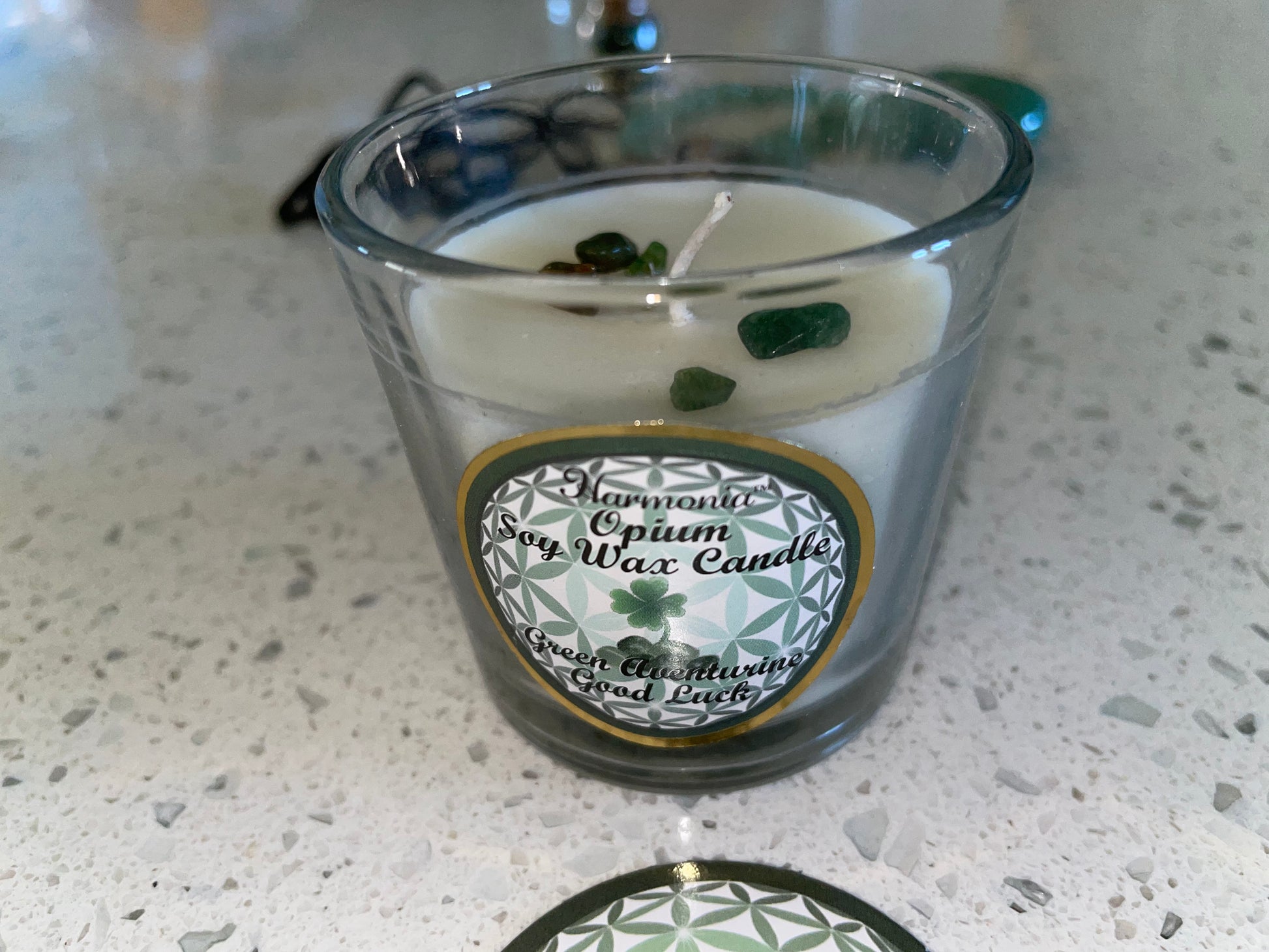 ONE 67 GM, GREEN AVENTURINE, GOOD LUCK, SOY WAX, OPIUM CANDLE TOO! This candle will burn for 14 hours and has a lead-free wick.