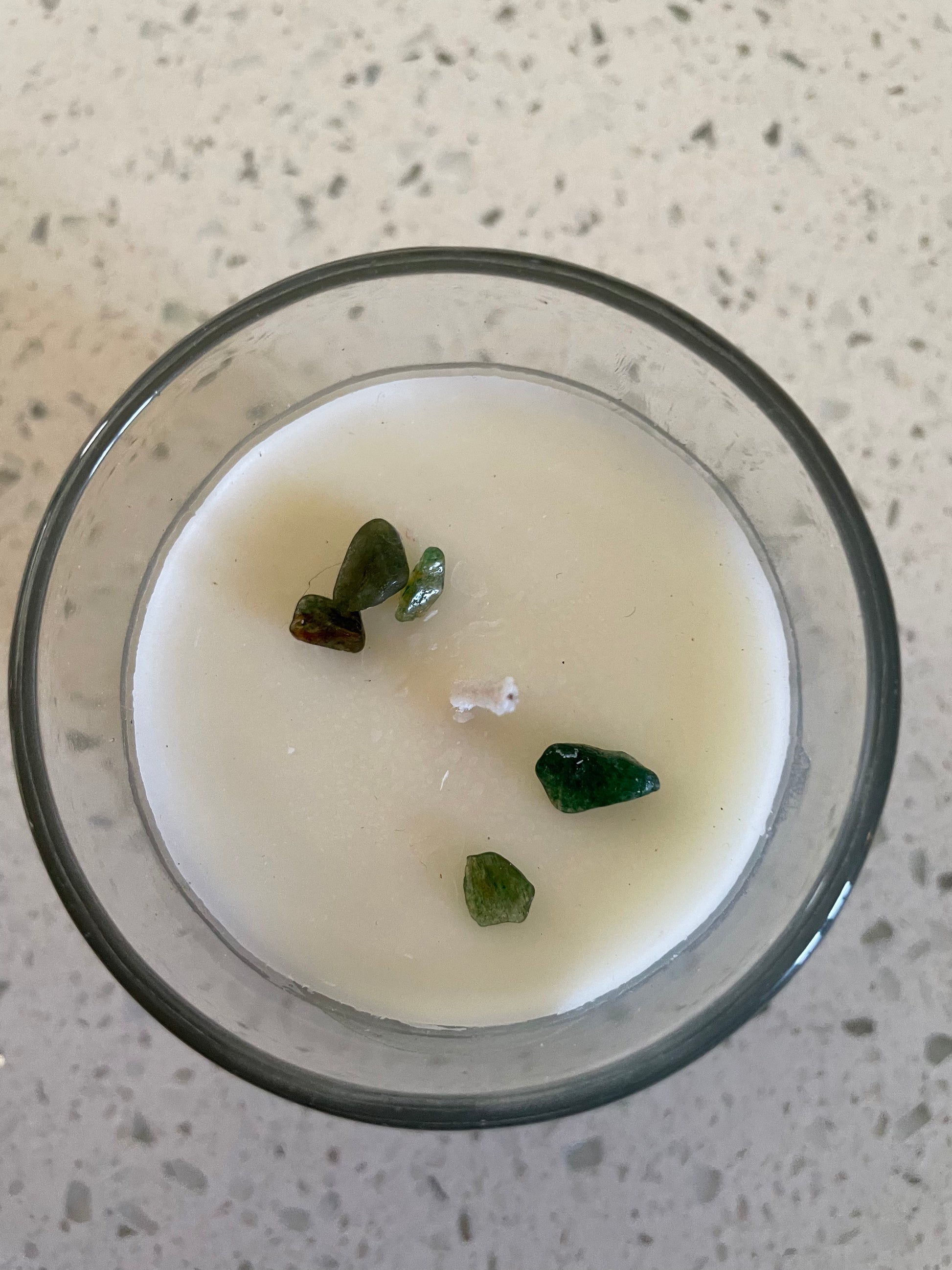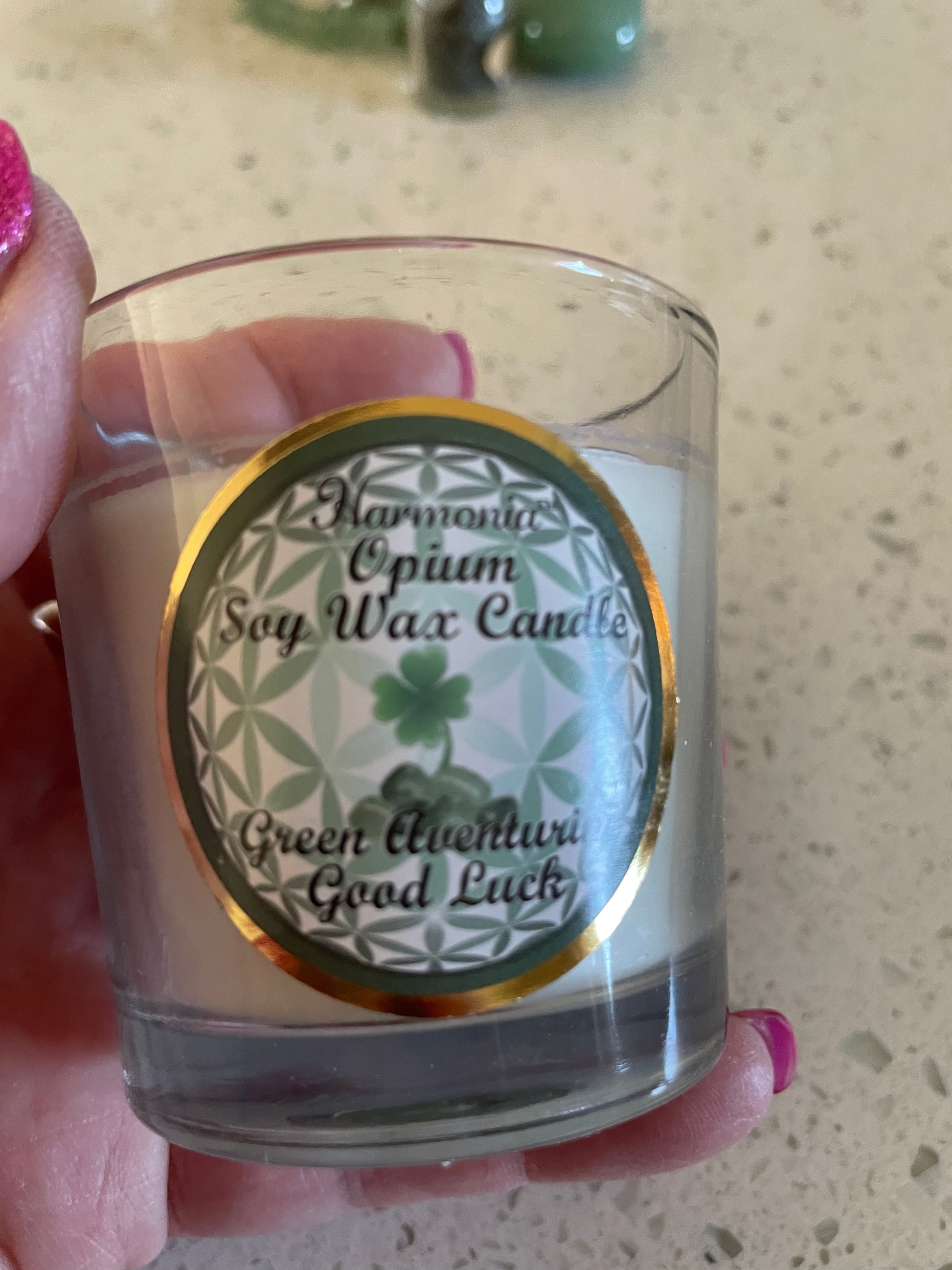 ONE 9 OZ., GREEN AVENTURINE, GOOD LUCK, SOY WAX, OPIUM CANDLE This candle will burn for 46 hours and has a lead-free wick.