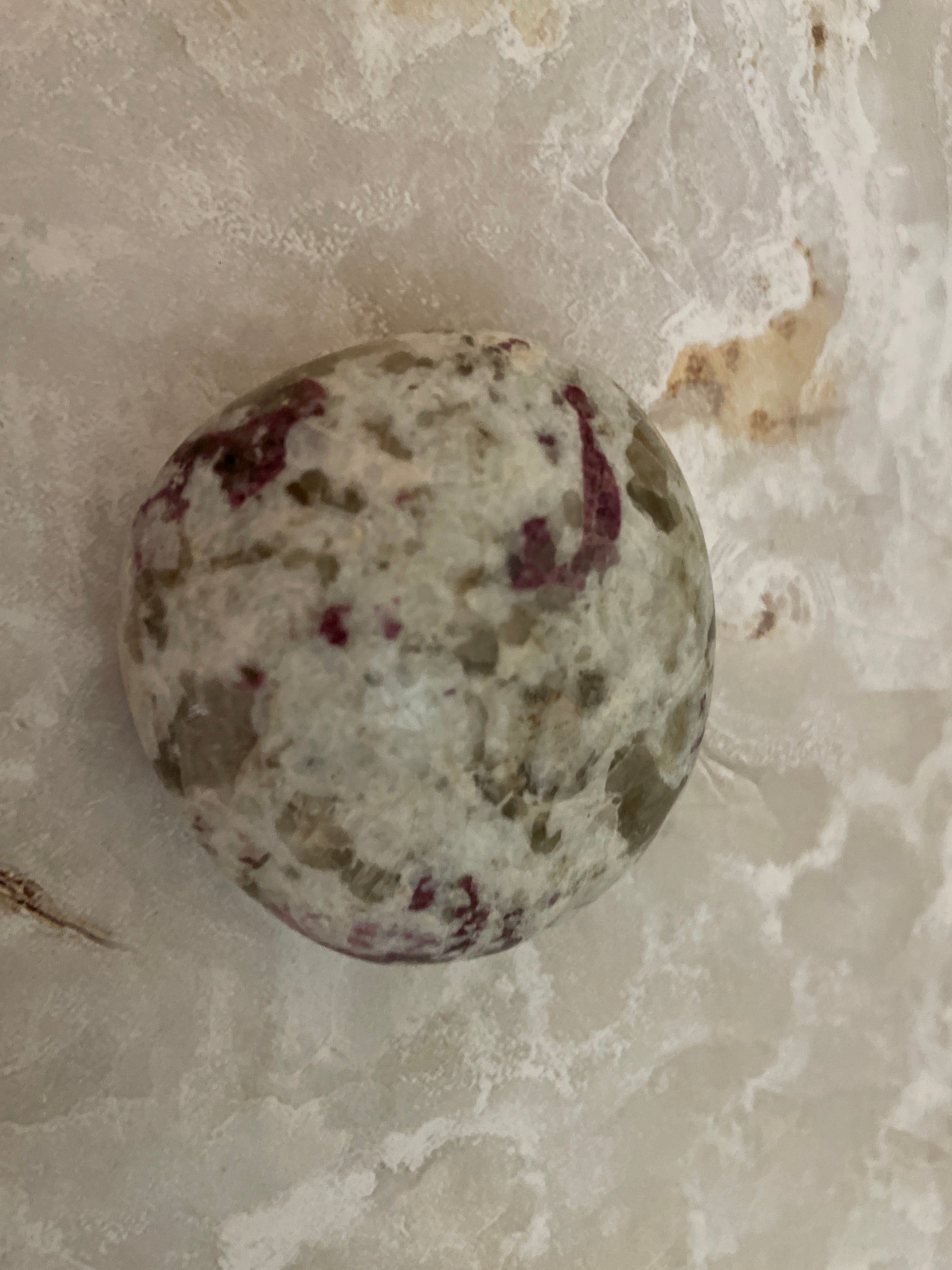 Ruby in Feldspar palm stone weighs 5.2 ounces.