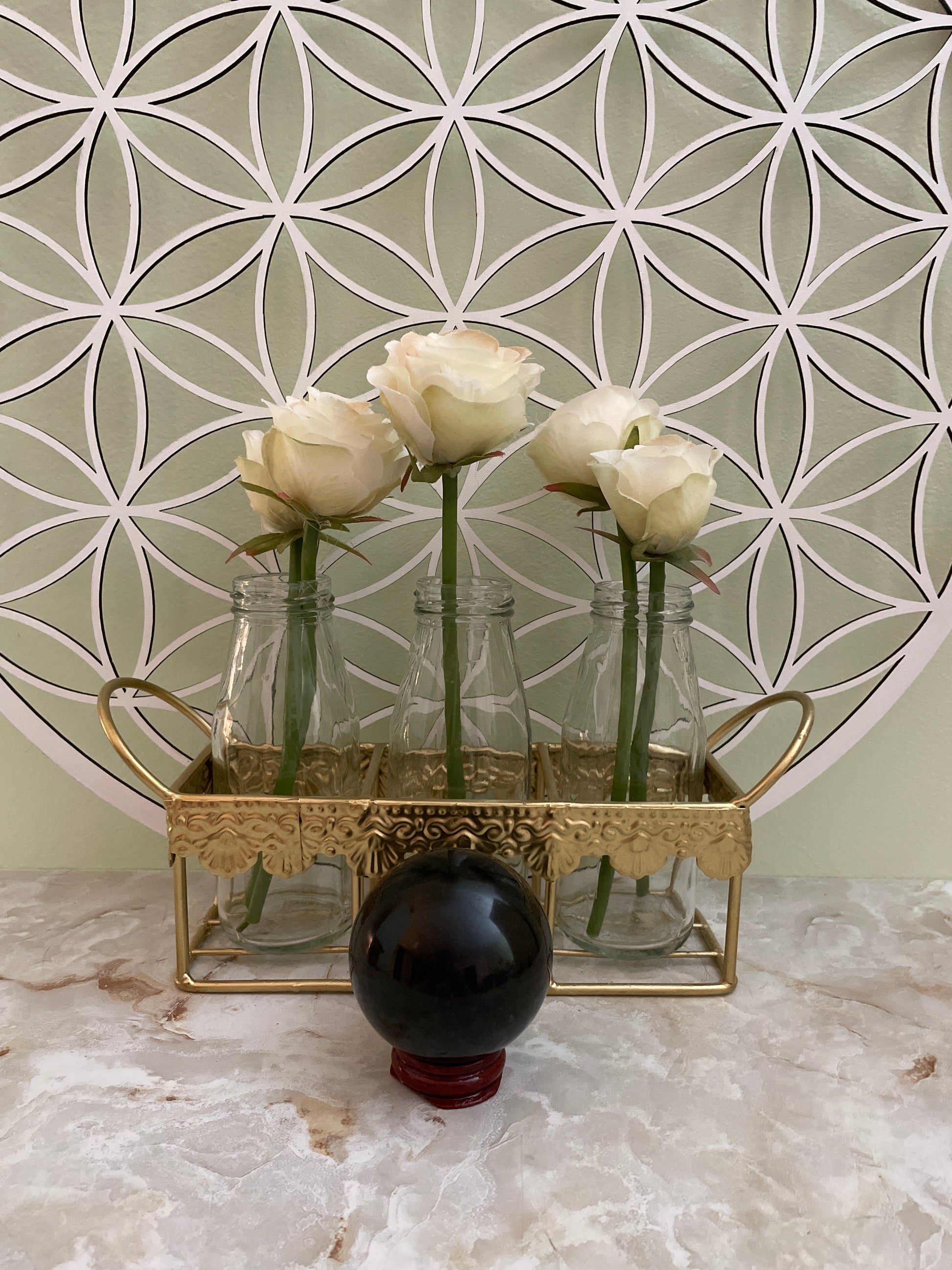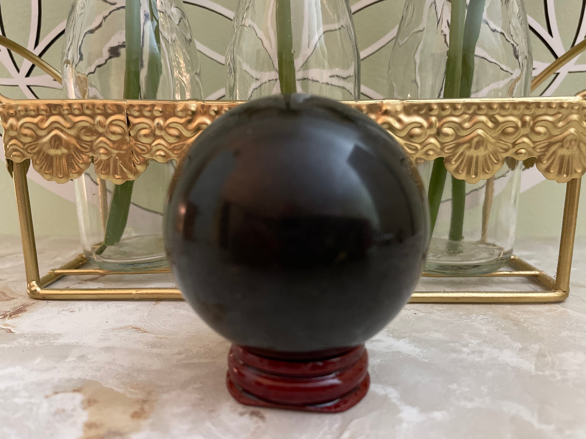 Black Tourmaline absorbs negativity at such a high level that it should be cleansed and re-charged often. This magnificent sphere is approximately 2 3/8” in diameter and weighs 12.2 ounces with its wood stand.