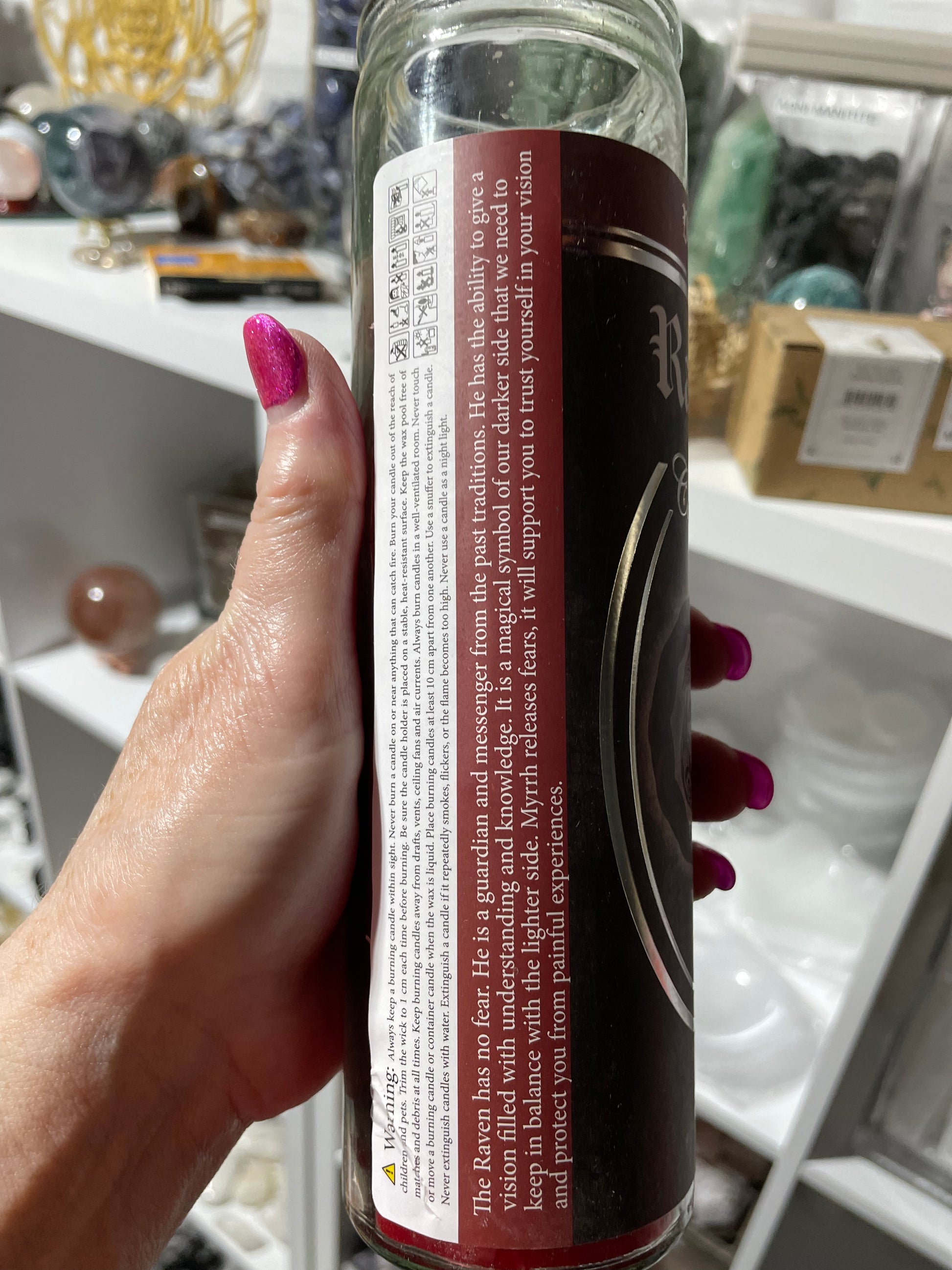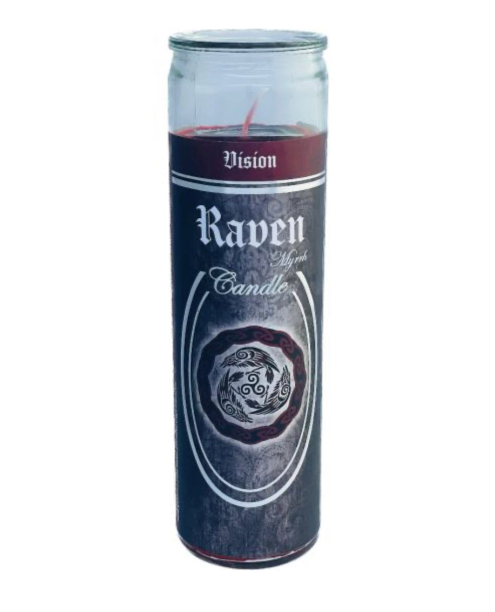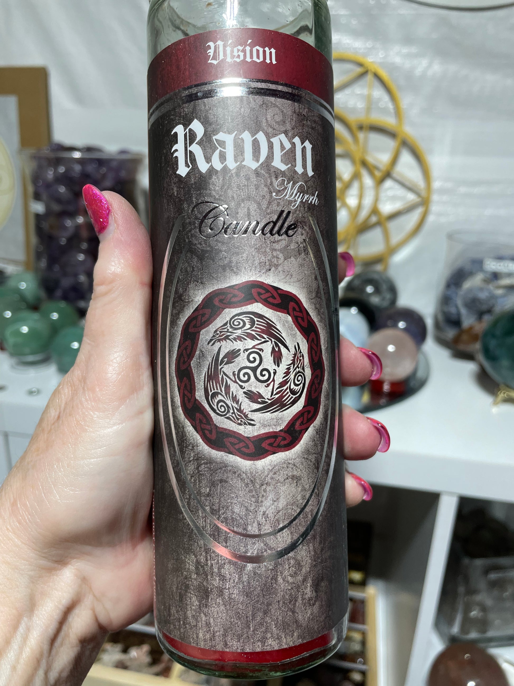This Raven 7 Day Glass Ritual Candle enhanced with the scent of Cleansing Myrrh will help to open the way for Vision and messages from the otherworlds.