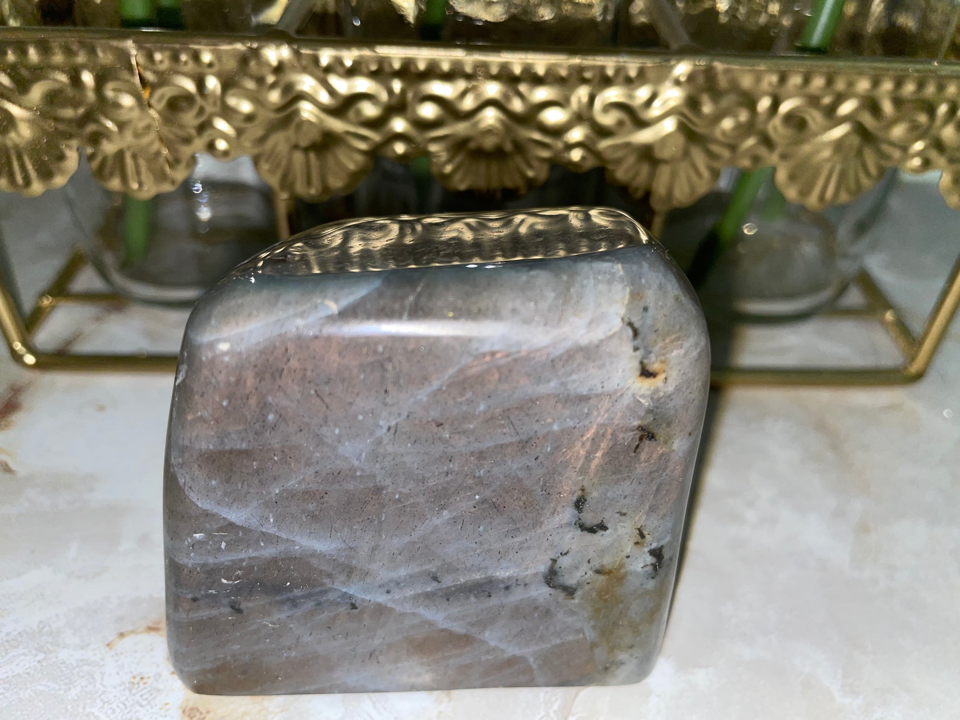 Labradorite free form weighs 14.1 ounces and measures approximately 2.75” widest point, 2.5” at tallest point and 1.75 deep.