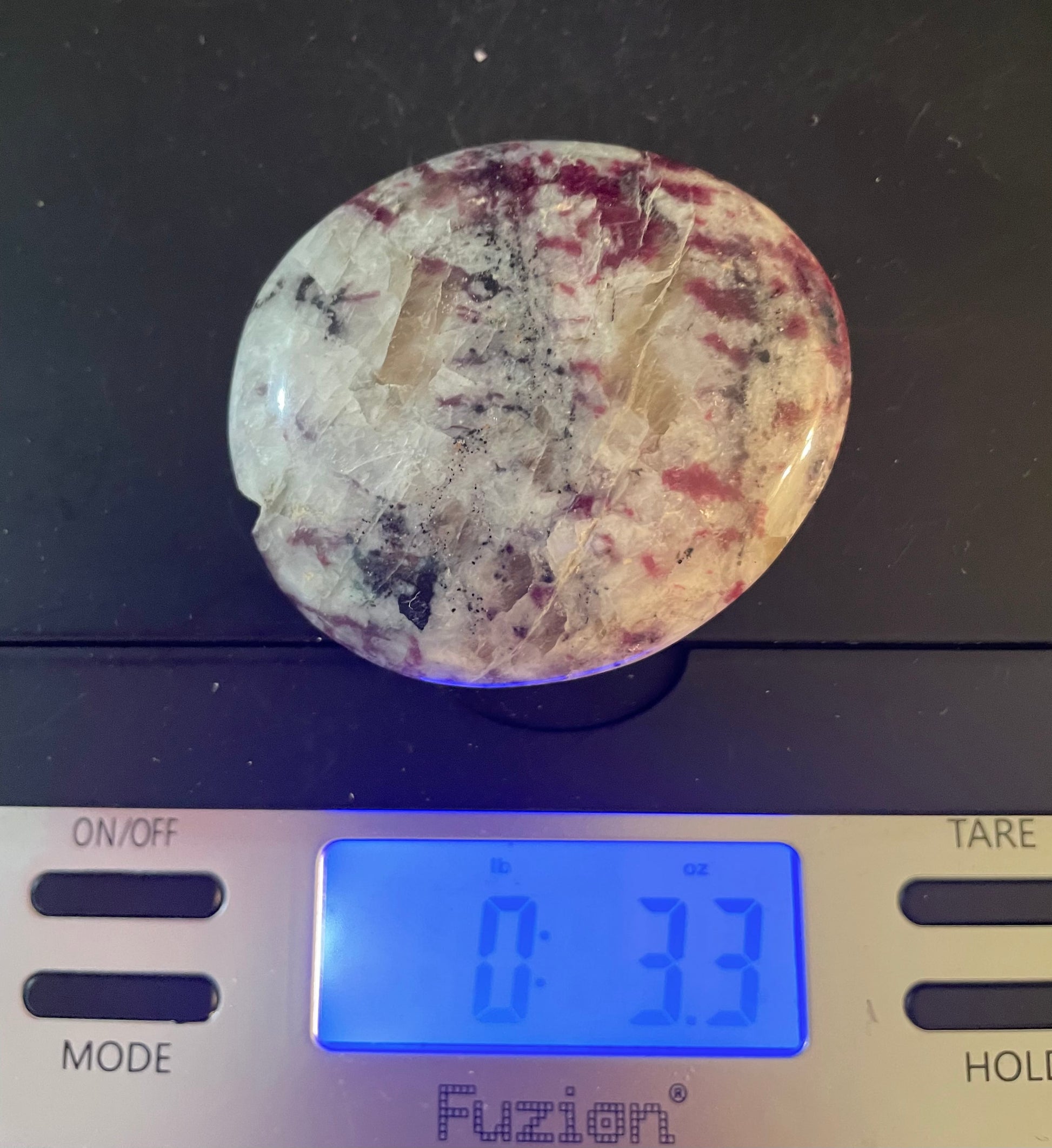 Ruby in Feldspar palm stone weighs 3.3 ounces.
