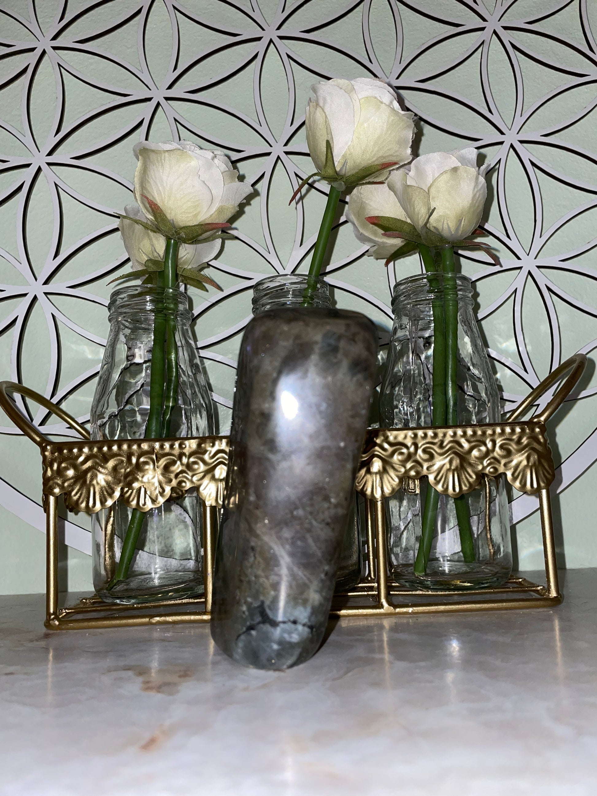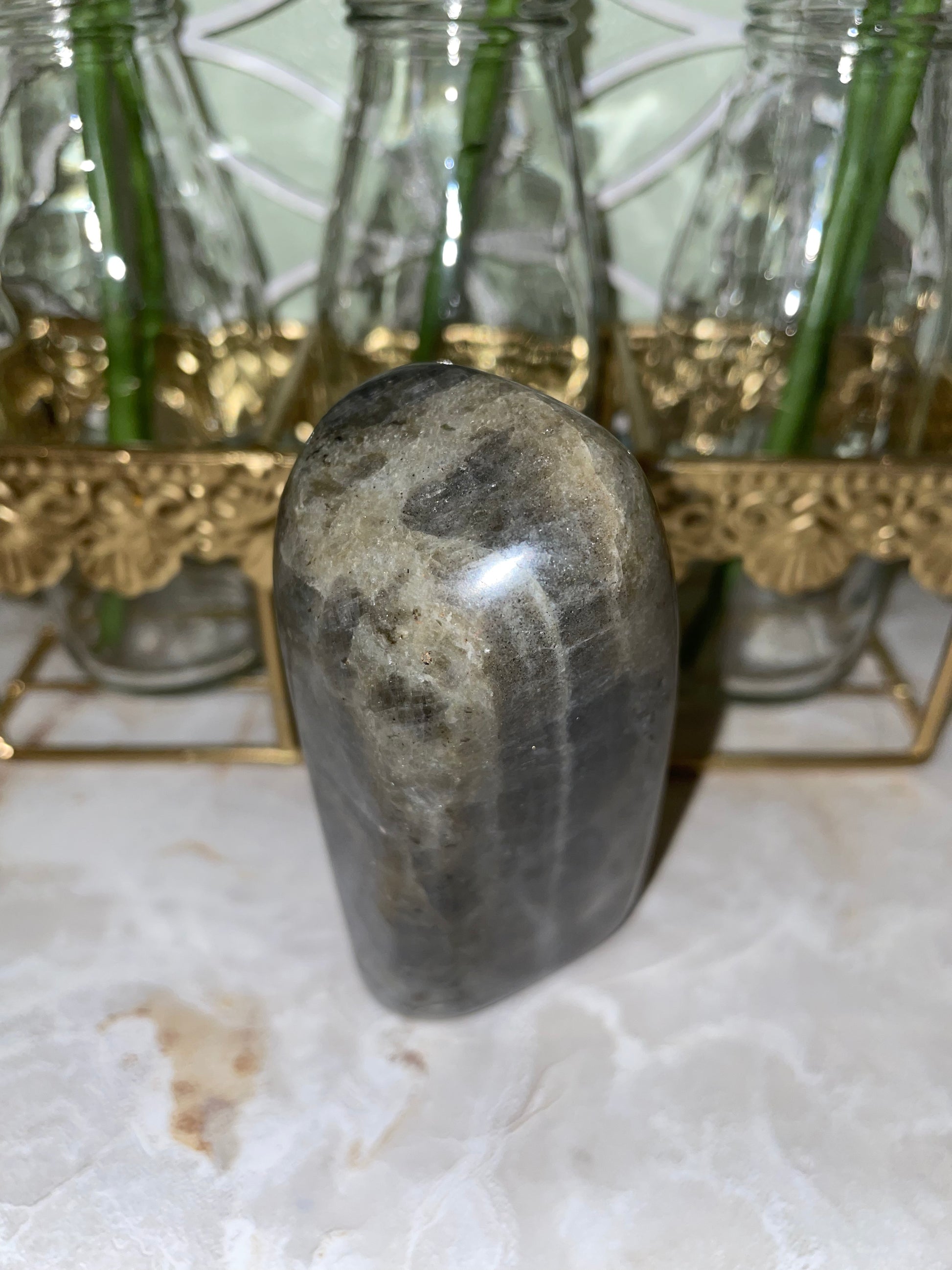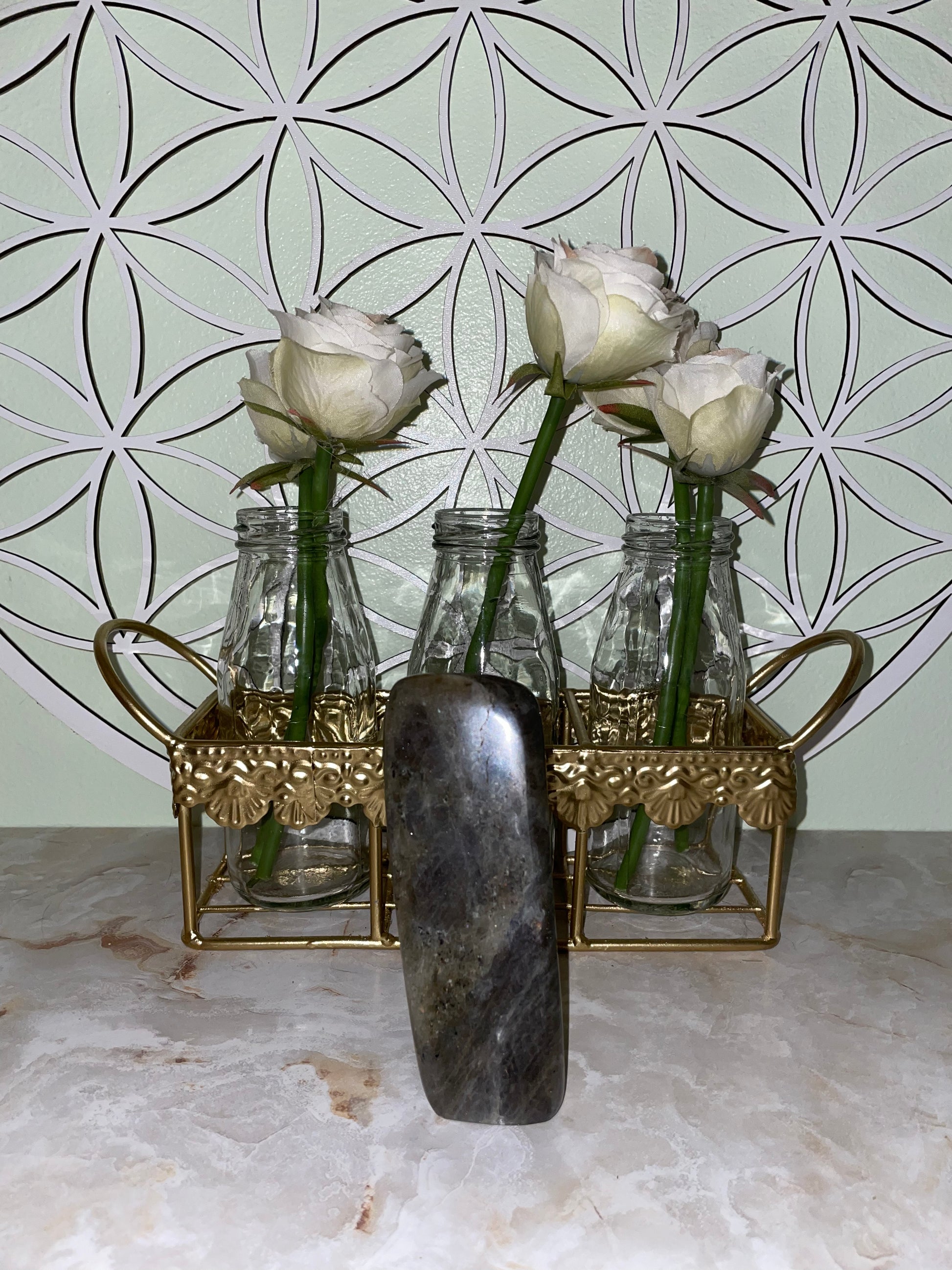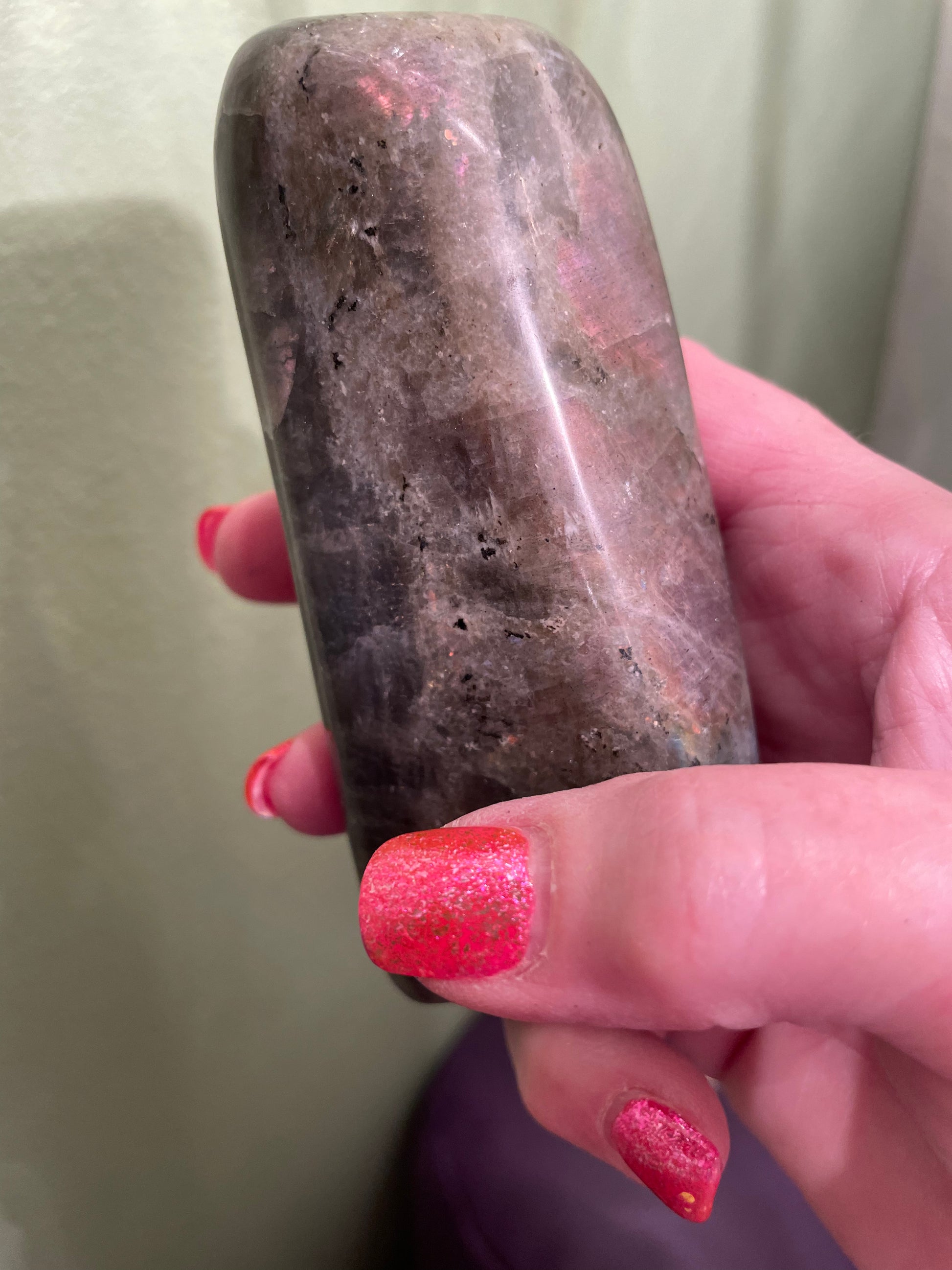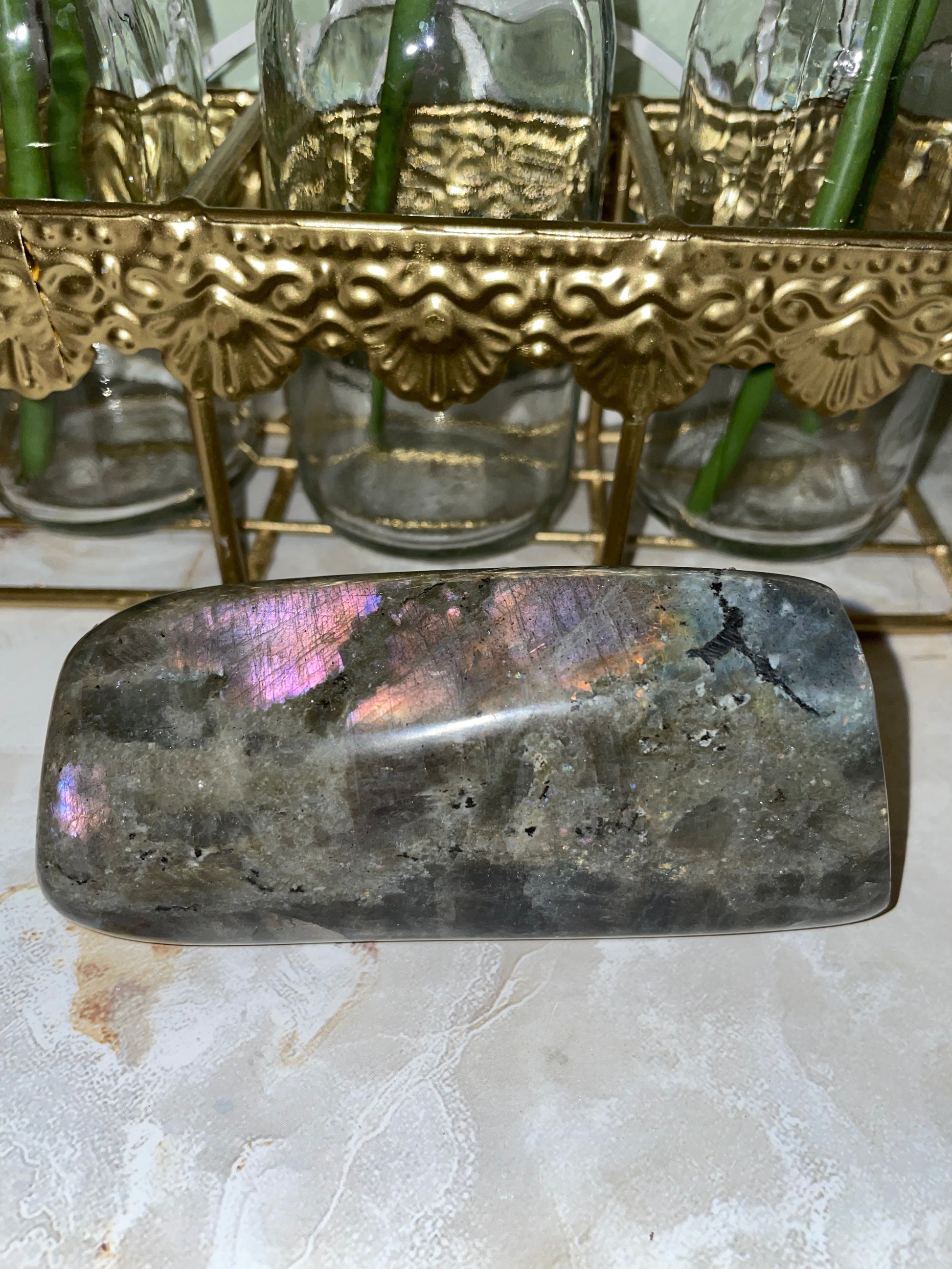 Labradorite free form weighs 12.7 ounces and measures approximately 2.” widest point, and 4.5” at tallest point.