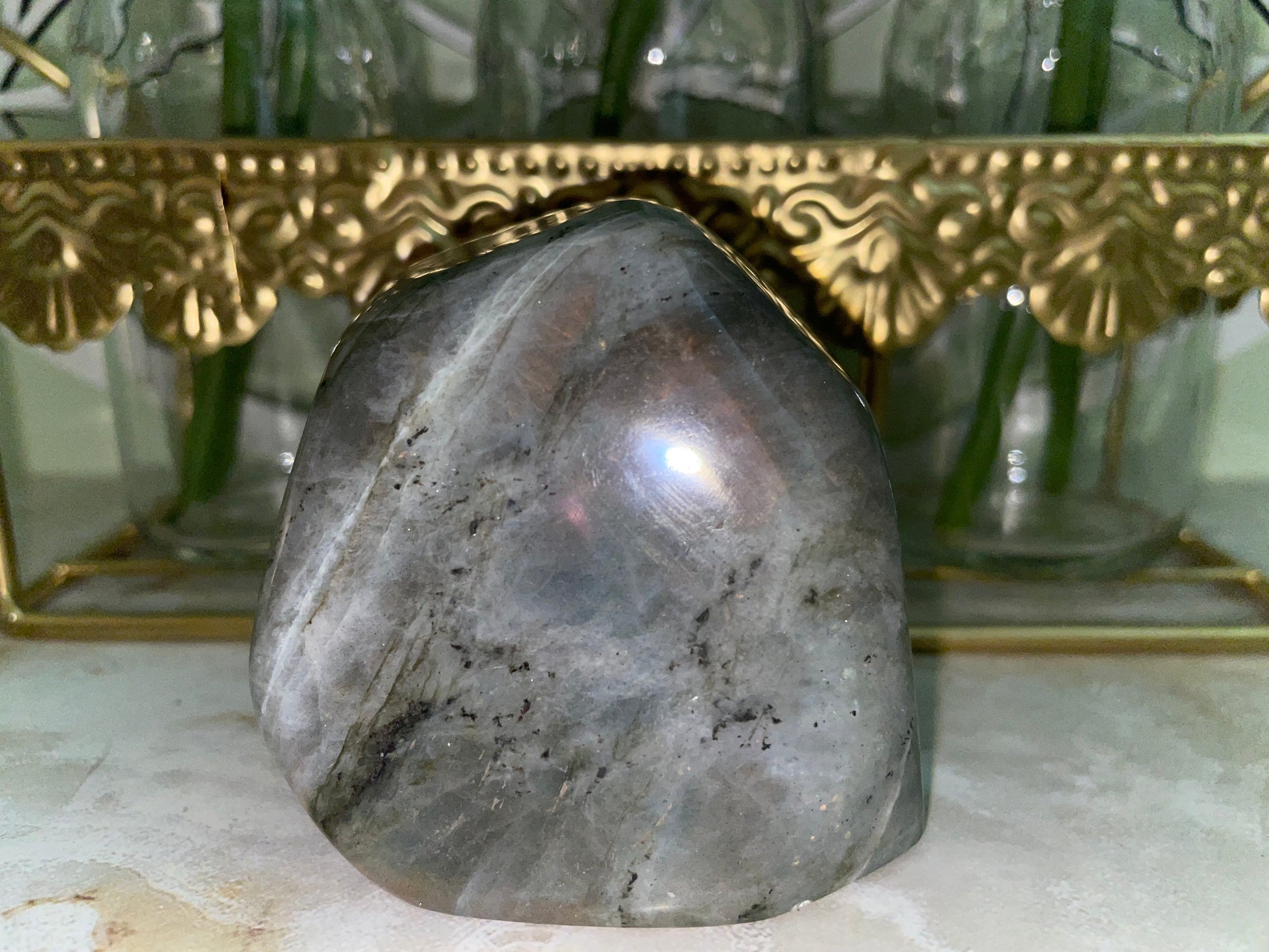Labradorite free form weighs 9 ounces and measures approximately 2.75” widest point, 2.5” at tallest point and 1.5” deep.