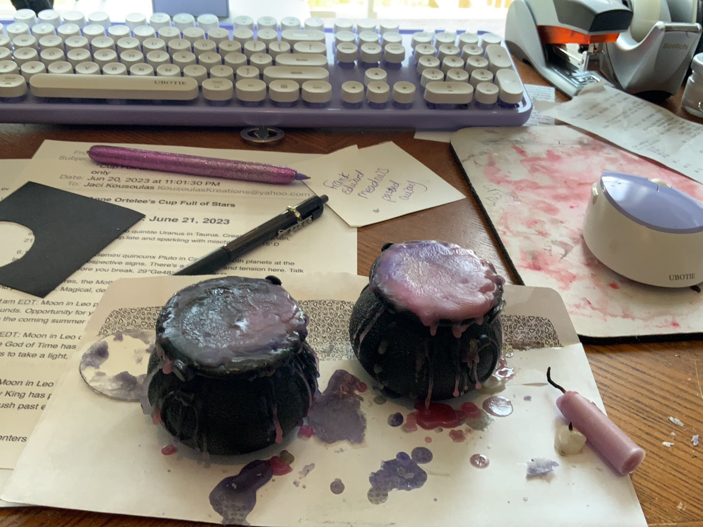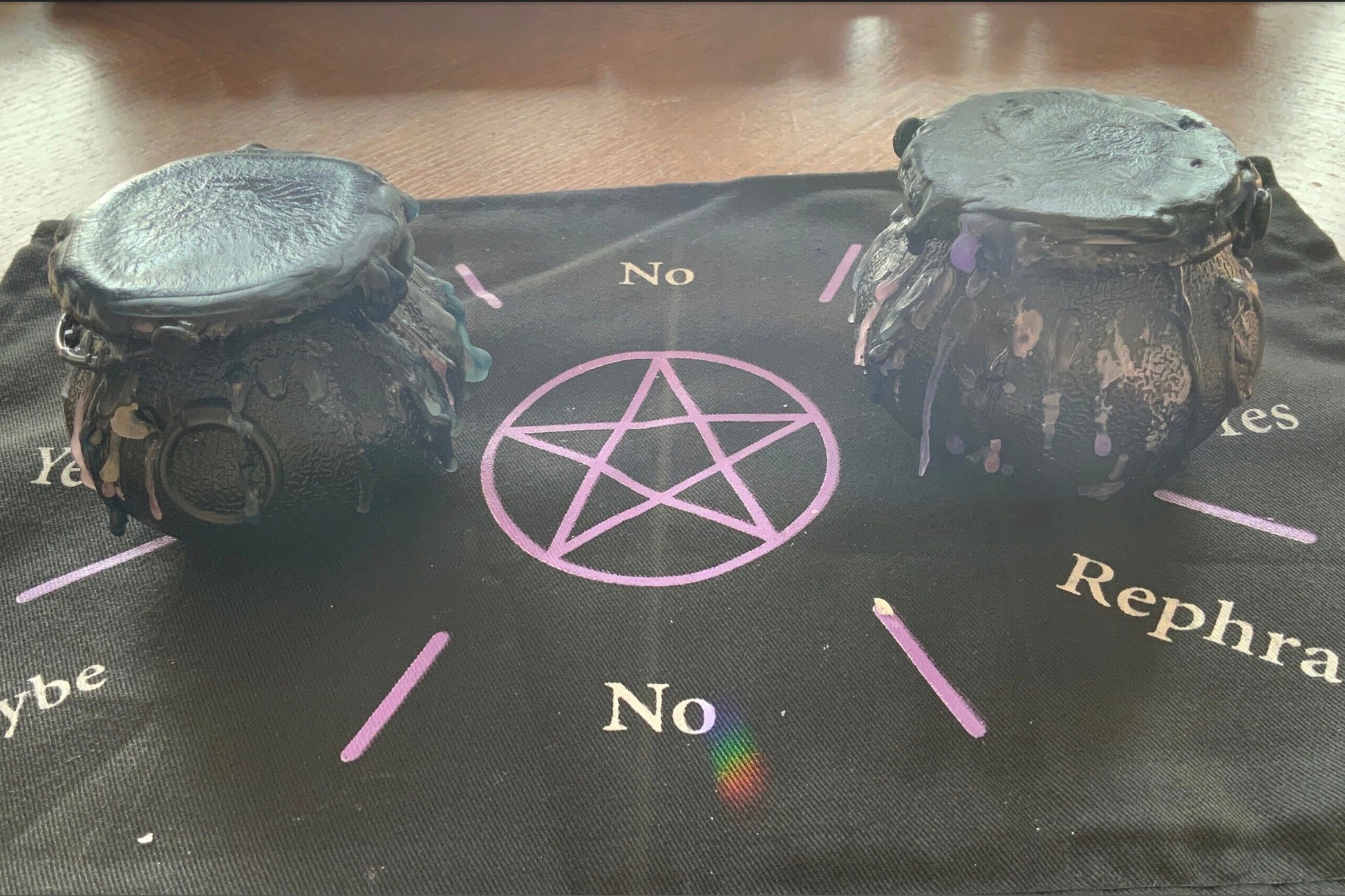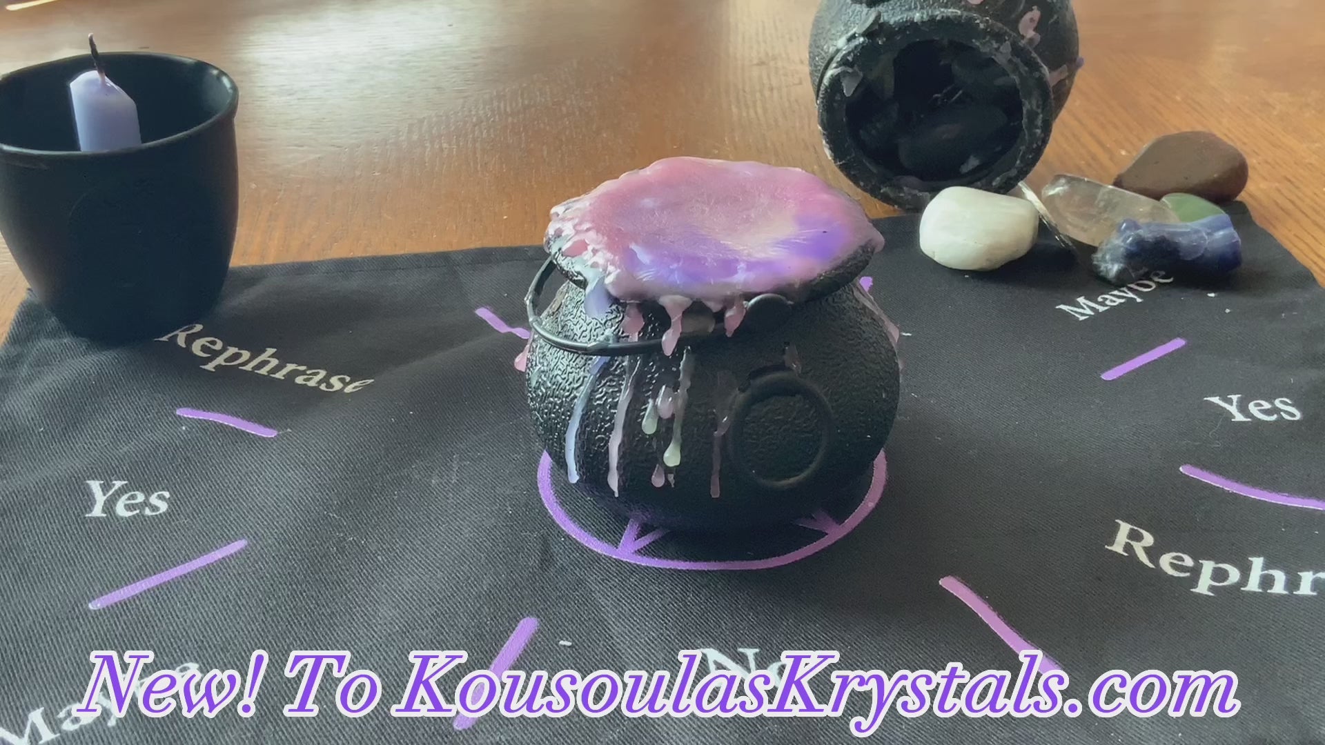 Crystal Confetti filled Black Witches Cauldron with at least piece of crystal jewelry and one uniquely shaped crystal inside, ie heart, mushroom, gnome, star, moon…