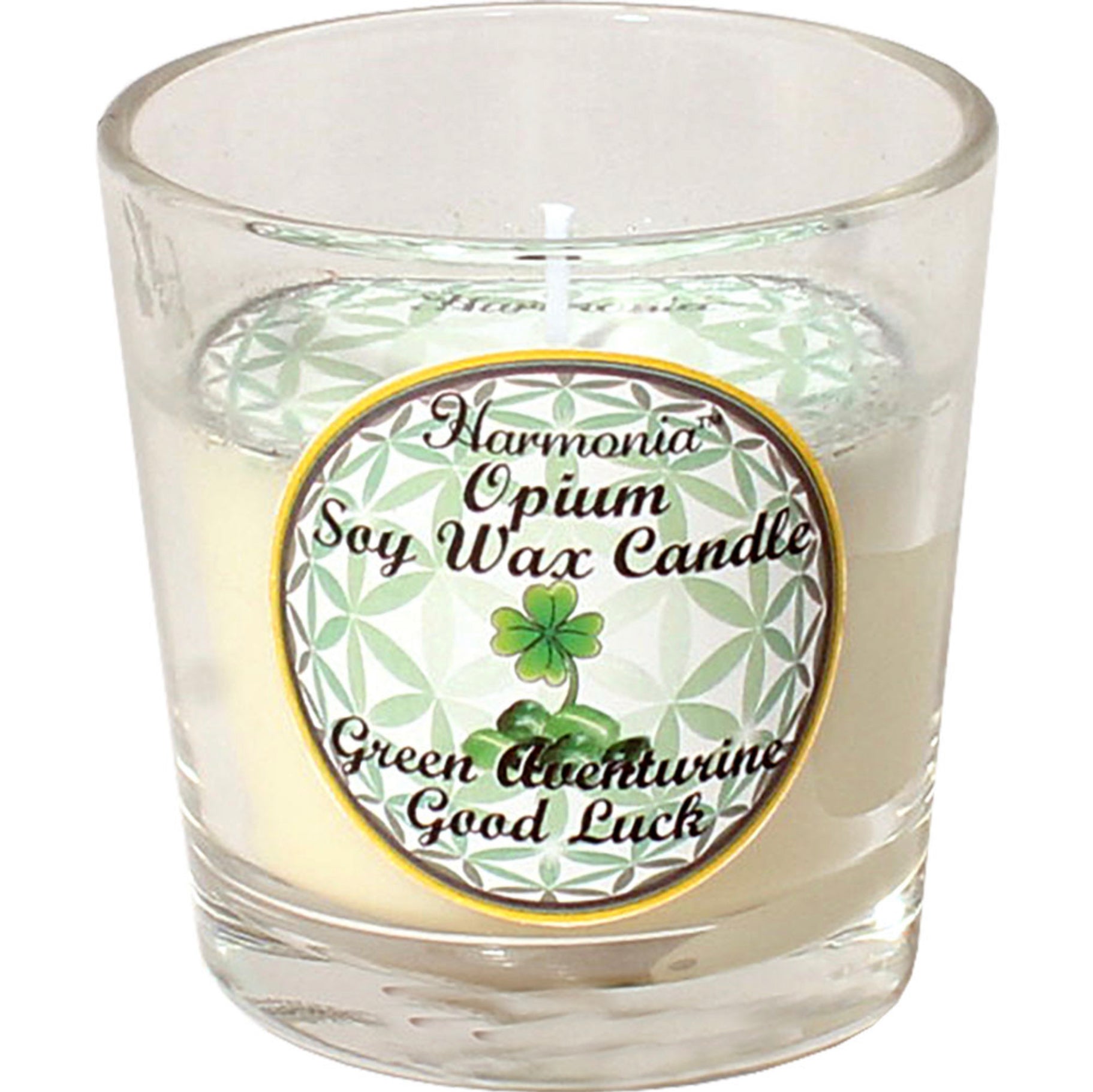 We all need a little extra Good Luck. This natural soy filled Harmonia Gem candle is accented with imported French Opium fragrance oil and sprinkled with Green Adventurine pieces. The lead free wick and metal-lined wood lid add to the quality.
