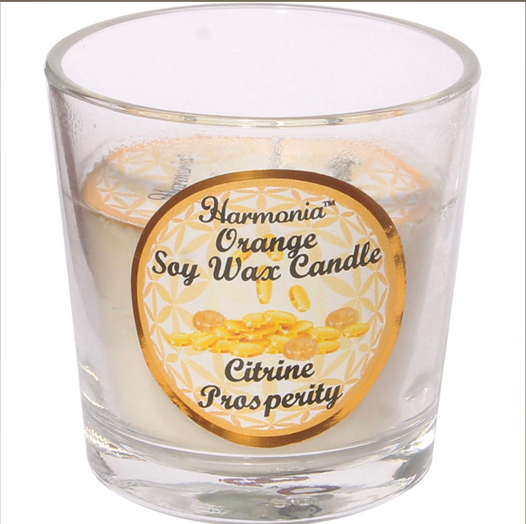Citrine and Orange candle. This natural soy filled Harmonia Gem candle is accented with Orange fragrance and sprinkled with Citrine pieces for prosperity. The lead free wick and metal-lined wood lid add to the quality.