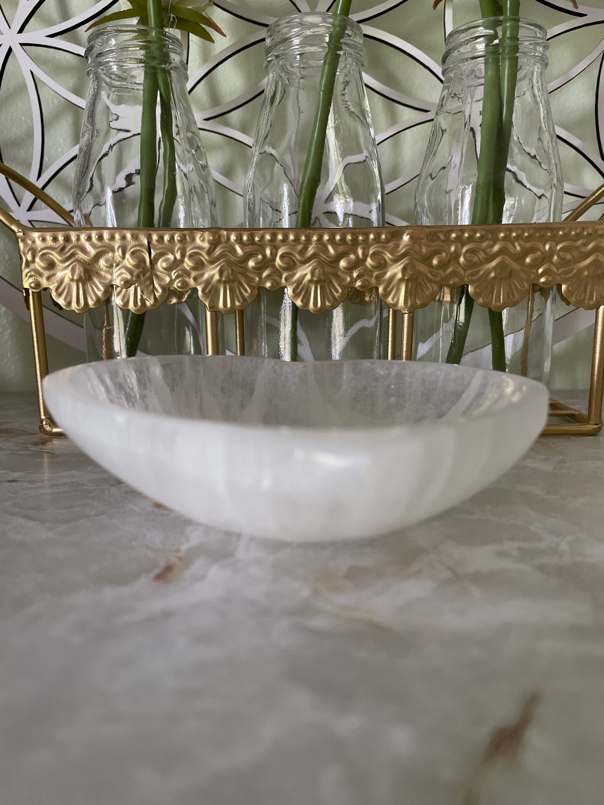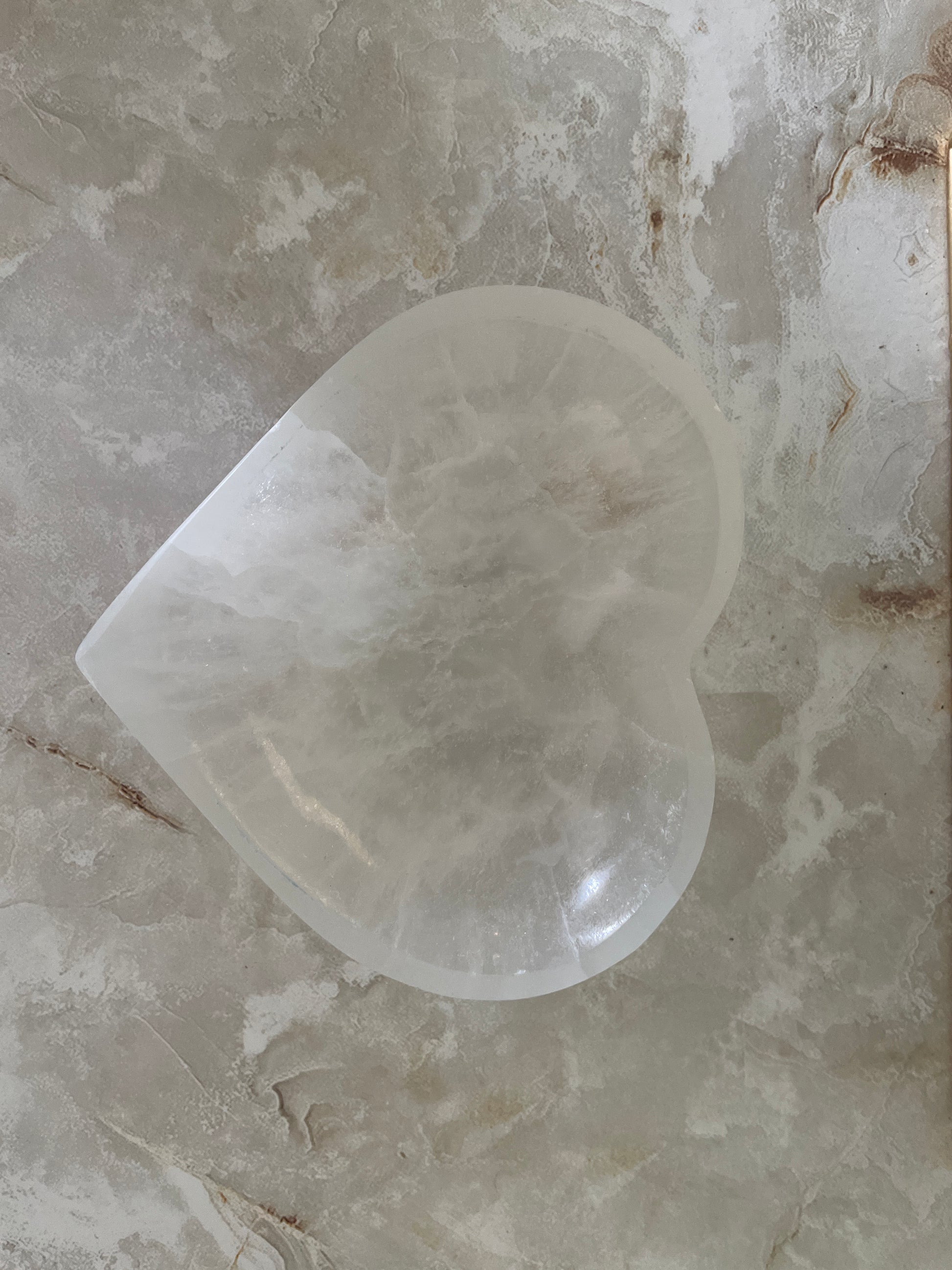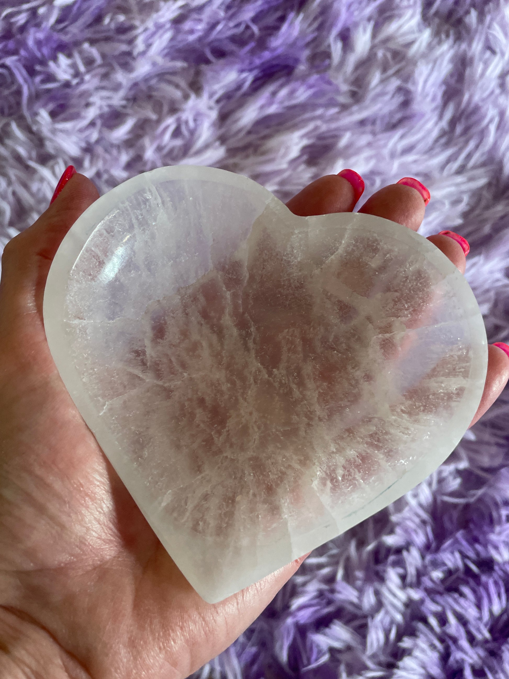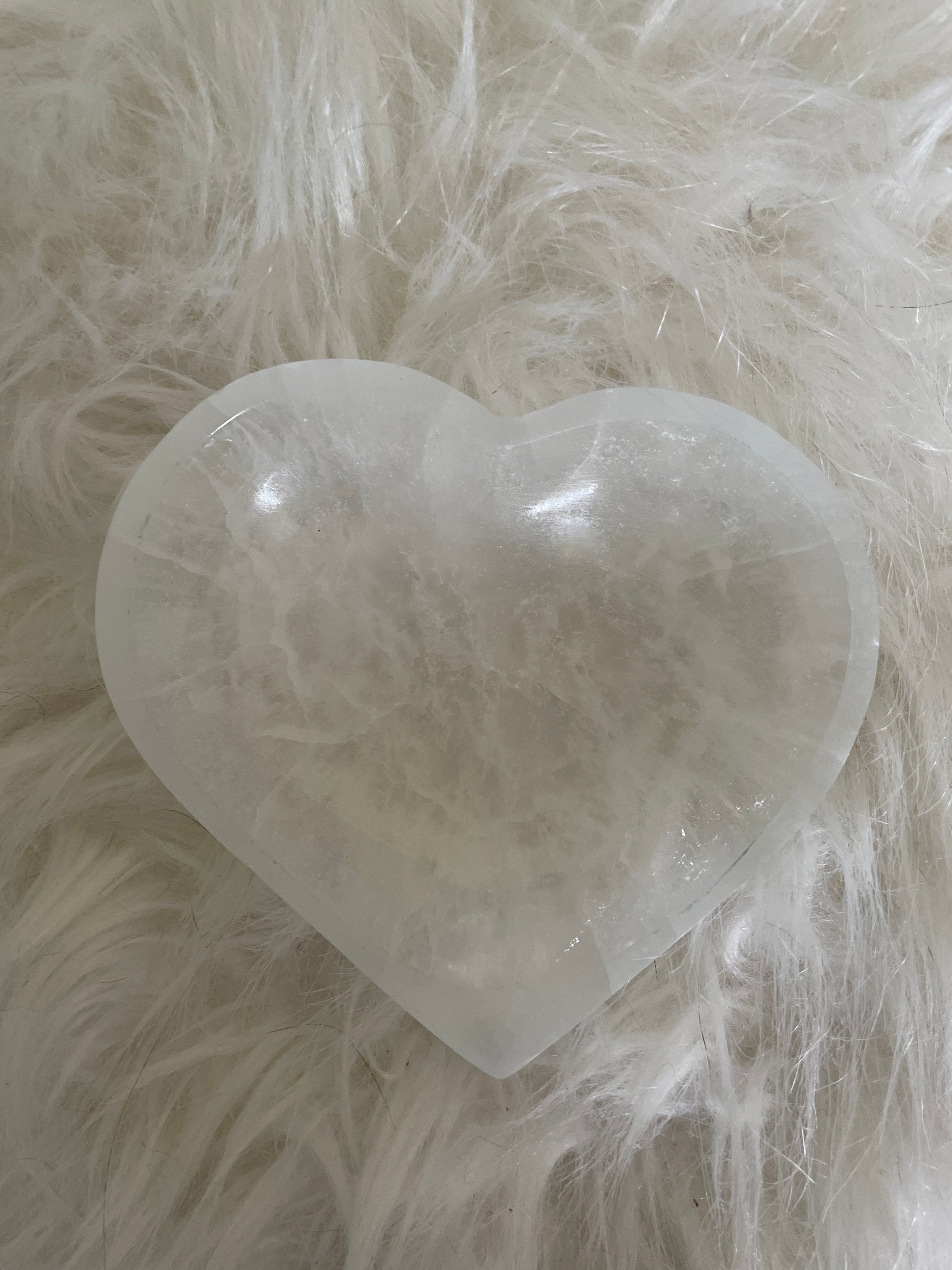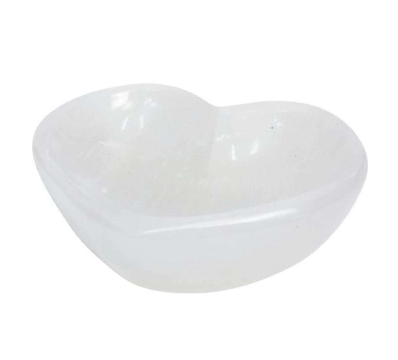 Heart shaped selenite bowl measures approximately 5” x 4”, but size may vary slightly. Selenite is a powerful cleansing tool for your home or office, and will continually purify and protect the energy of your environment. It is believed by energy healers that Selenite can help reverse the harmful effects of free radicals in the environment and has the ability to heal and regenerate on the cellular level. Selenite is often used to remove energy blocks or stagnant forces from the etheric body. Its high vibrations cleanse the aura and activate the higher chakras. It can also be a helpful tool for those who wish to strengthen their mental abilities. Selenite opens the higher chakras, helps us to connect with our Higher Self, while bringing feelings of tranquility and peace. Selenite can be used to activate and clear the higher chakras, which is why our Selenite are excellent tools for many spiritual practices. Selenite can help you reconnect with your spirit guides and guardian angels, opening you to receive direction and protection from higher realms. It is one of the few crystals in the mineral kingdom that can be used to cleanse and recharge other stones, without needing charging itself, making it a must-have for crystal lovers. Selenite is an excellent tool for spiritual healing sessions, while also making a beautiful decorative piece that will bring the radiant beauty of the Moon to your home!