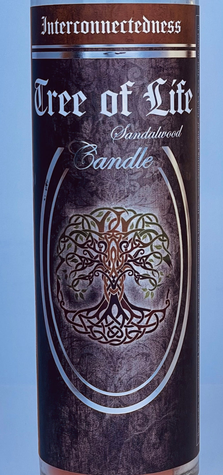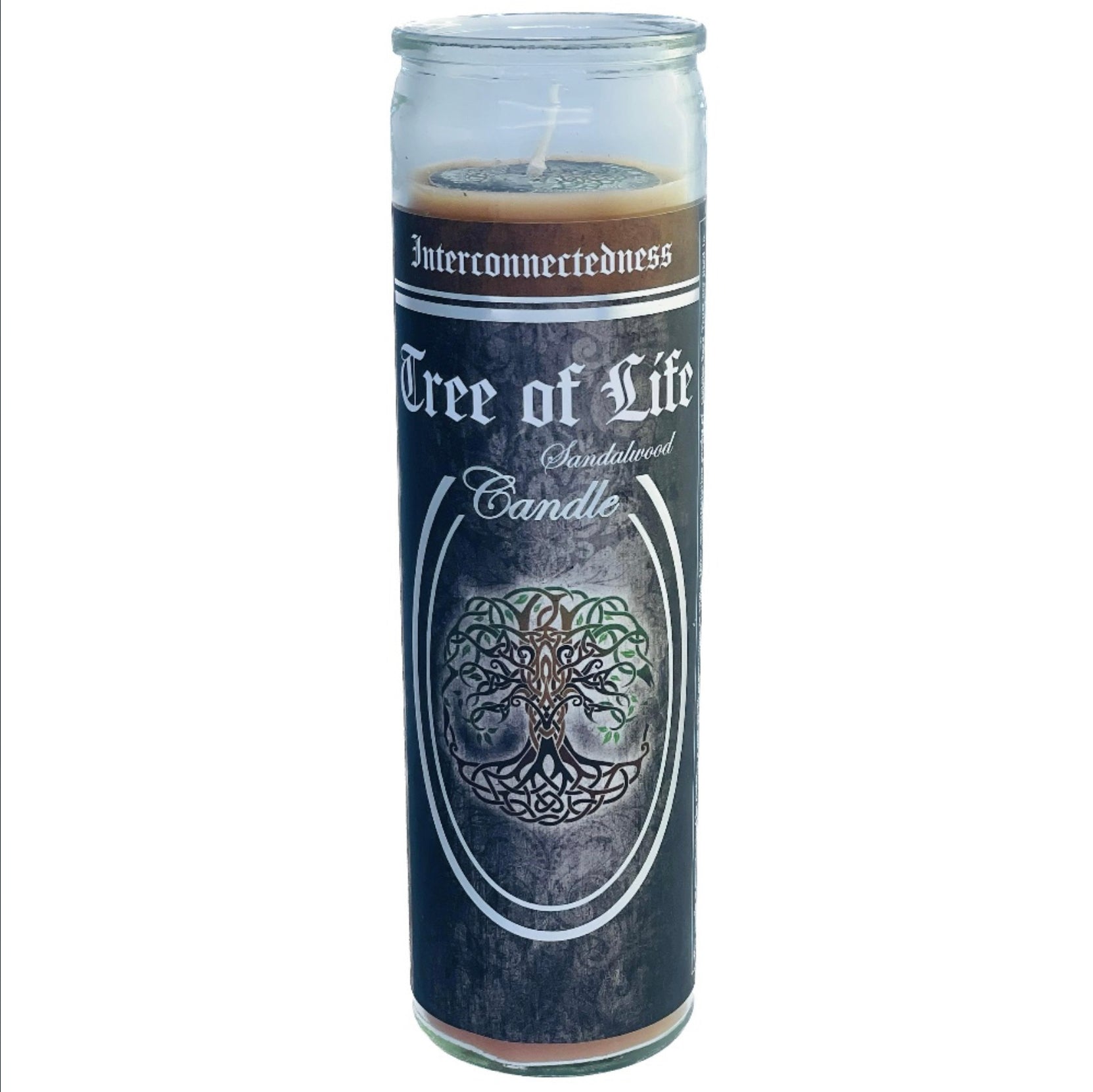 Meditate on the Interconnectedness with Sandalwood scented Tree of Life 7 Day Glass Ritual Candle.