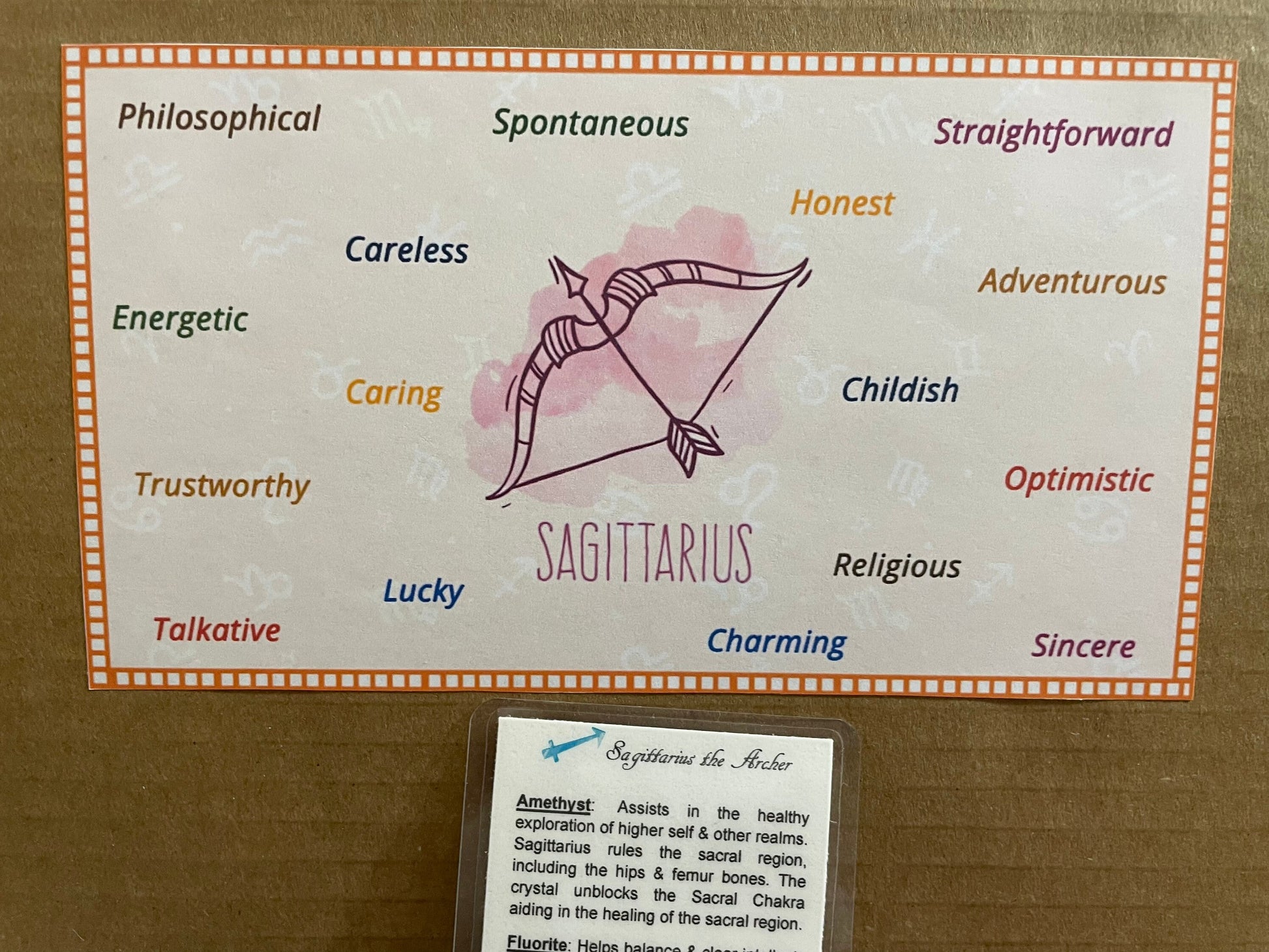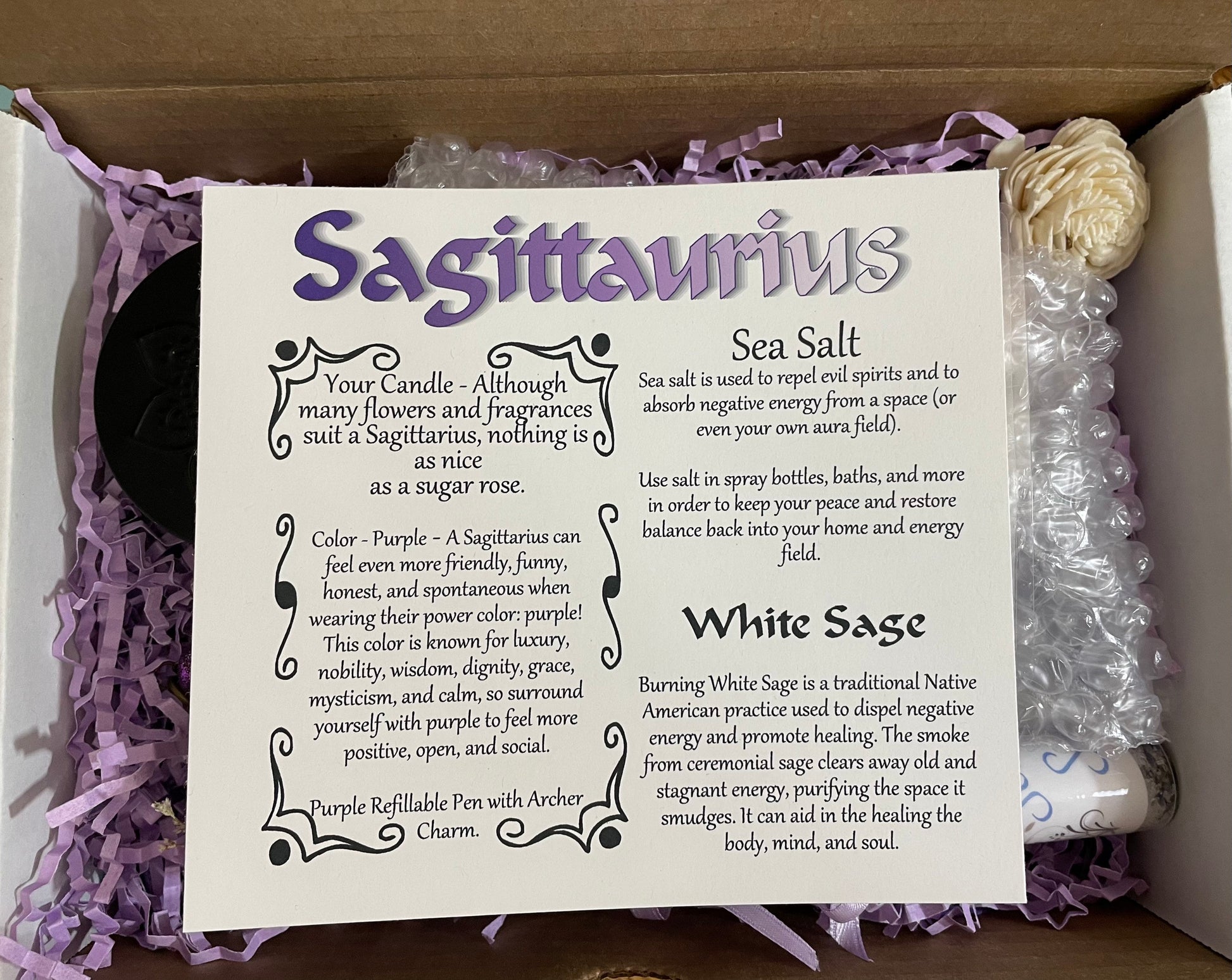 Gift or keep this 11 piece set designed especially for the Archer. Included in this set: Sugared Rose candle White Sage smudging stick Refillable purple pen with Archer charm Lavender Sea salt Small Sagittarius poster Sagittarius Stones Set includes: Amethyst - jumbo tumbled Fluorite - jumbo raw Lapis Lazuli - worry stone Pink Opal - 3” point obelisk Smoky Quartz - jumbo raw Sunstone- large tumbled Information Card of each crystals property in alignment to Sagittarius.