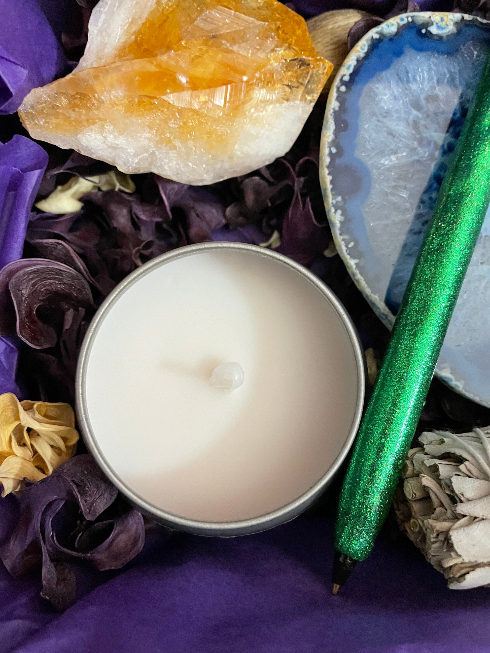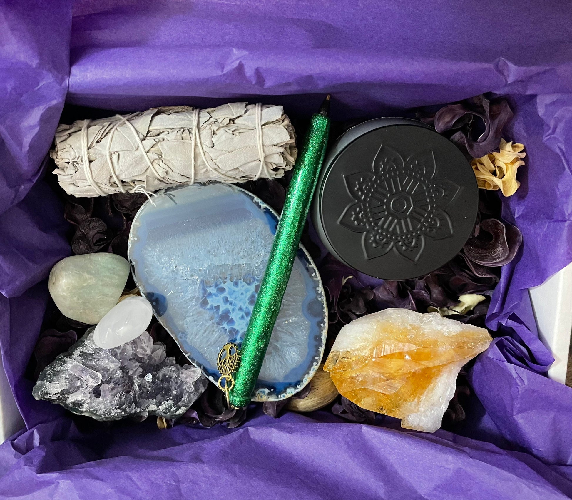 This Deluxe Resilience gift box will help us heal through these stressful and difficult times. Life has become hard and we need to treat ourselves and our loved ones well. Resilience is the key to make it through a difficult time. Please look at each picture because this is the box that you will receive. Include it in this box is a Citrine a Point, Amethyst cluster, Clear Quartz heart, Blue Agate slice, Jumbo Amazonite tumble, a Sugar Rose candle, White Sage smudging, dried roses, a green refillable ink pen with a Tree of Life charm and a card explaining how each items properties will benefit us. Your order is packed in a 9”x6” white box that will wrap nicely for gift giving.
