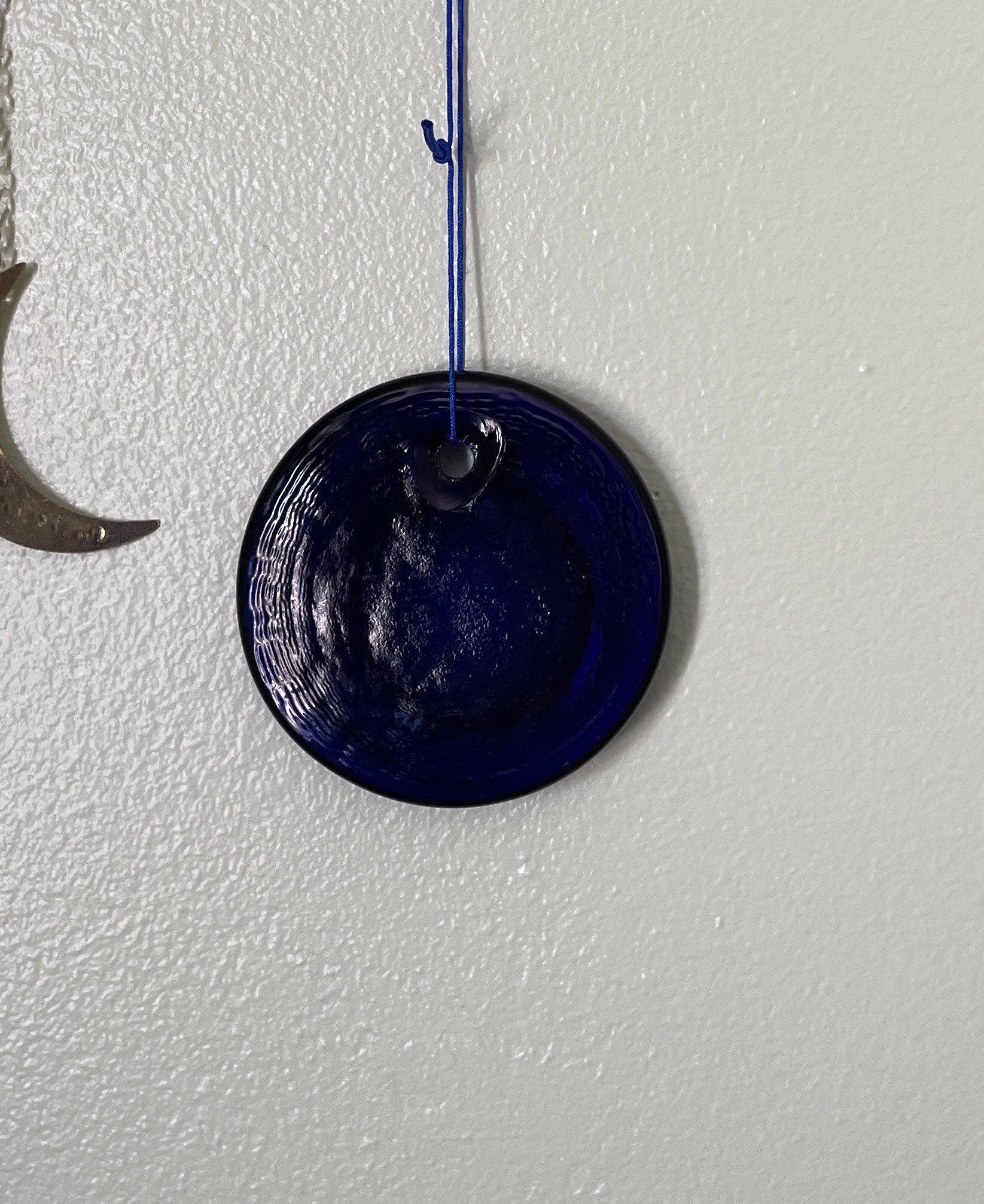 This evil eye amulet protects against bad luck, spells, and jealousy. It turns bad thoughts back on the person sending the thoughts. Protects against evil doers. It is 3 1/2 inches in diameter and hangs at about 7 inches total. It weighs approximately 5.5 ounces.