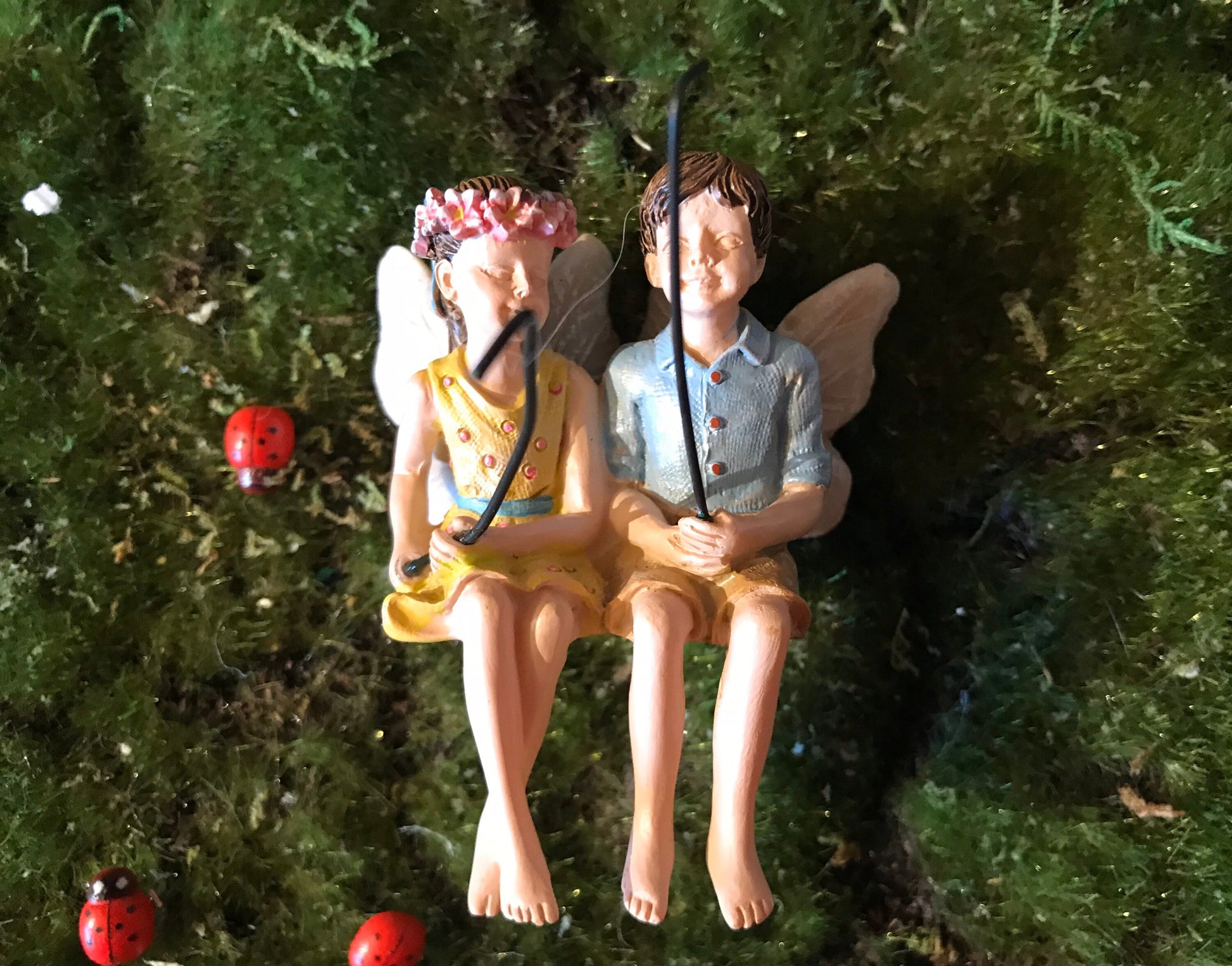Boy & girl fairies are happy to hang out fishing by a beautiful little garden pond while they enjoy some sunshine!