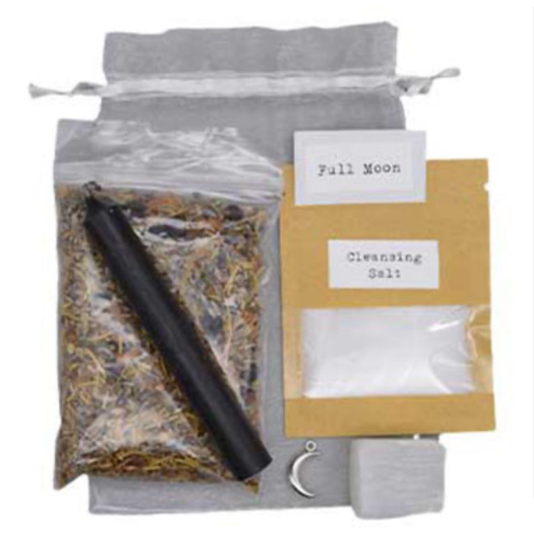 A pouch filled with supplies for your next Full Moon ritual. The Full Moon is the perfect time of the month to clean and clear your physical space, as well as letting go and releases anything that is not serving your highest good. Here is the perfect kit to help you create your own unique Full Moon ritual. Kit comes with a releasing herbal spell mix, a black candle, cleansing salt, a piece of selenite, 3 pieces of parchment to write your intentions, and a moon charm that may vary. Herbal mix can be used, as a smudge to burn, to dress included candle using your favorite oil, or pour herb mix and salts into the pouch and soak it in a Full Moon ritual bath.