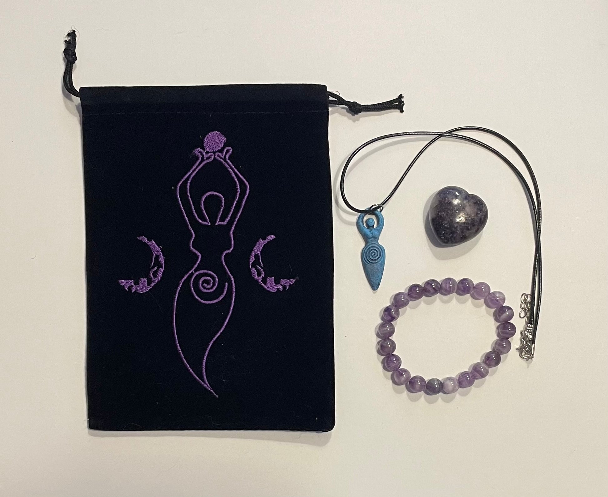 Enjoy these beautiful items from one of our Goddess Collections. This collection includes one each: Velvet Goddess pouch, Goddess necklace, Amethyst bracelet and a pretty crystal heart! This makes a perfect gift for the Goddess in your life!