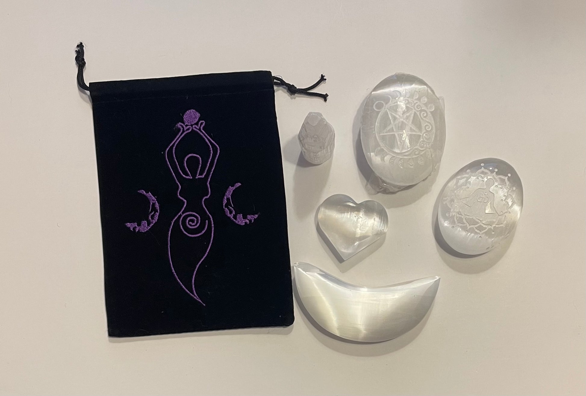 Enjoy these beautiful items from one of our Goddess Collections. This collection includes one each: Velvet pouch, Selenite palm stone, heart, moon and tower. This makes a perfect gift for the Goddess in your life!