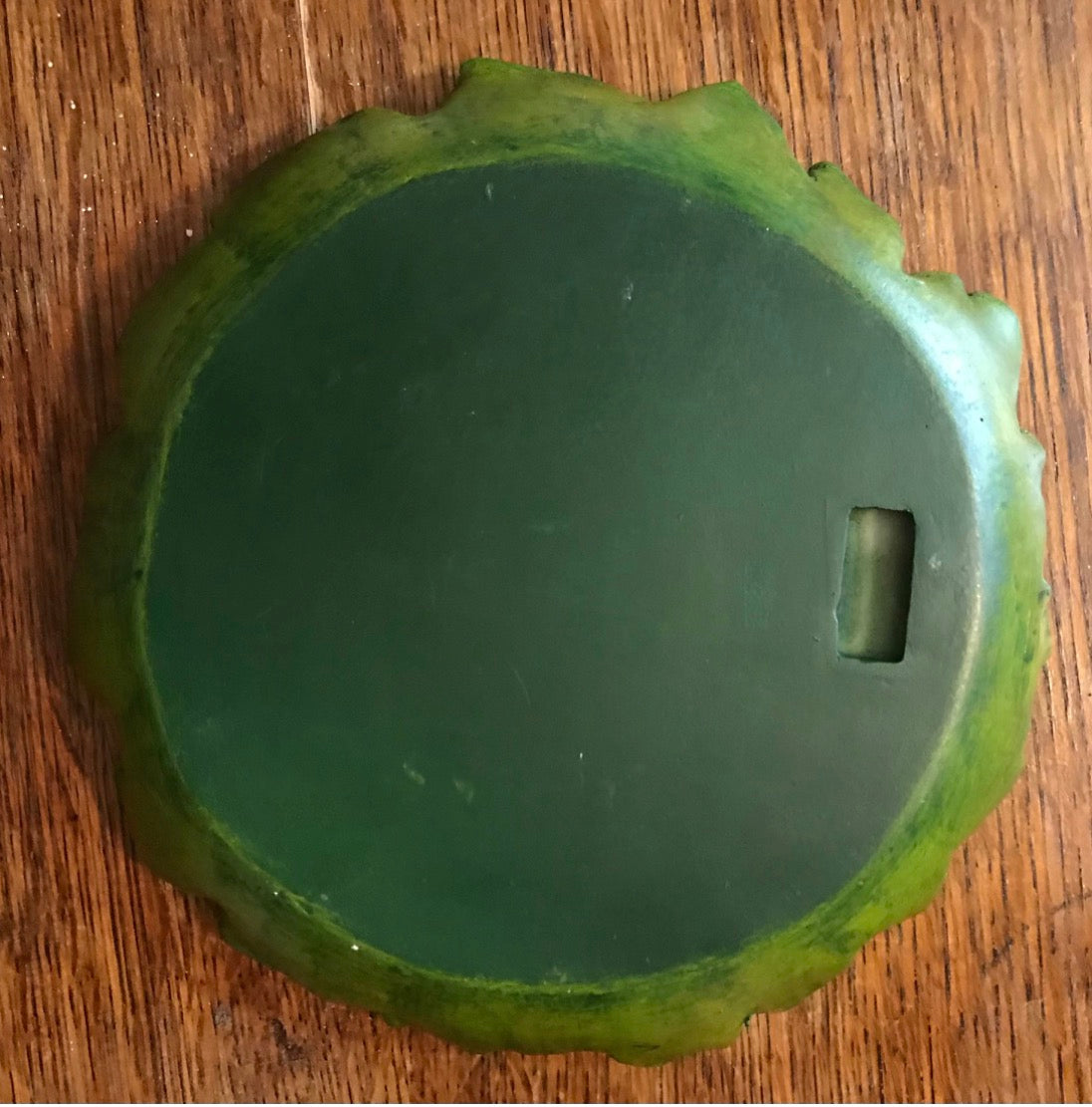 This large fig green man plaque measures 7 1/2 inches in diameter.