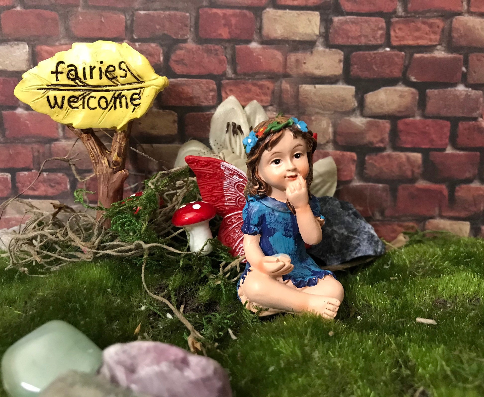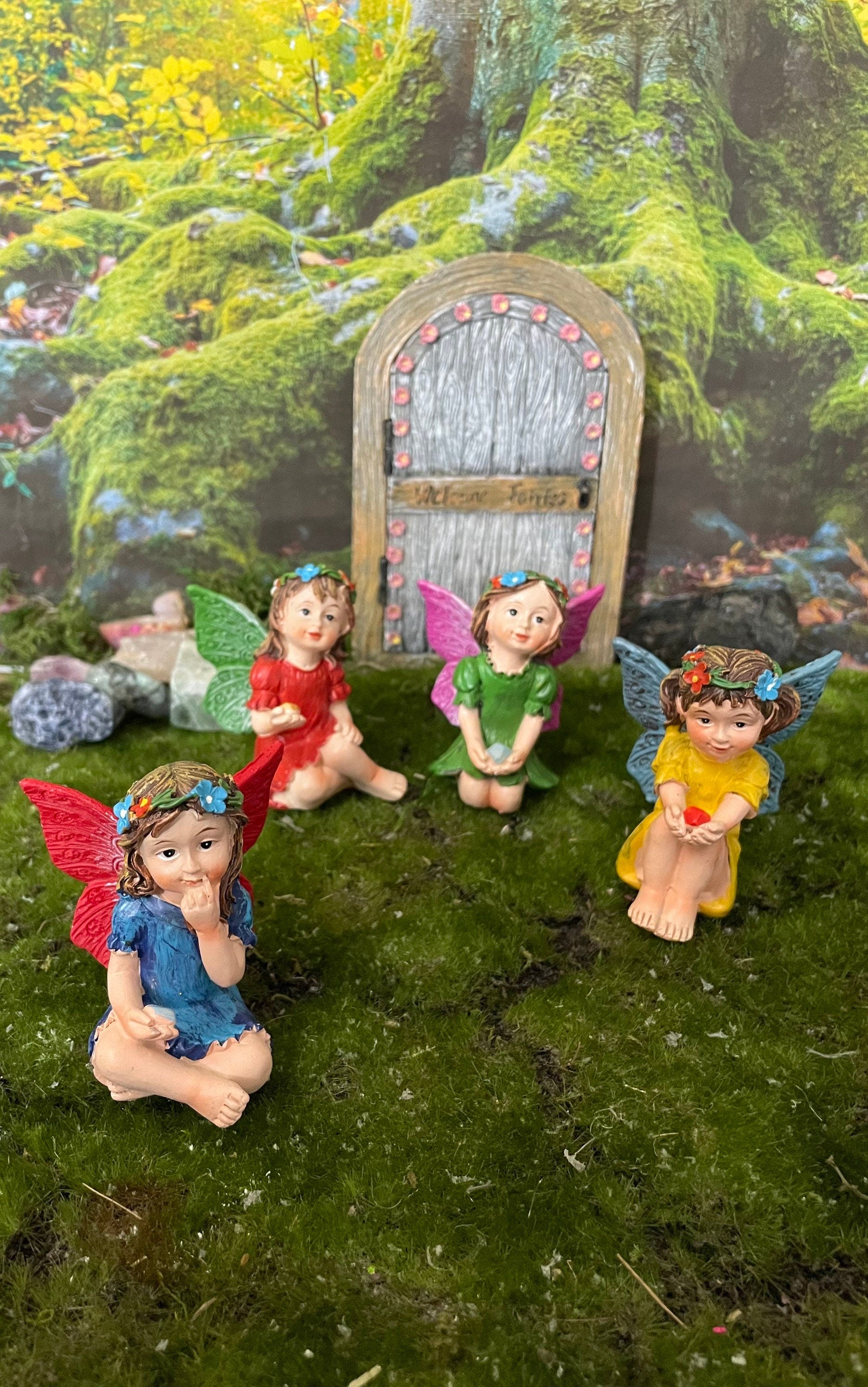 Fill fairy gardens with this adorable set of 4 miniature fairy figurines. Each fairy is wearing a flower crown and designed in a seated position that's perfect for staging scenes in your garden. These fairies are also holding gem-like stones to complete their magical appearance.